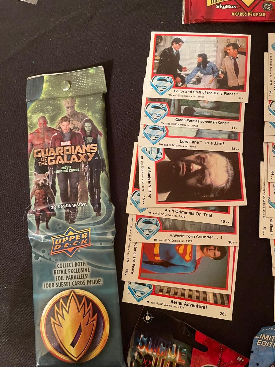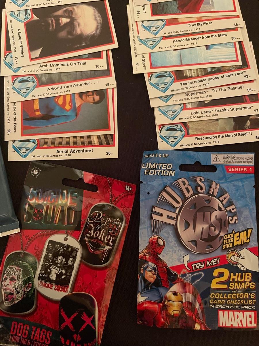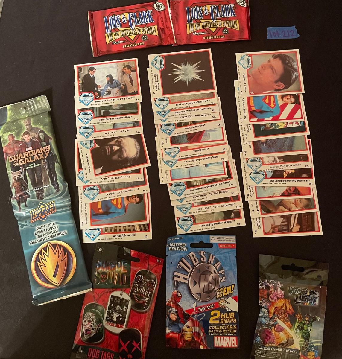 Marvel Guardians of the Galaxy, (2) Lois & Clark The Adv. Of Superman, (1) Suicide Squad dog tags, (1) Marvel hubsnaps, TM's 1978 DC comic superman collector's cards, 1 war of light dice masters