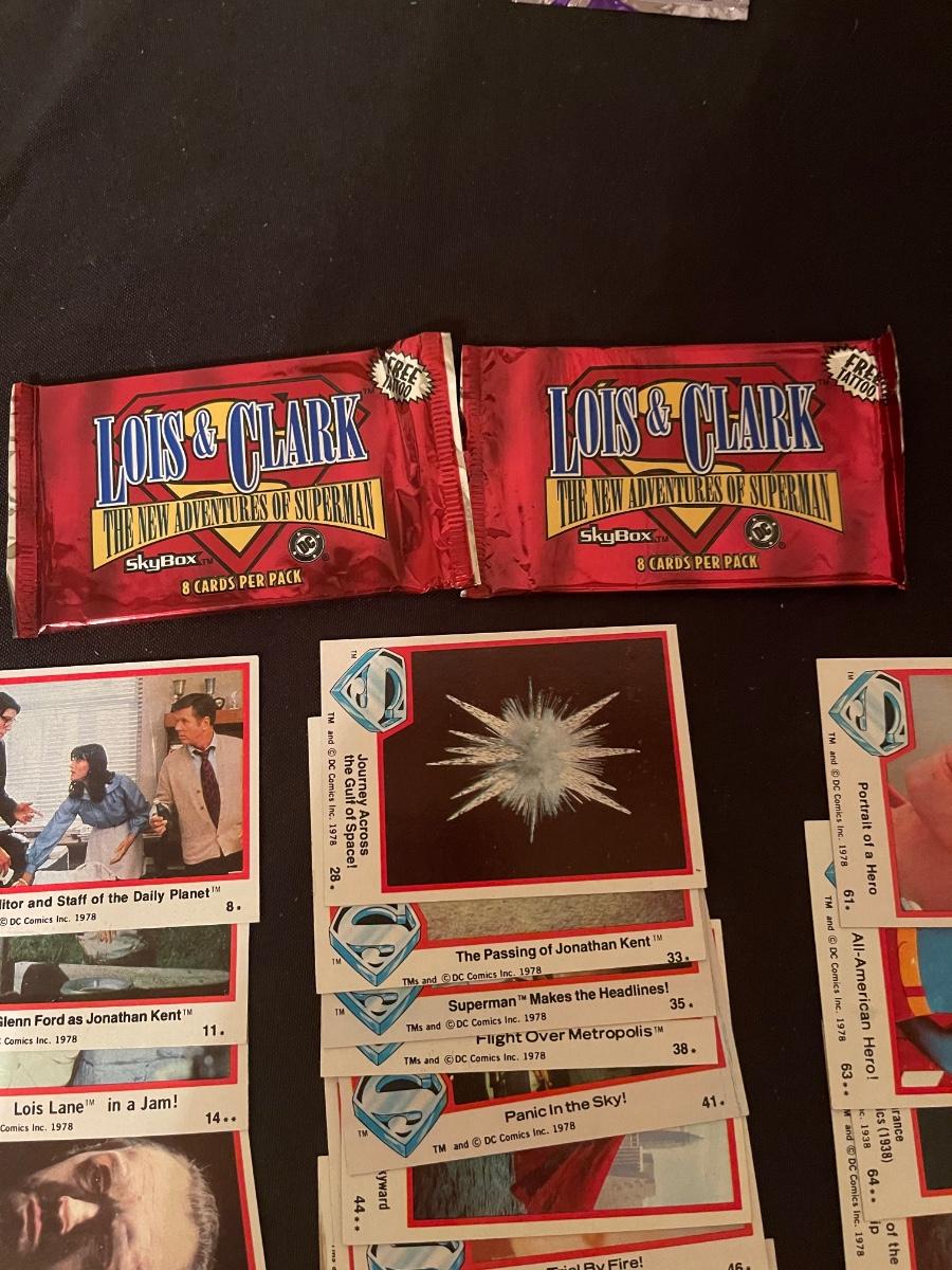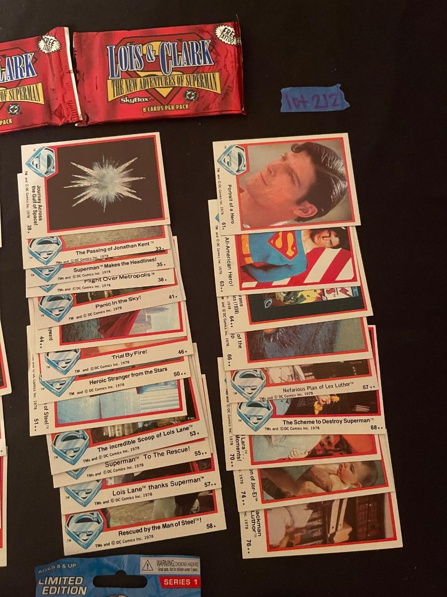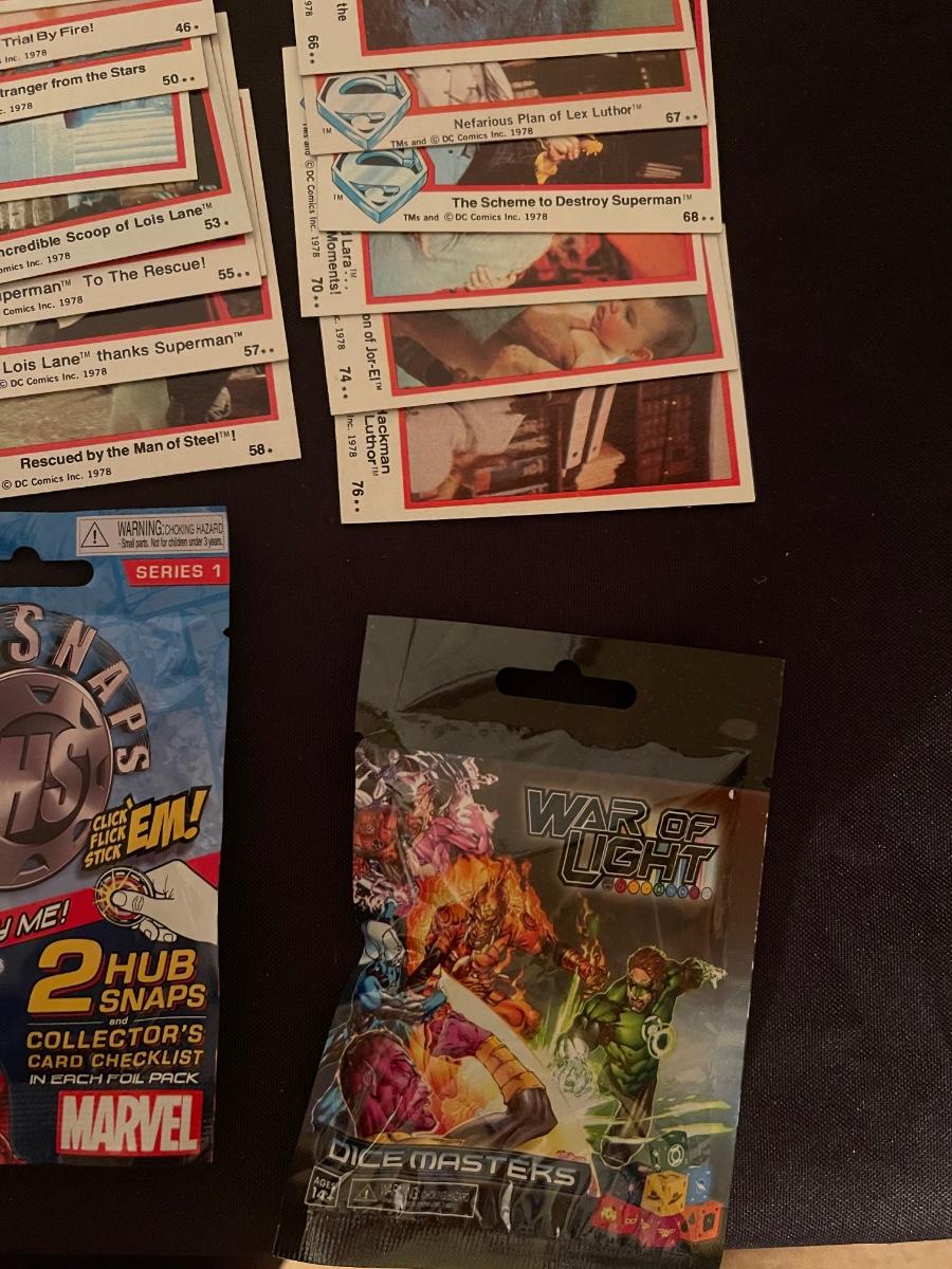 Marvel Guardians of the Galaxy, (2) Lois & Clark The Adv. Of Superman, (1) Suicide Squad dog tags, (1) Marvel hubsnaps, TM's 1978 DC comic superman collector's cards, 1 war of light dice masters