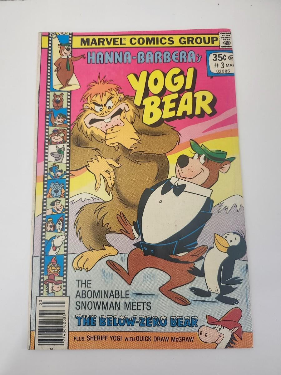Marvel Comics Group Hanna-Barbera’s Yogi Bear issue #3, 35¢ cover price. Features the story “The Abominable Snowman Meets The Below-Zero Bear” with bonus Sheriff Yogi and Quick Draw McGraw content. Bright cover colors with light edge and spine wear visible from age. Pages intact and comic lies flat. Not graded and not removed from protective sleeve for page evaluation. Ideal for Yogi Bear fans, Marvel/Hanna-Barbera collectors, and vintage cartoon comic enthusiasts.