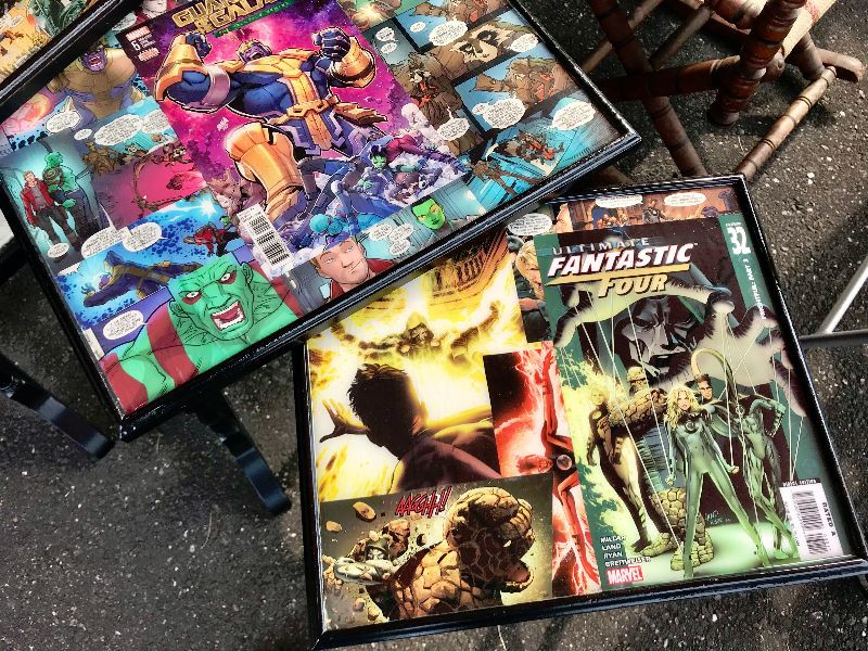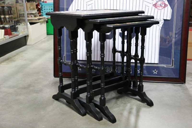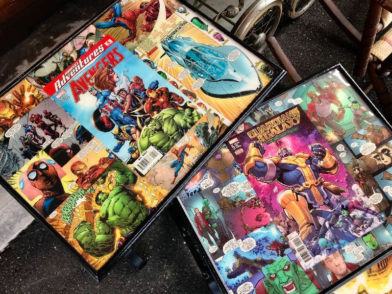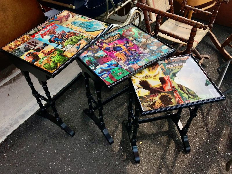 Set of three Marvel Nesting Tables. These tables are made of sturdy wood and tuck underneath each other for storage when not in use. Real comic book artwork is bonded to each table and coated with a clear epoxy to give the table tops a shiny glass like appearance. As seen in the pictures, the largest table features The Avengers, the medium table features The Guardians of the Galaxy, and the small table features The Fantastic Four. A cool item for any Marvel or comic fan! THIS ITEM IS OFFERED FOR A LOCAL PICK UP AND GROUND SHIPPING IS ALSO AVAILABLE ON REQUEST - PLEASE EMAIL FOR SHIPPING QUOTES PRIOR BIDDING!