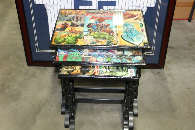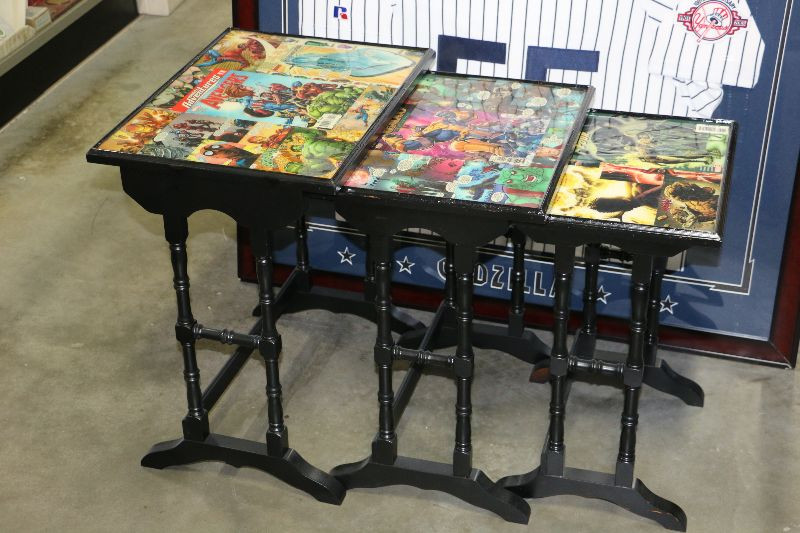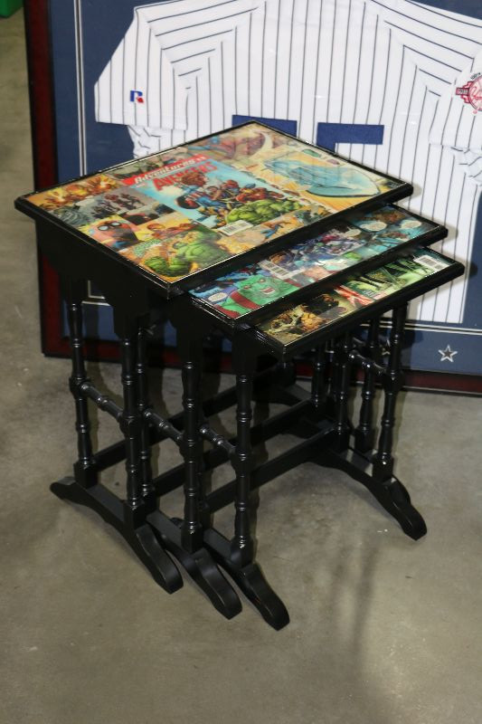 Set of three Marvel Nesting Tables. These tables are made of sturdy wood and tuck underneath each other for storage when not in use. Real comic book artwork is bonded to each table and coated with a clear epoxy to give the table tops a shiny glass like appearance. As seen in the pictures, the largest table features The Avengers, the medium table features The Guardians of the Galaxy, and the small table features The Fantastic Four. A cool item for any Marvel or comic fan! THIS ITEM IS OFFERED FOR A LOCAL PICK UP AND GROUND SHIPPING IS ALSO AVAILABLE ON REQUEST - PLEASE EMAIL FOR SHIPPING QUOTES PRIOR BIDDING!
