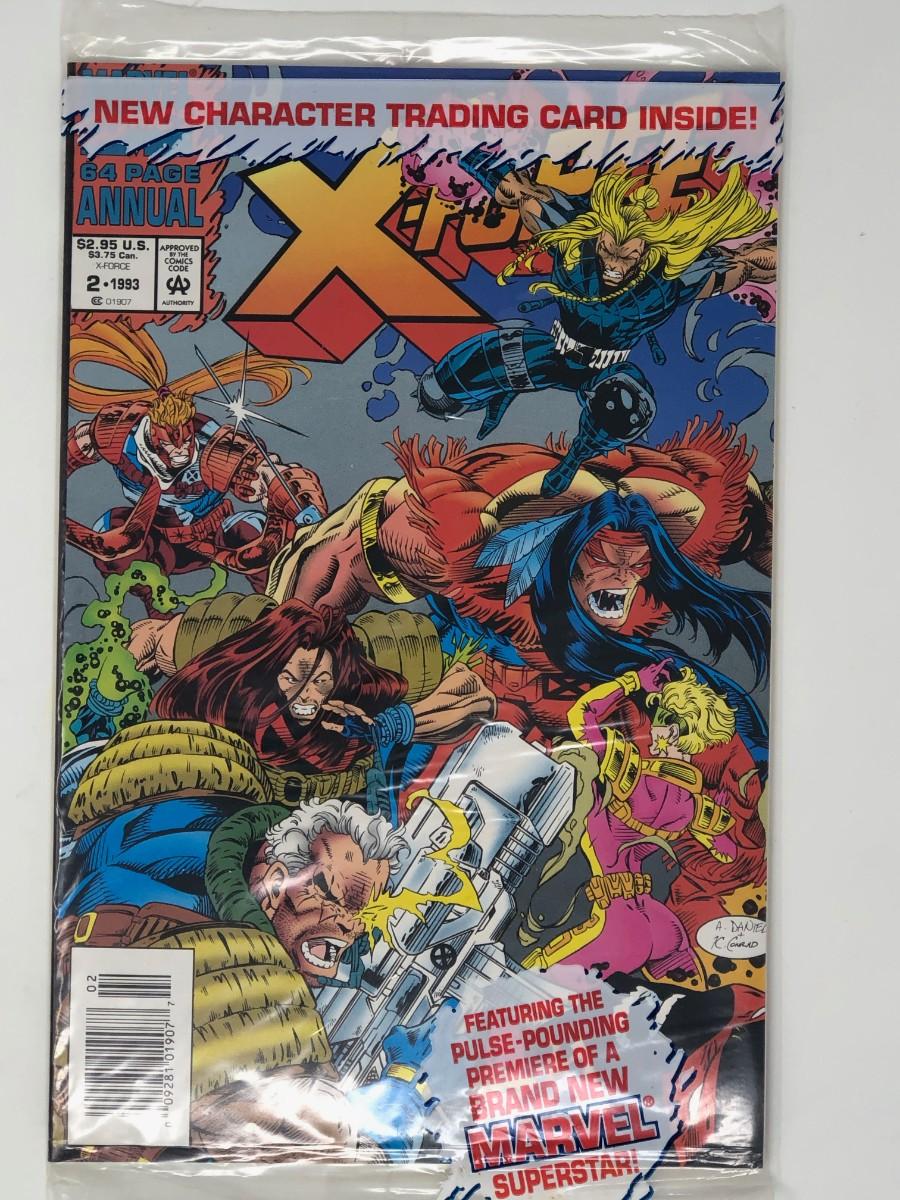 MARVEL, XFORCE 64 page annual no. 2, never opened poly bag new character trading card inside!;
