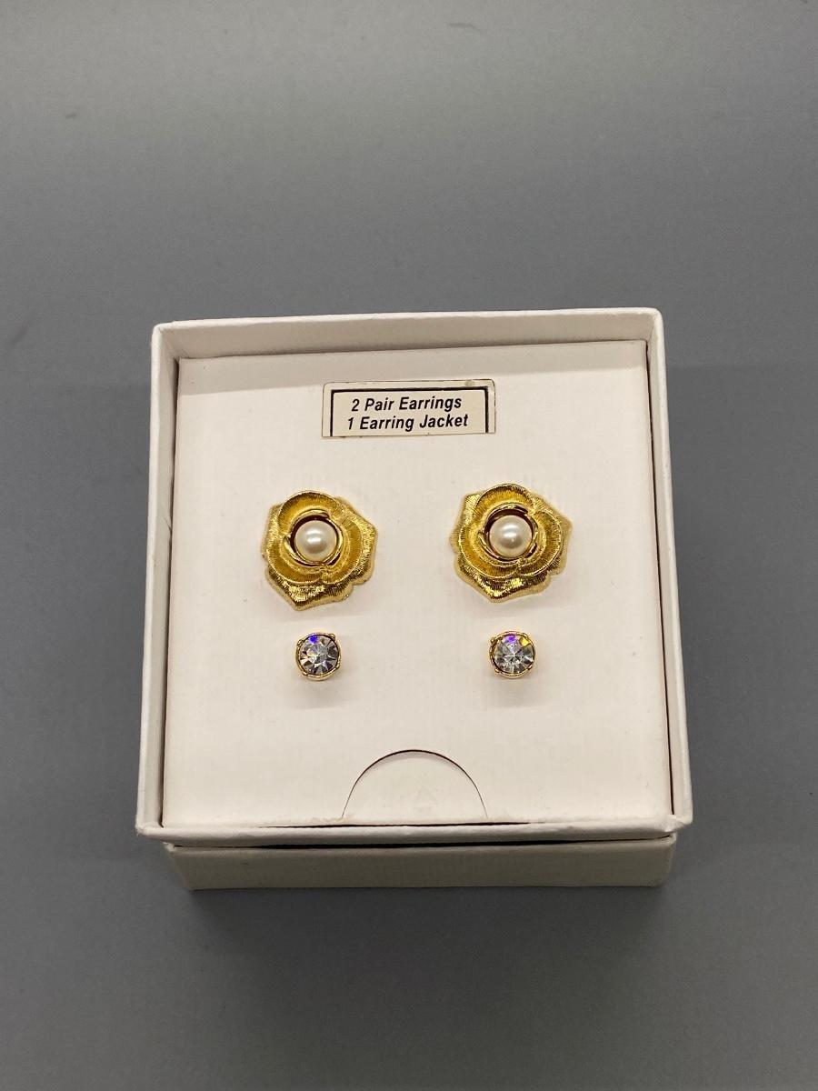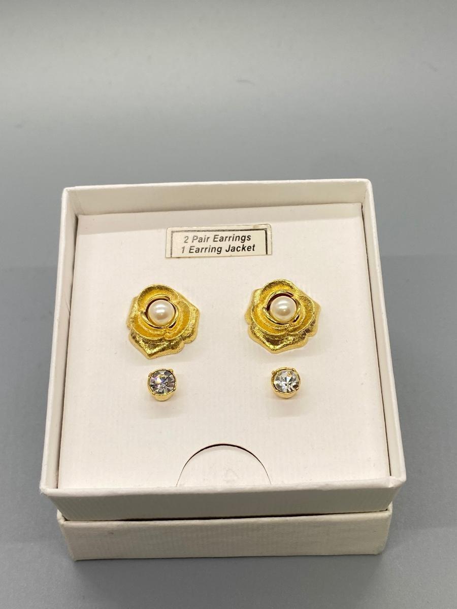 New in Box, Marvella gold tone earring set. Two pairs of stud earrings, one faux pearl, one rhinestone, and a floral earring jacket. Four looks possible. Good condition. For pierced ears.