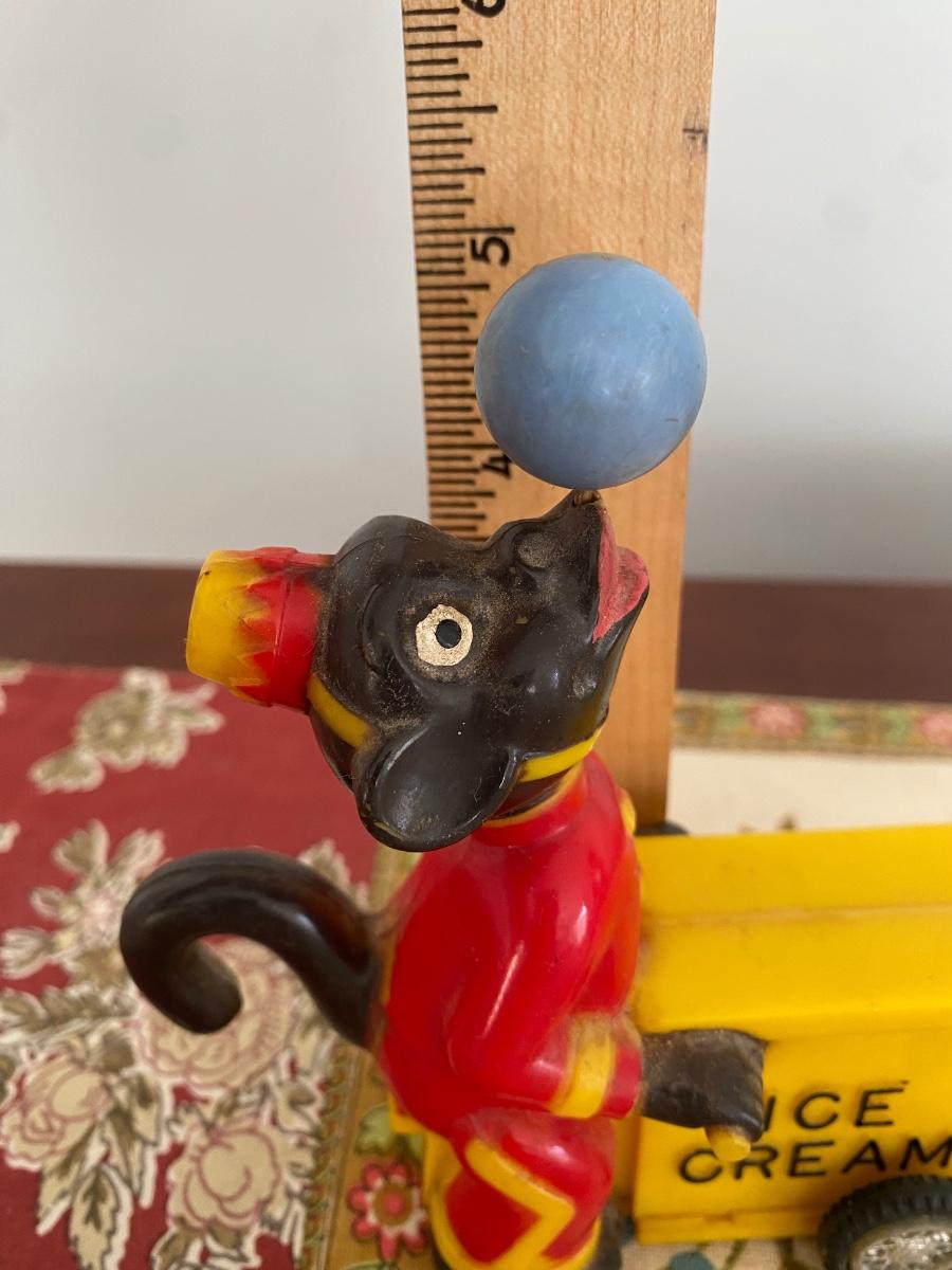 MARX ICE CREAM PEDDLER ACROBAT MONKEY FRICTION TOY, working condition. Needs alittle cleaning, but ball spins while toy speeds along. 5" H x4"L