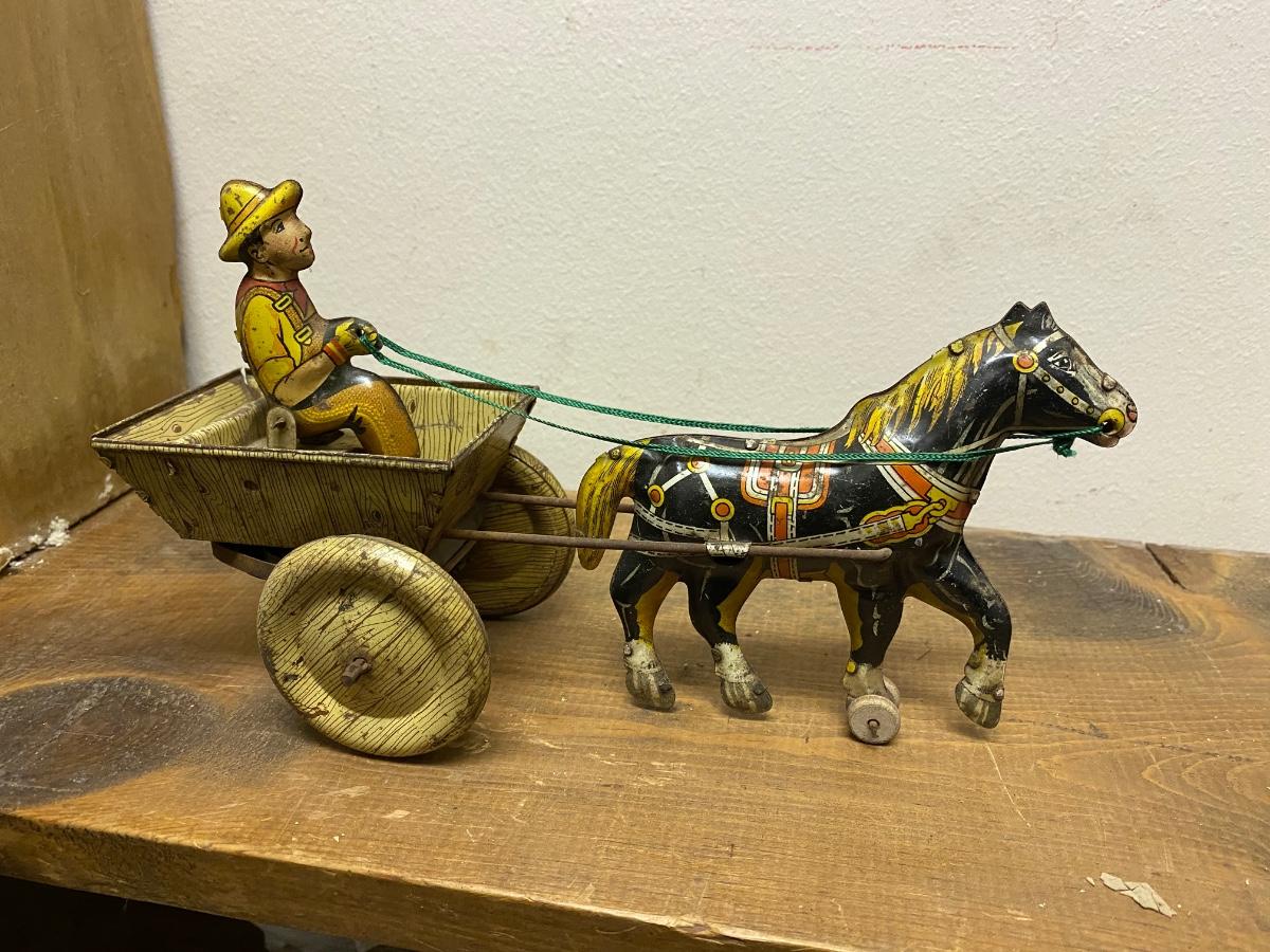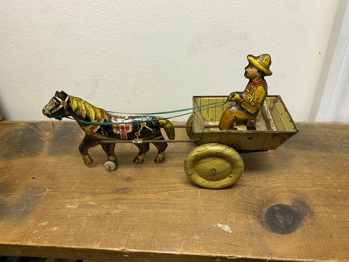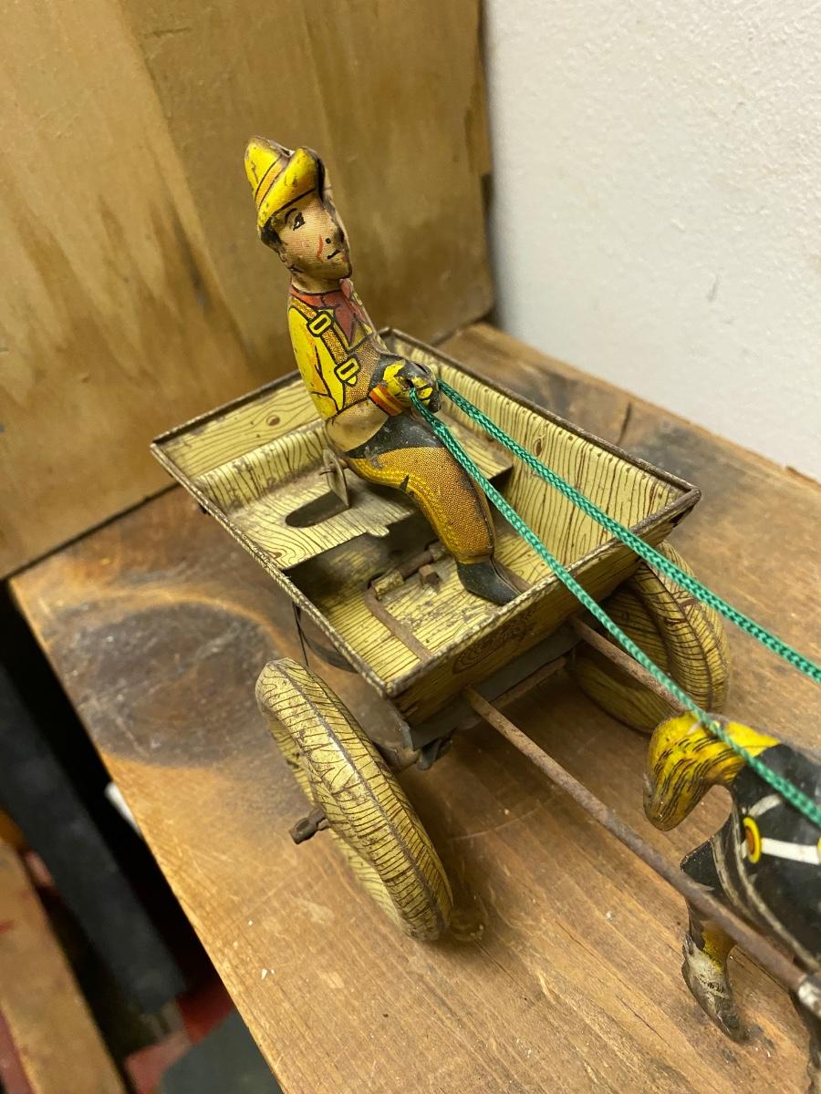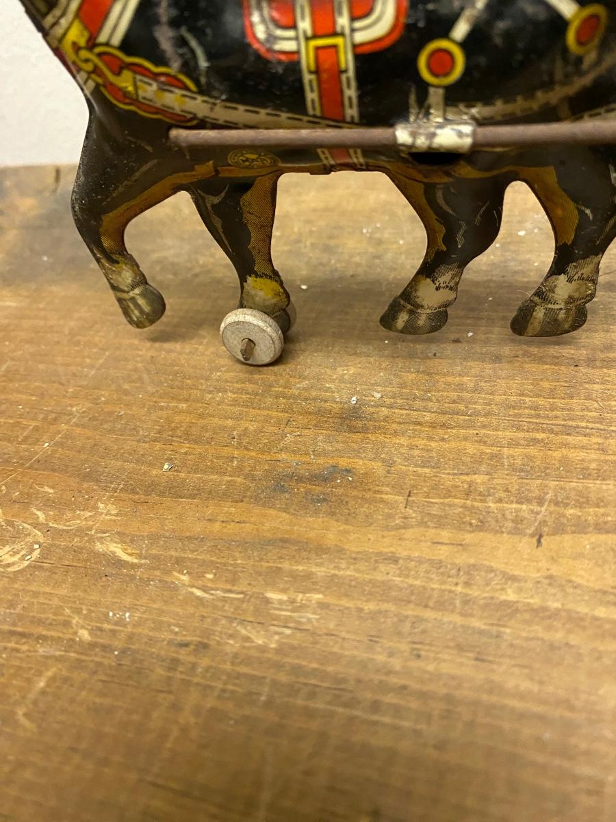 REMAINS IN GOOD CONDITION, SHOWING ONLY MINIMAL WEAR. WIND UP MECHANISM WORKS PARTIALLY,CAN WIND BUT MOVEMENT NEEDS TLC.8" long