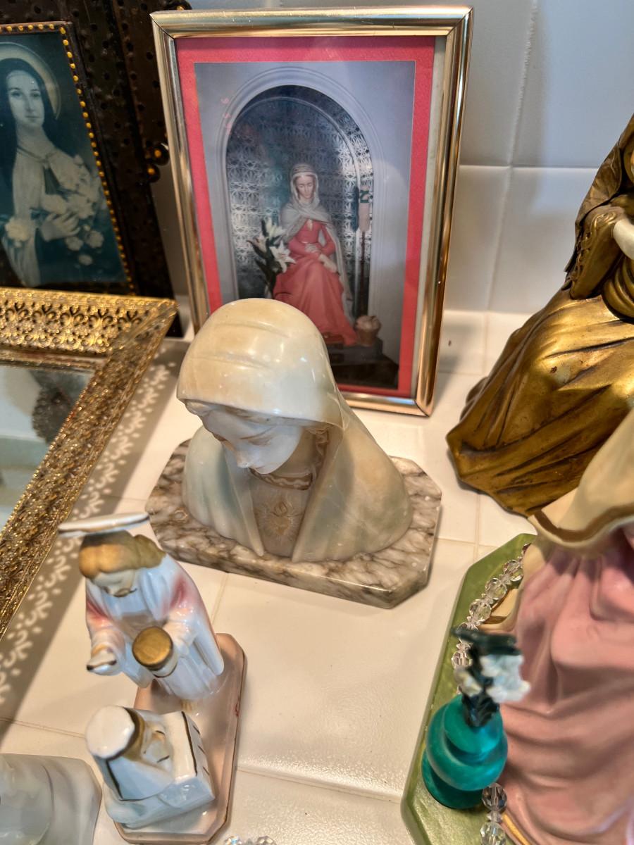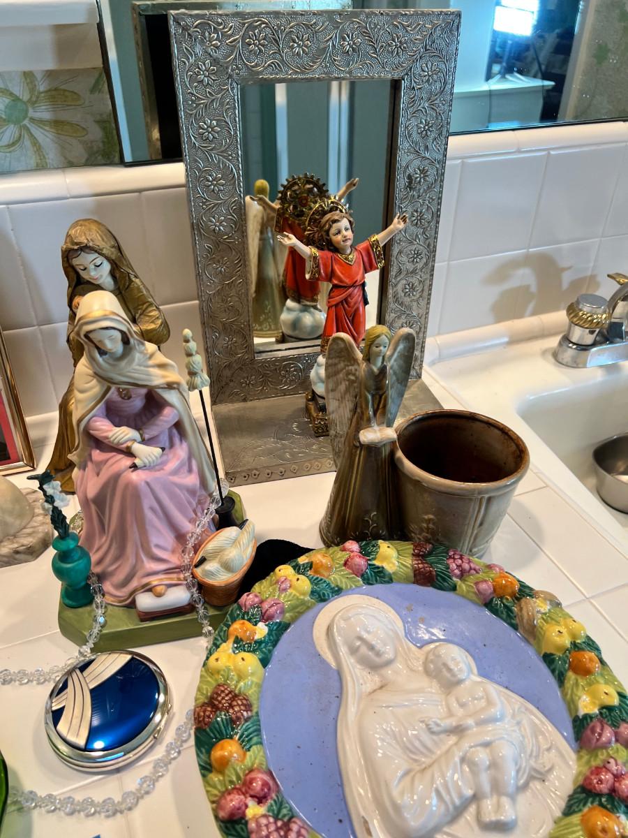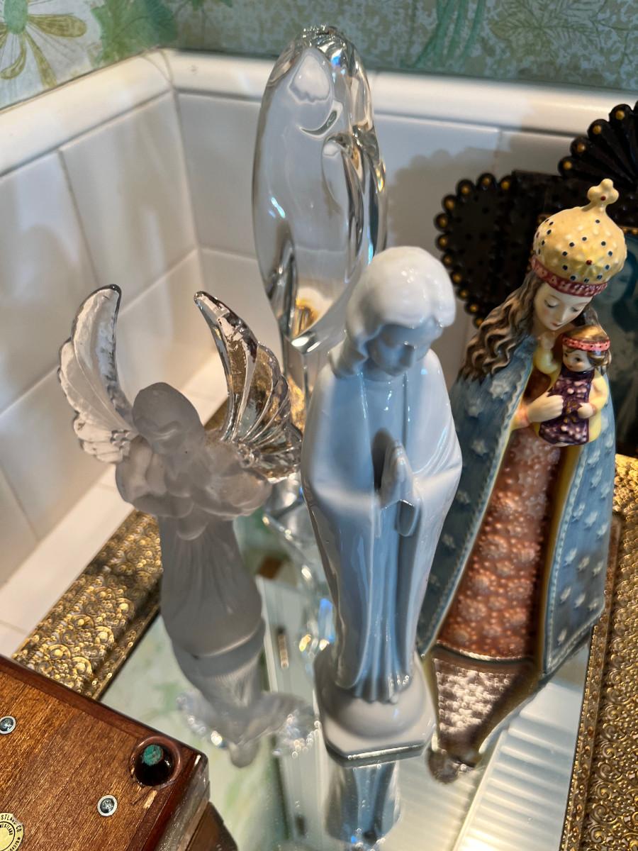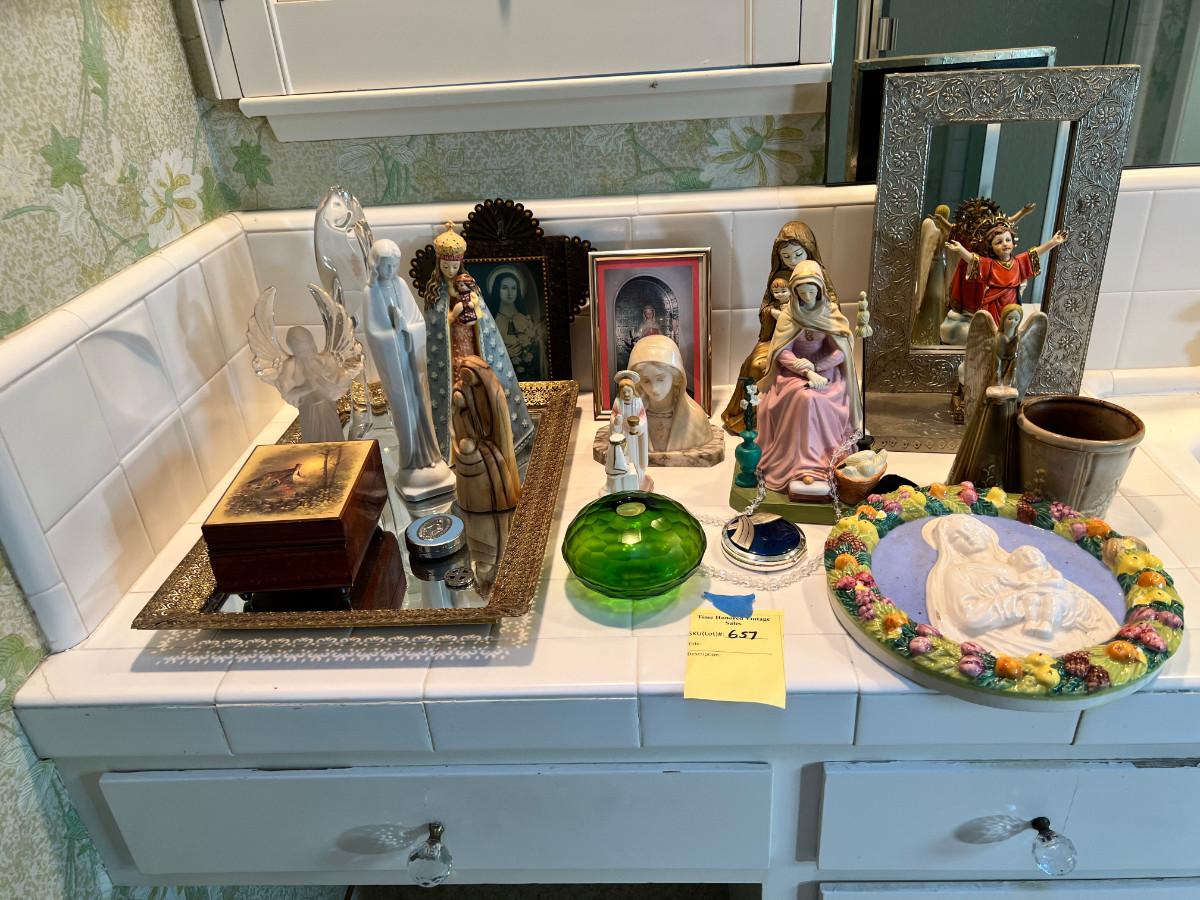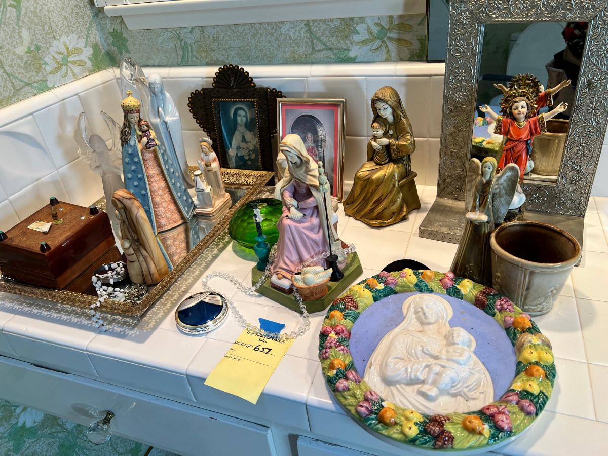 Many depictions of religious significance. Mary in many of her forms. Wonderful Jesus with a mirrored stand. Rosary and case, crystal bead necklace, Marble bust of Mary, 2 glass sculptures. Wall Plaque of Mary with child is ceramic and can be used outdoors. Wooden music box and green glass vase.