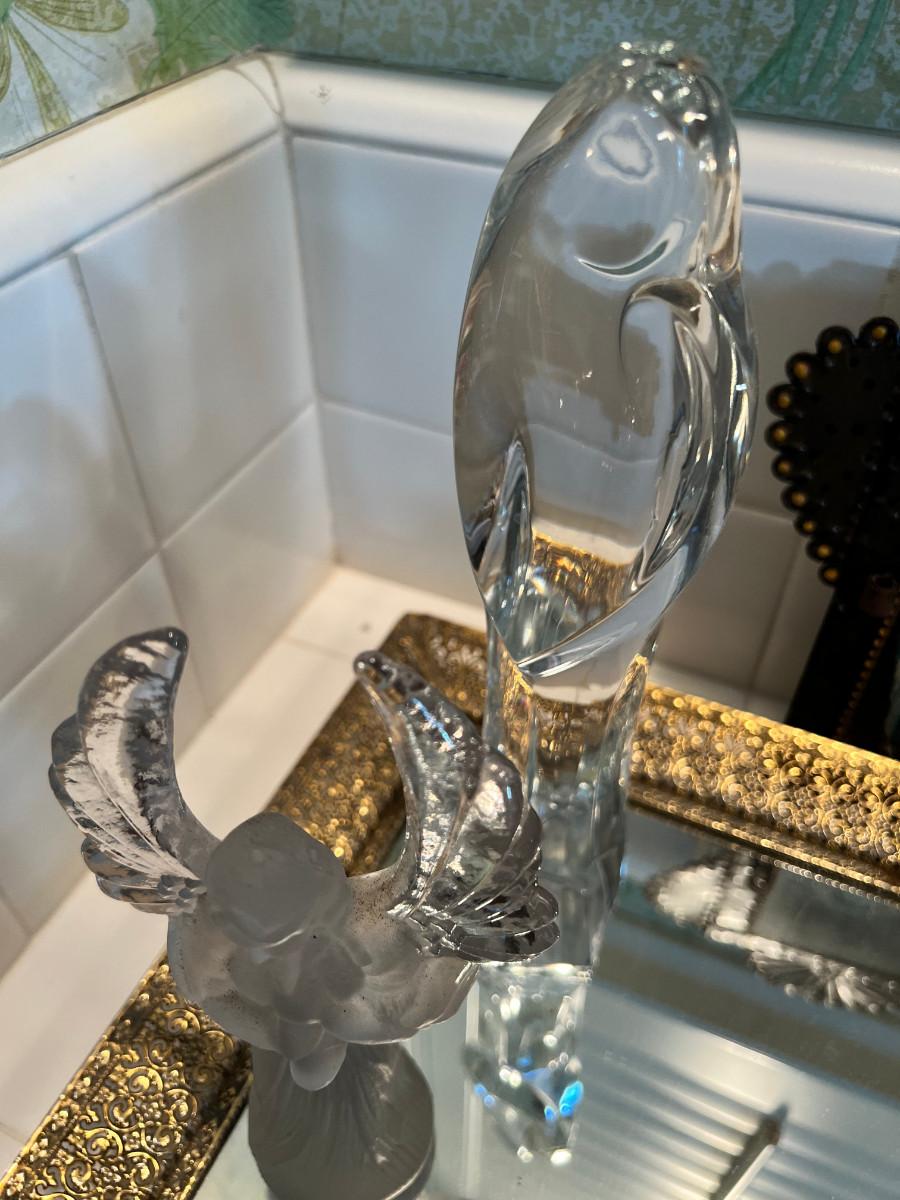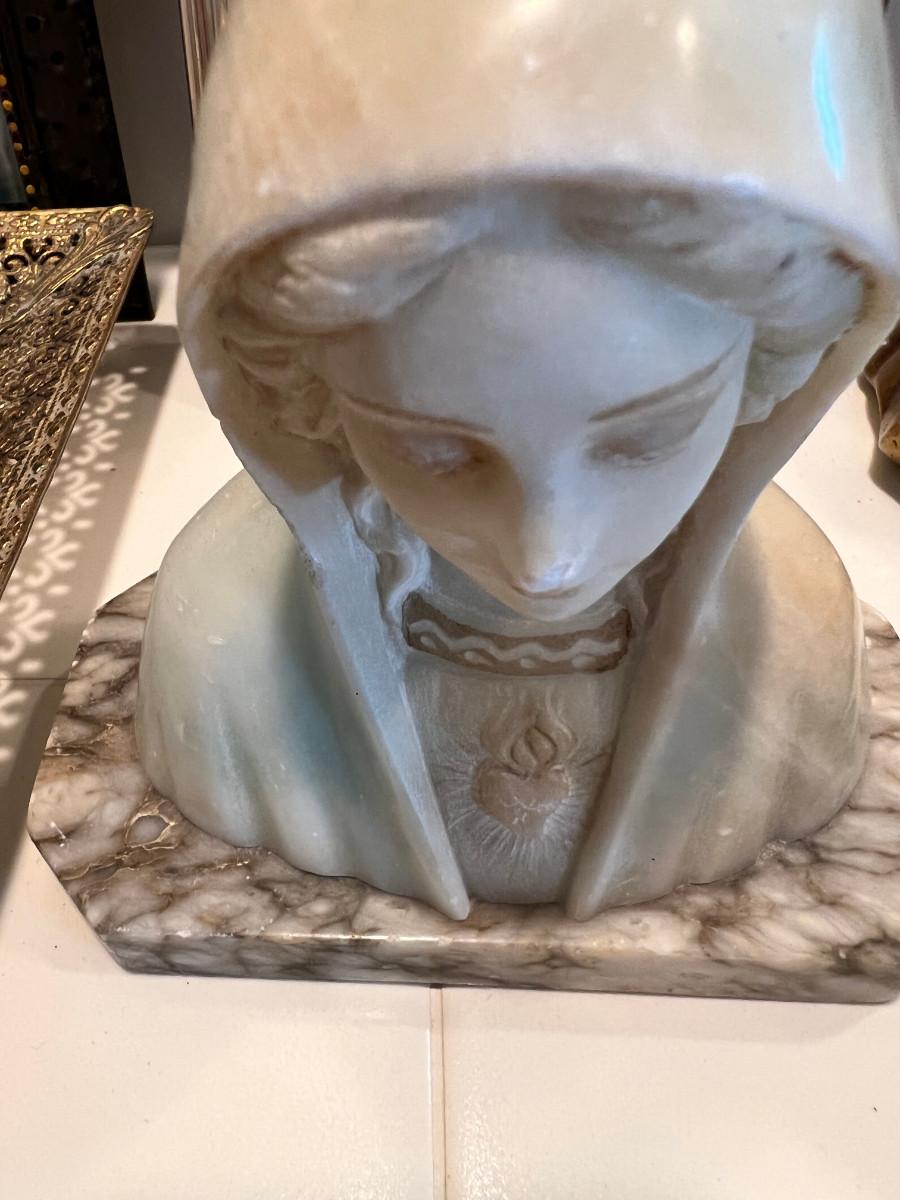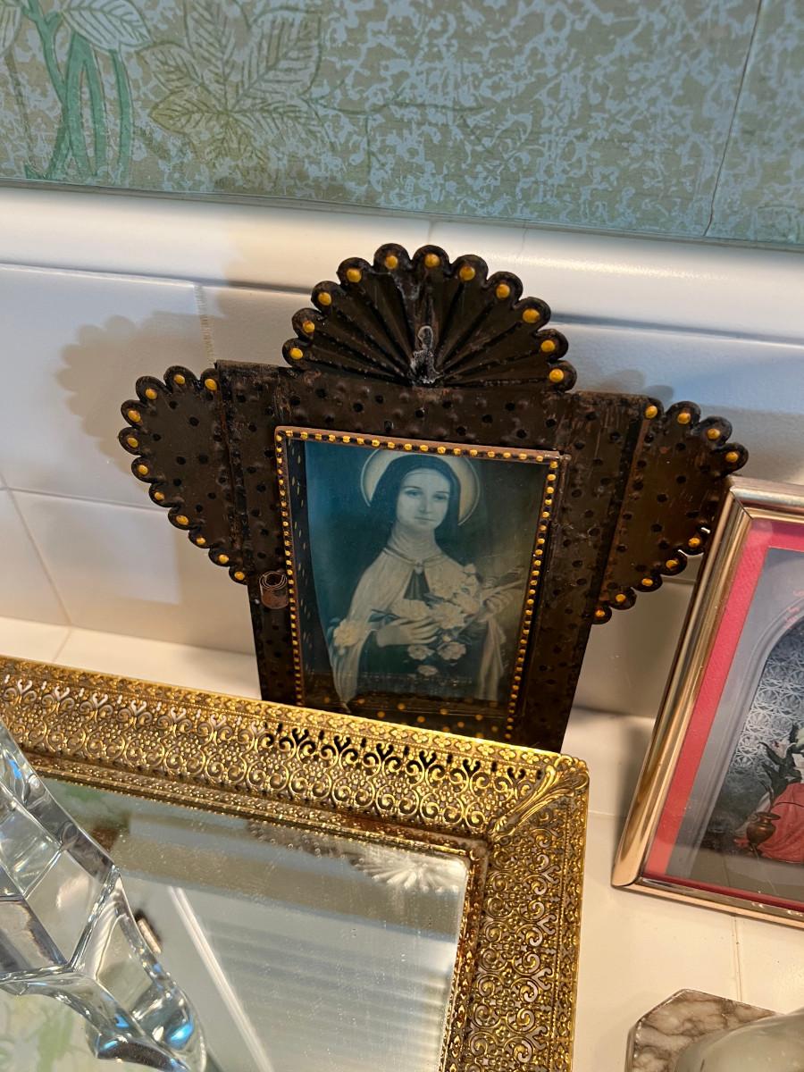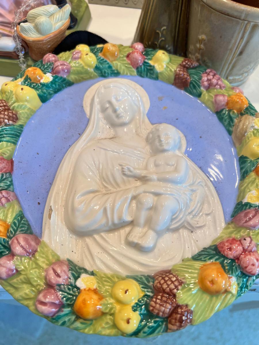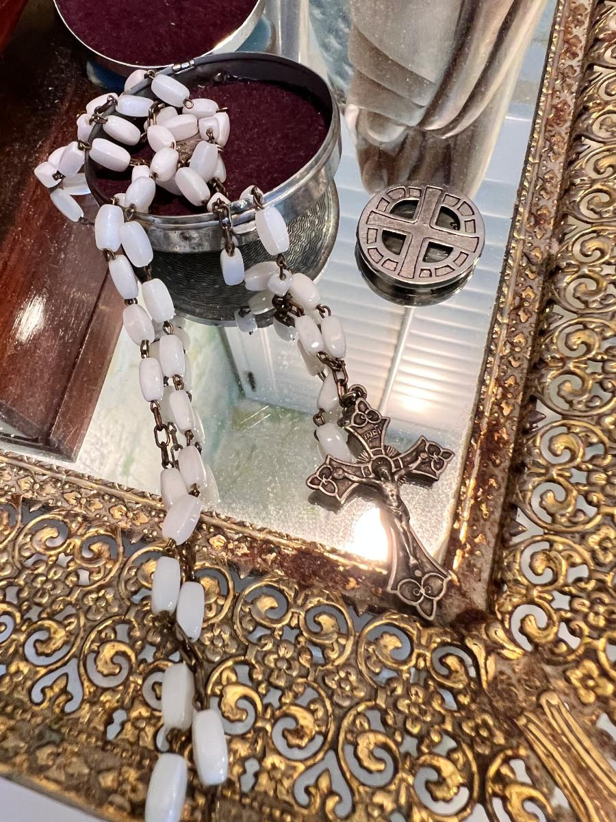Many depictions of religious significance. Mary in many of her forms. Wonderful Jesus with a mirrored stand. Rosary and case, crystal bead necklace, Marble bust of Mary, 2 glass sculptures. Wall Plaque of Mary with child is ceramic and can be used outdoors. Wooden music box and green glass vase.