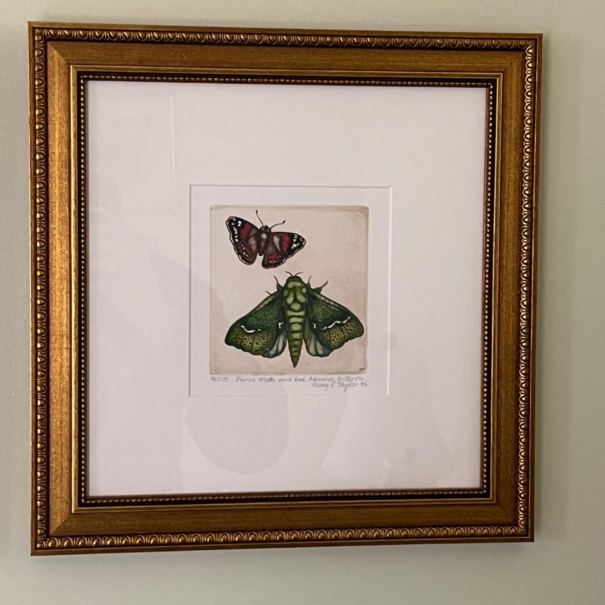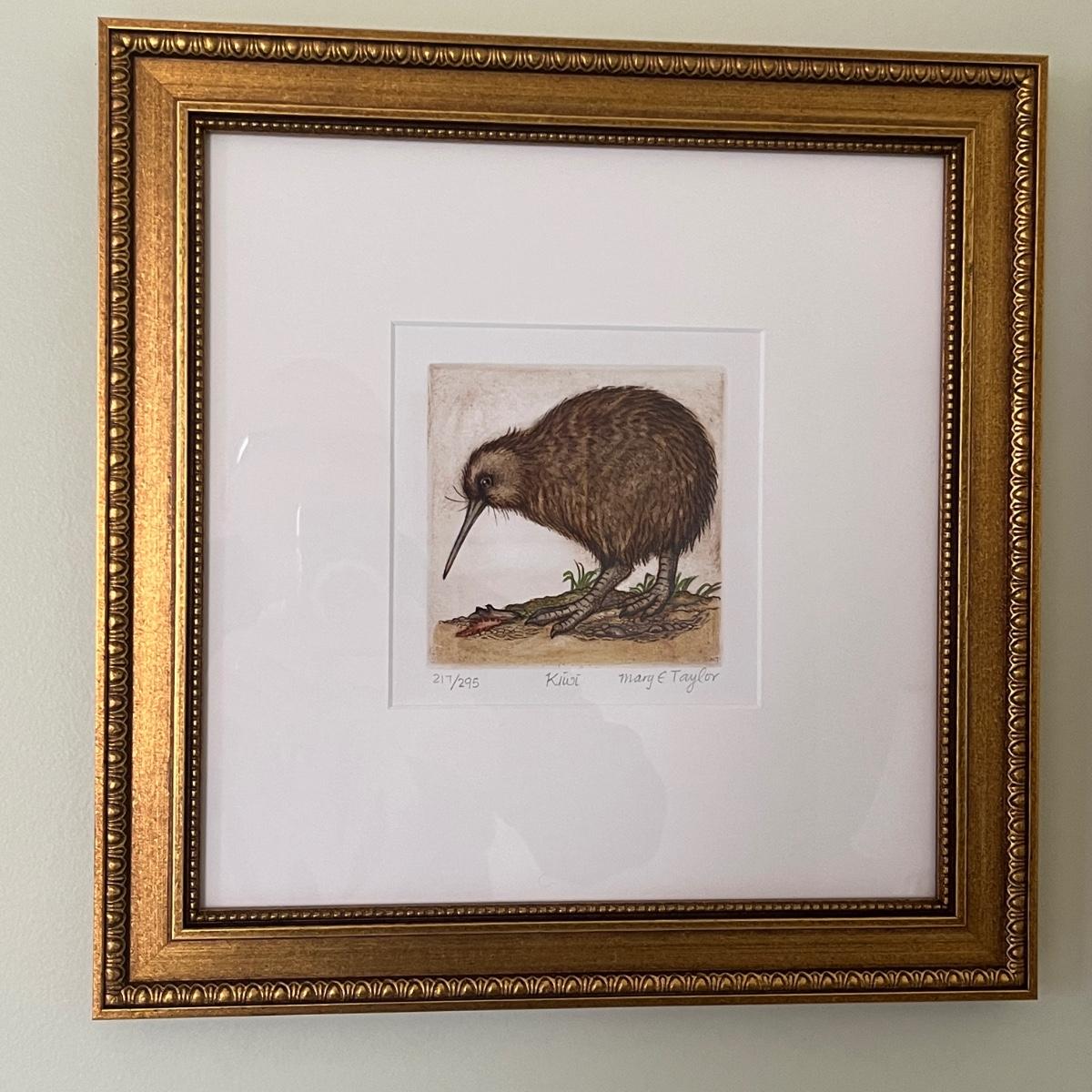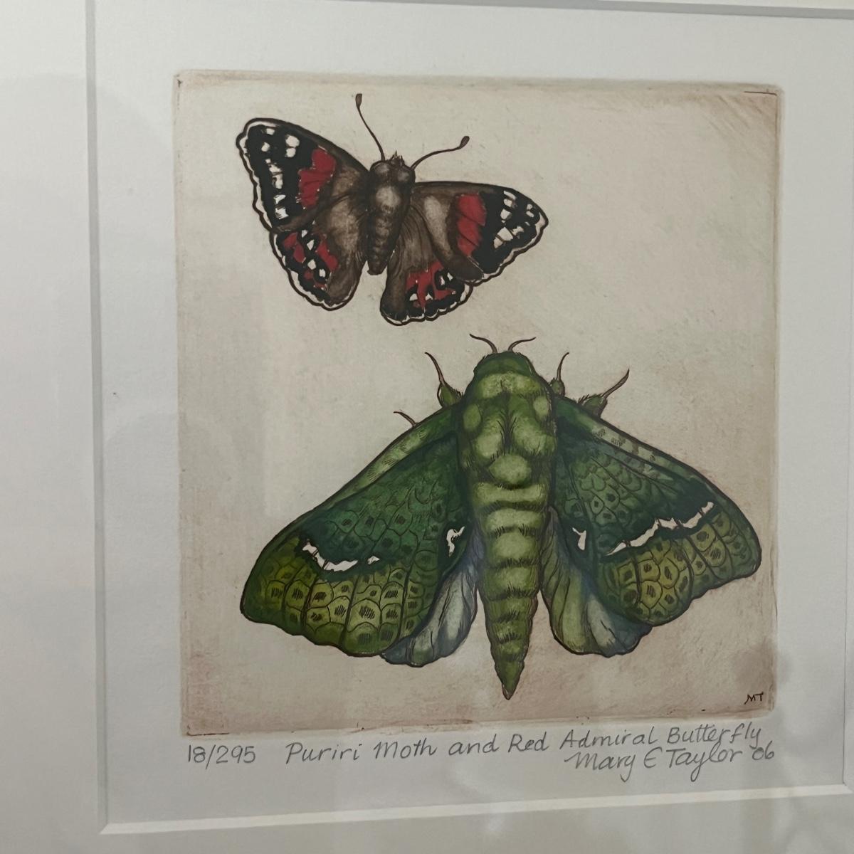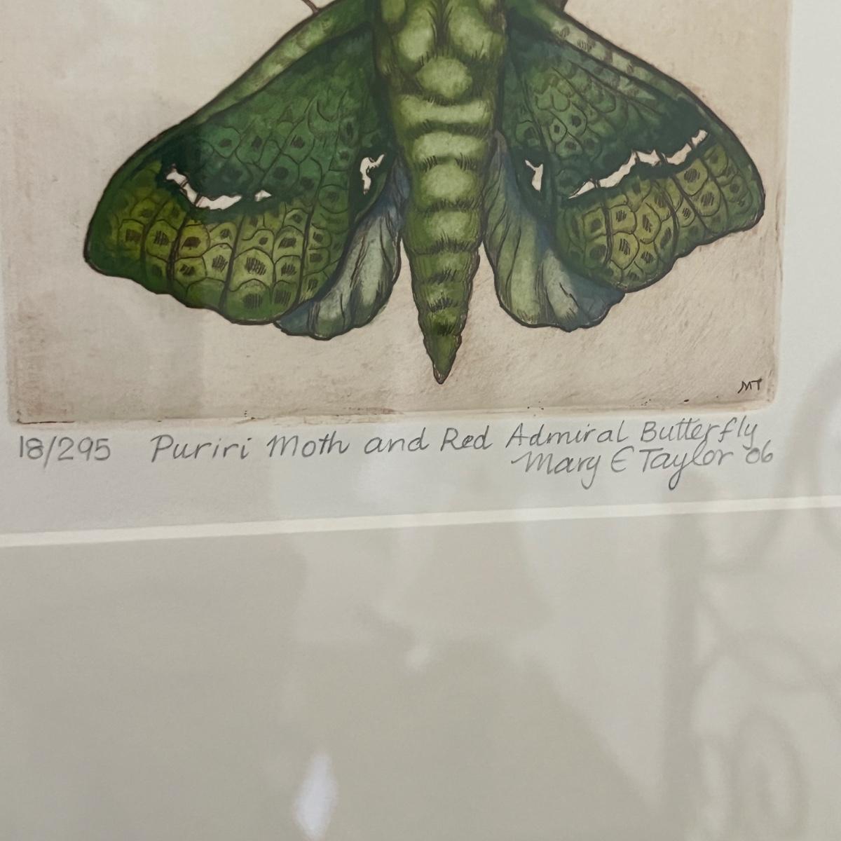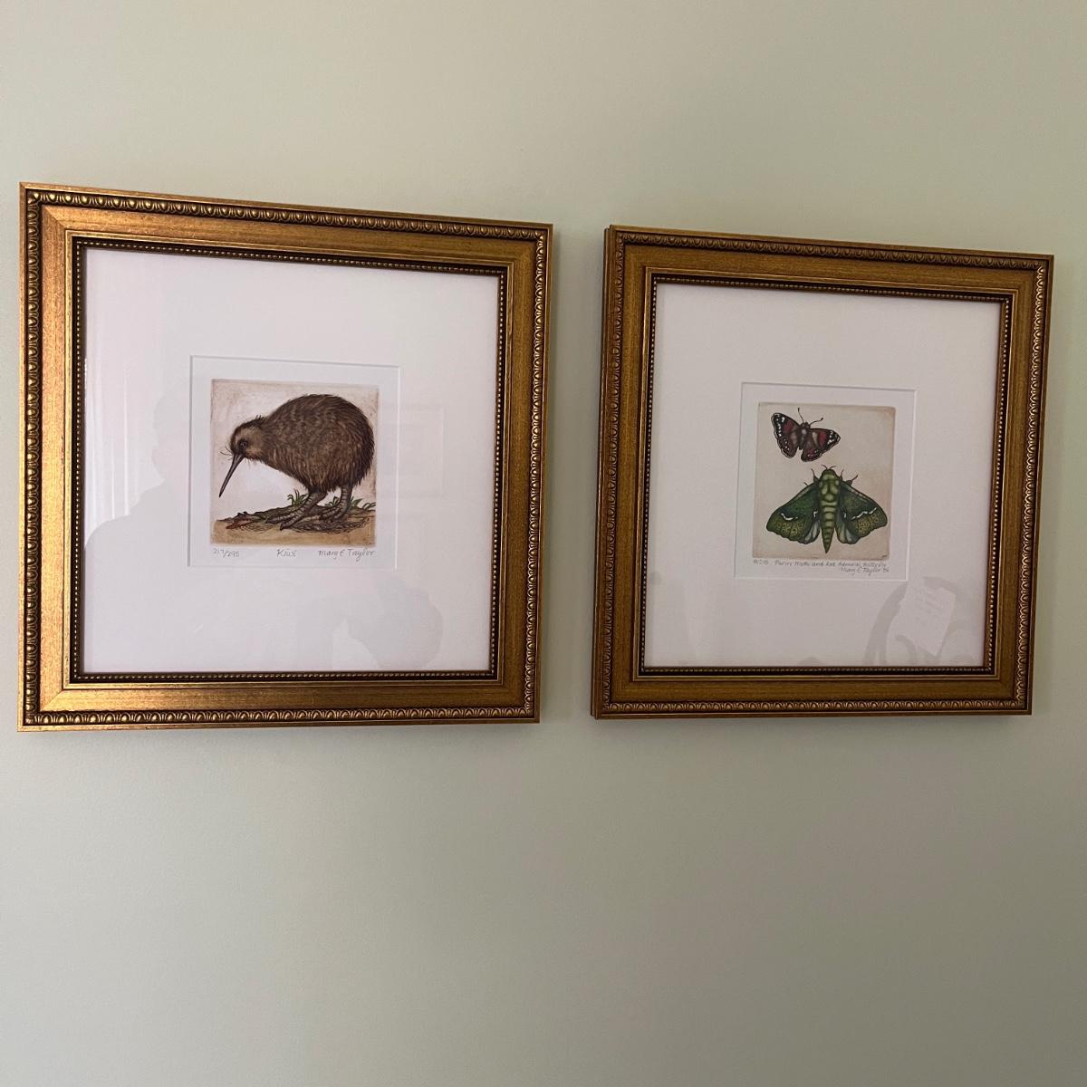 Lot includes two pencil signed and numbered hand colored etchings by New Zealand artist Mary Taylor. One is titled Kiwi and the other is Puriri Moth & Red Admiral Butterfly and both are in wooden frames and under glass. Frames measure 14” x 14”H. Per the homeowner, they were purchased in New Zealand in 2017. According to her gallery posting they are etchings.