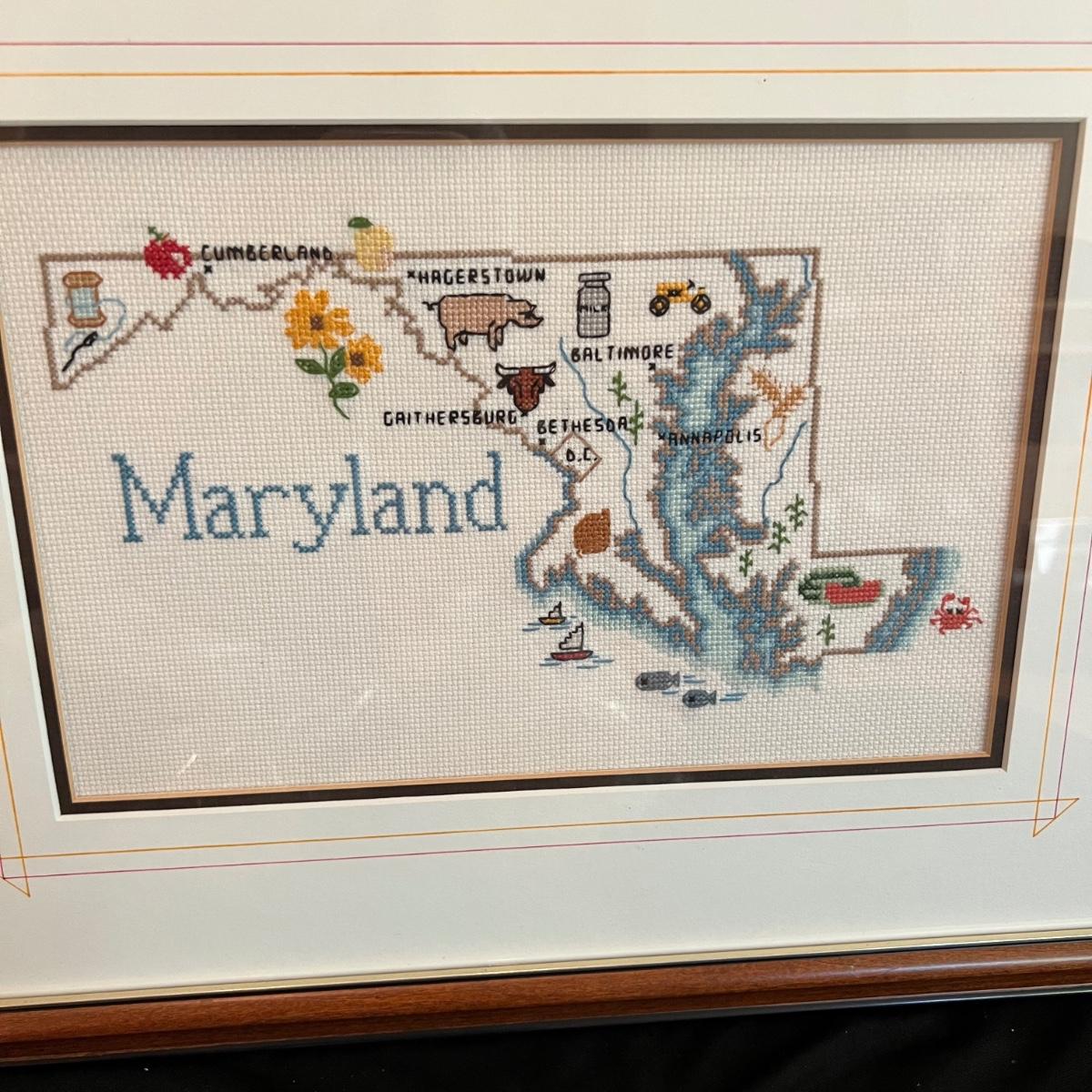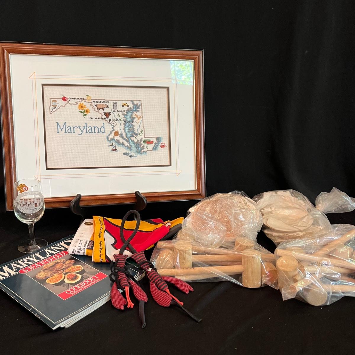 If you’re passionate about Maryland this lot is for you! Never miss home, carry with you 20 oyster shells, 11 mallets, the Maryland flag and a Maryland scarf, a beautiful lobster pot accessory, three Maryland seafood cookbooks, and a set of wine glasses from the Catoctin Vineyards. Also includes a needlepoint framed map of Maryland with all the essential elements highlighted. Not to be missed!
