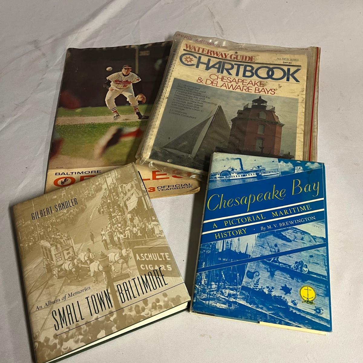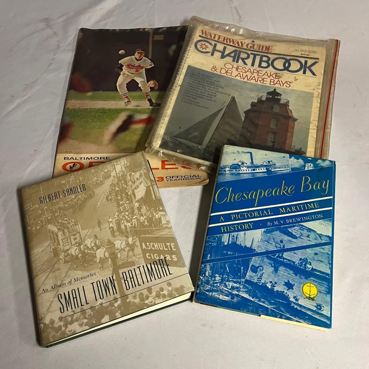 Lot includes 1963 Baltimore Orioles official yearbook, Waterway guide of Chesapeake & Delaware Bays, C-Thru Ruler, Chesapeake Bay book and a book titled Small Town Baltimore.