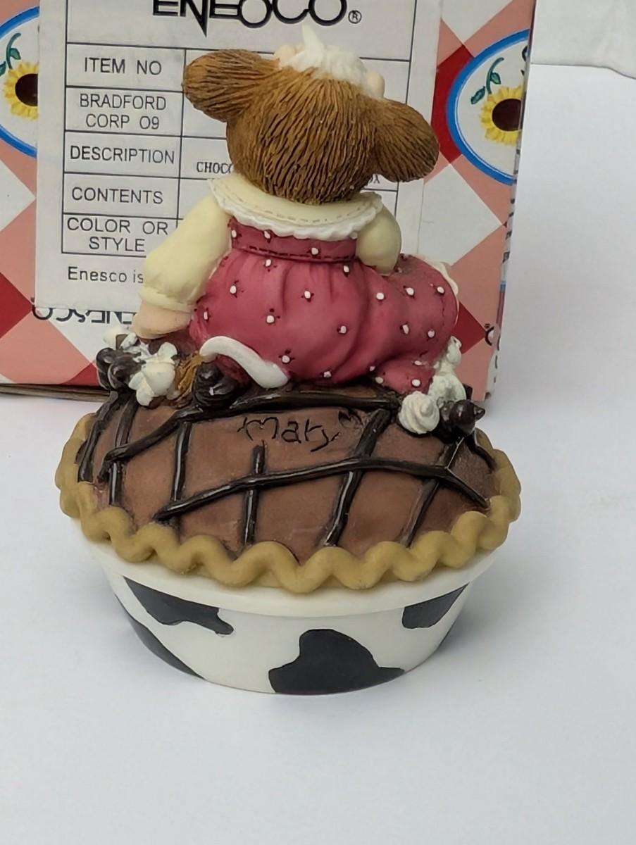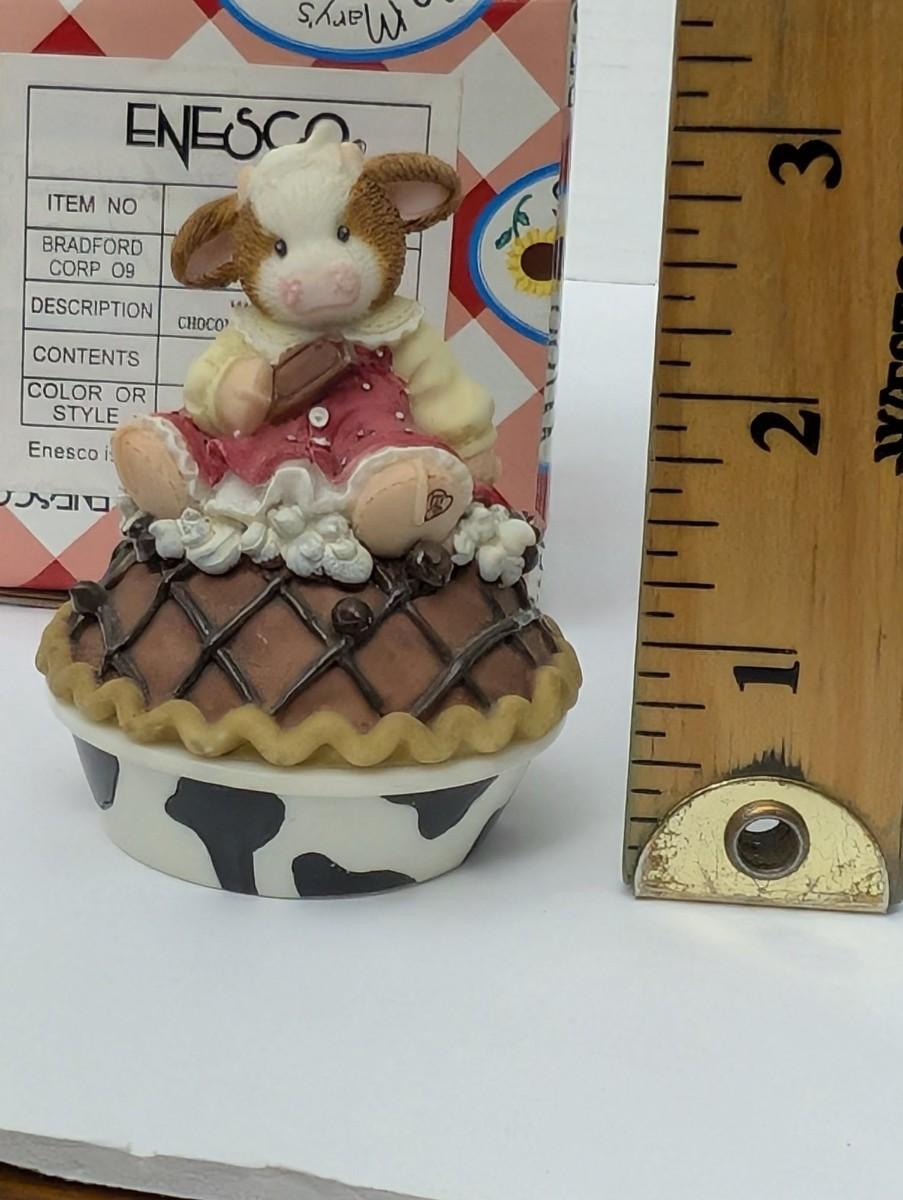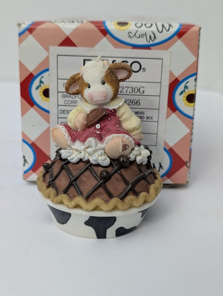 Adorable Mary’s Moo Moos figurine from Enesco, item 372730G, featuring a sweet cow sitting atop a chocolate pie trinket box with whipped cream and a cow print base. Comes in original box marked #28266, a must-have for collectors and dessert-themed décor lovers.