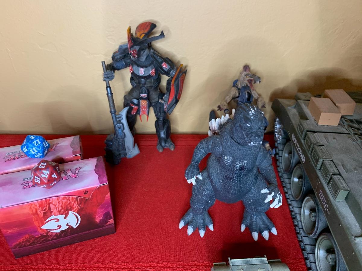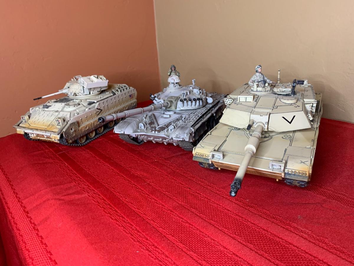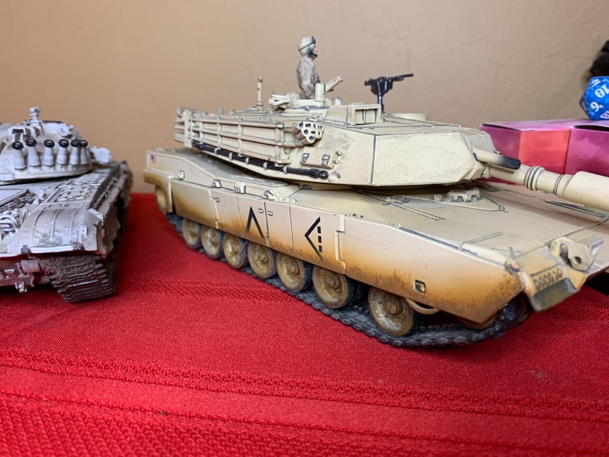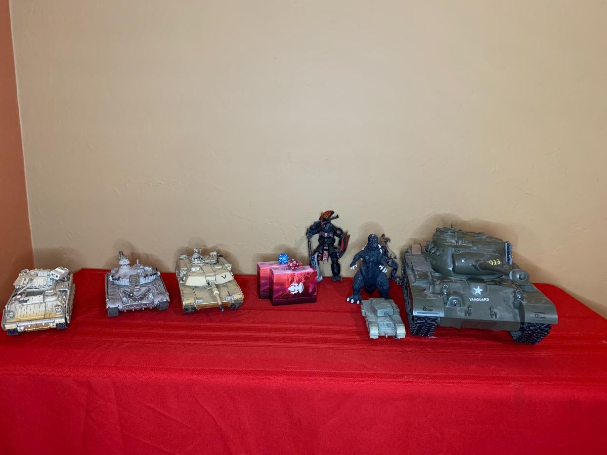 An assortment of toy tanks and figurines in good condition. Dusty but in good condition. Largest tank measures 15 inches in length and 9 inches in width