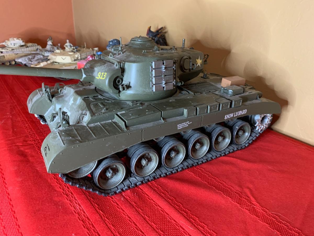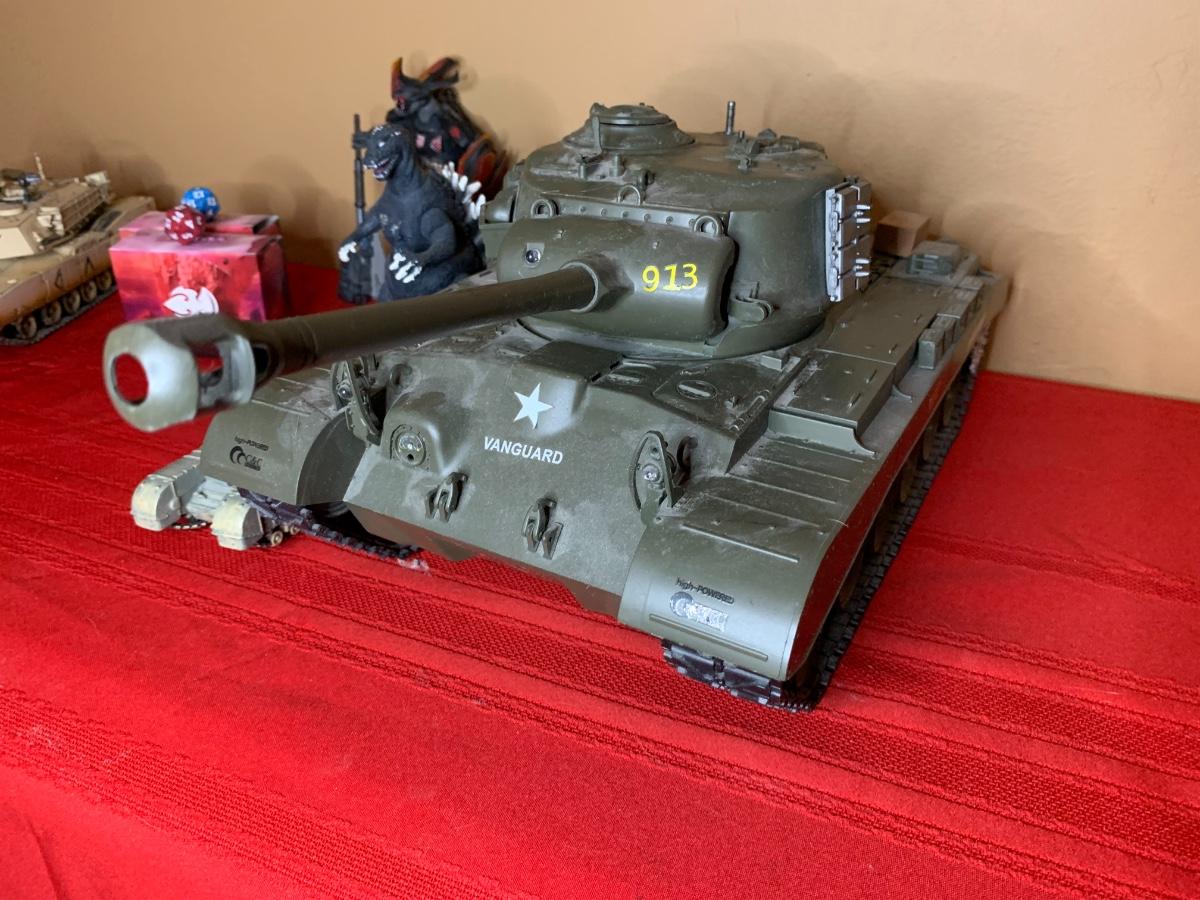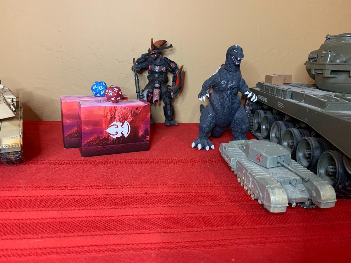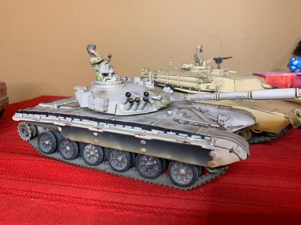 An assortment of toy tanks and figurines in good condition. Dusty but in good condition. Largest tank measures 15 inches in length and 9 inches in width