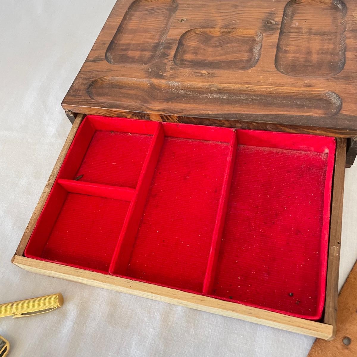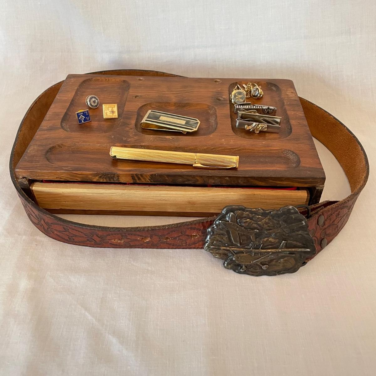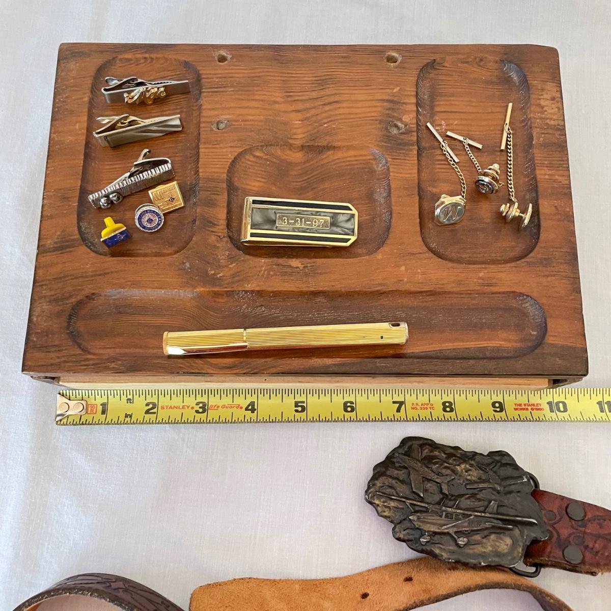 A primitive style men’s valet box with what appears to be a homemade drawer. Lot includes three Masonic pins, a lighter that looks like a gold pen (flint sparked when tested), a money clip with date engraved, three tie tacks, three tie clips and a leather belt with a brass buckle. Belt is labeled 36. “Mac” on one tie clip is loose, a little bit of glue would easily fix it. See images. Shipping available. All sales are final. No returns or refunds. Please bid accordingly.