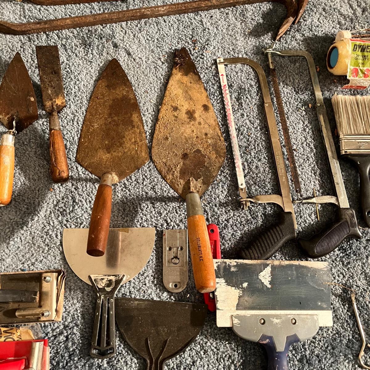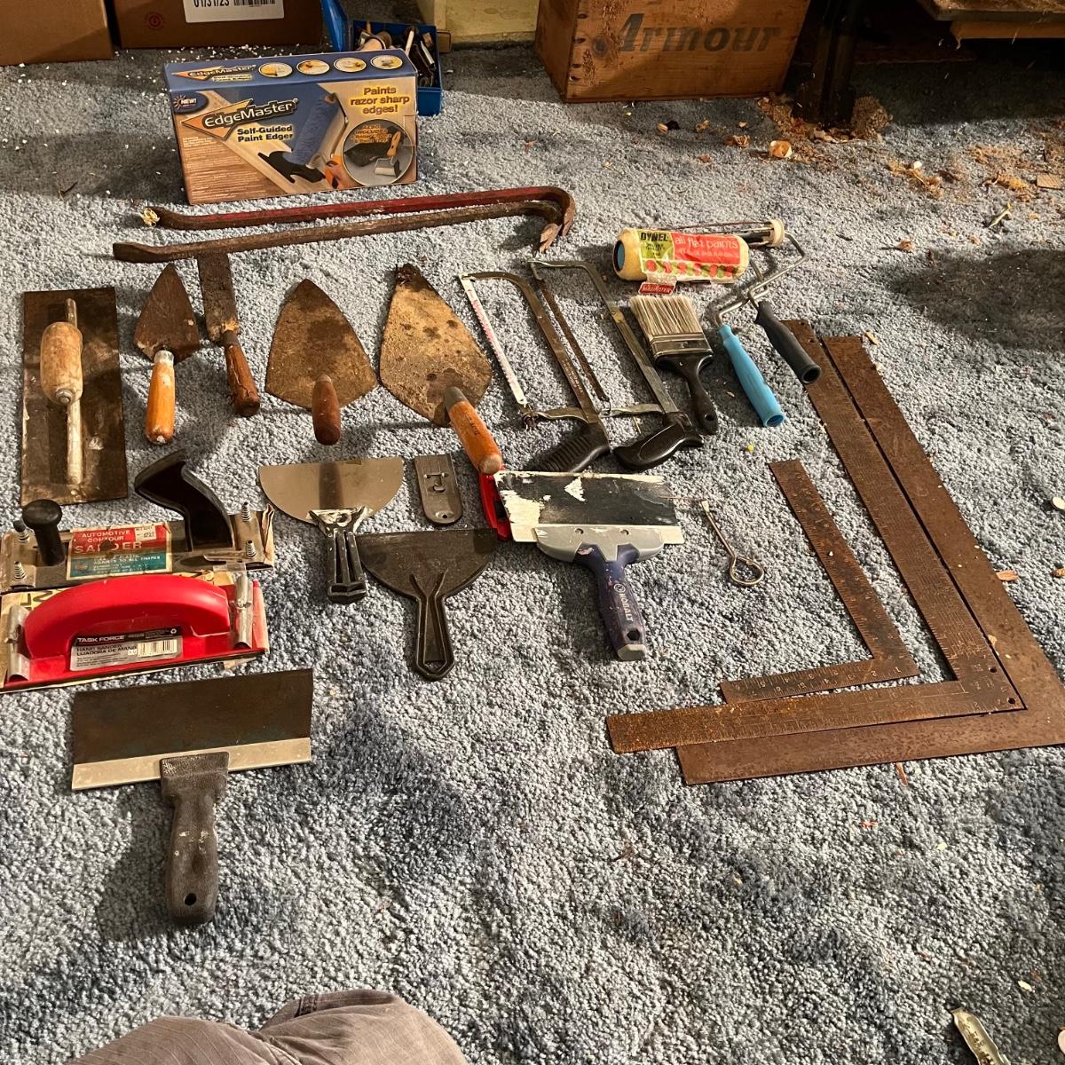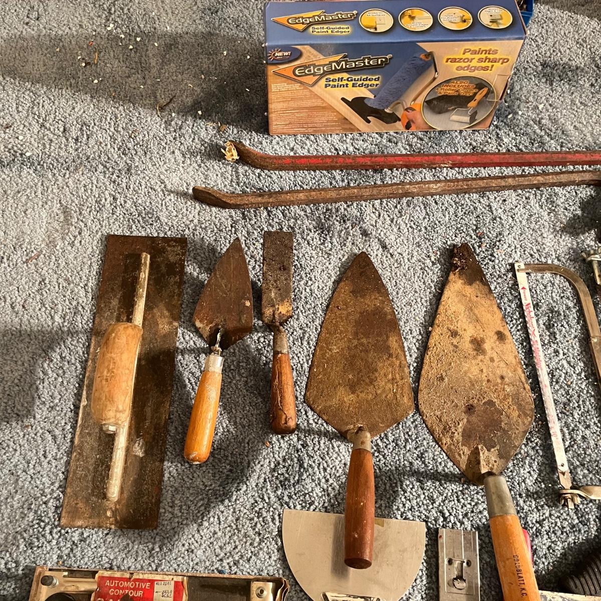 Lot includes hand sanders, hacksaws, trowels, paint rollers, crow bars, paint edger and more.
