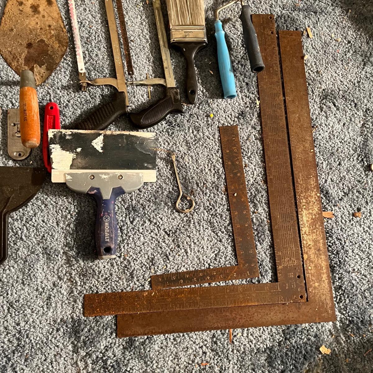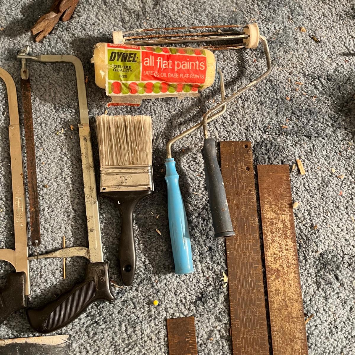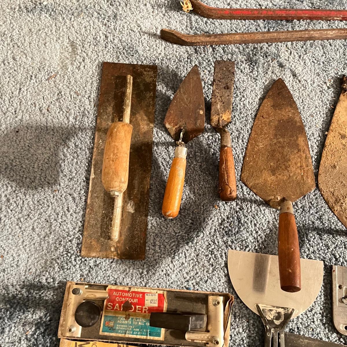 Lot includes hand sanders, hacksaws, trowels, paint rollers, crow bars, paint edger and more.