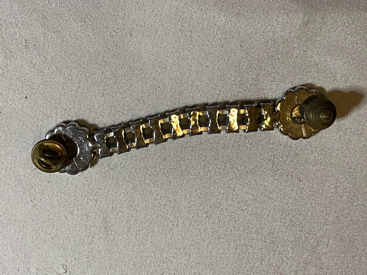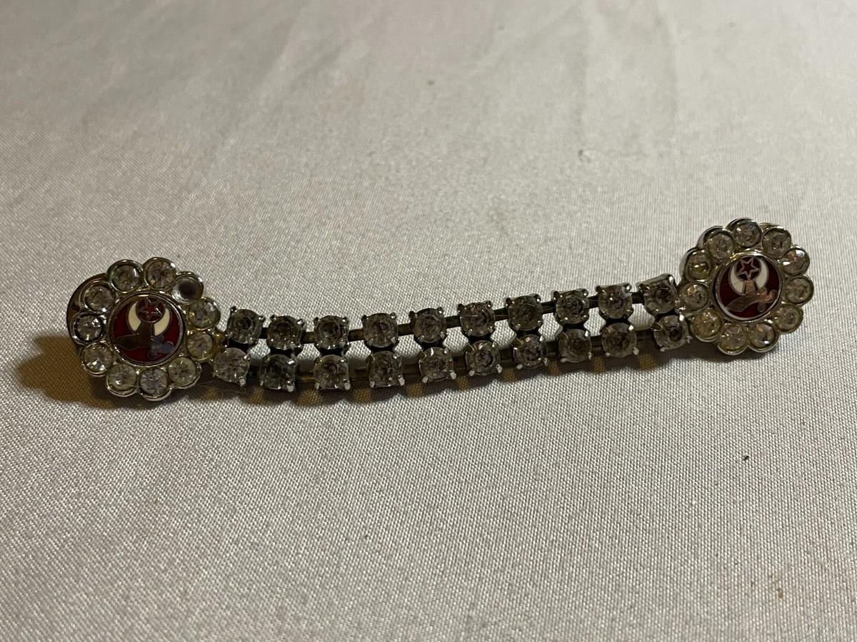 This piece is pinned on either side of the tassle to keep it in place. It is about 3.75 inches long and the only issue is that one rhinestone is missing.