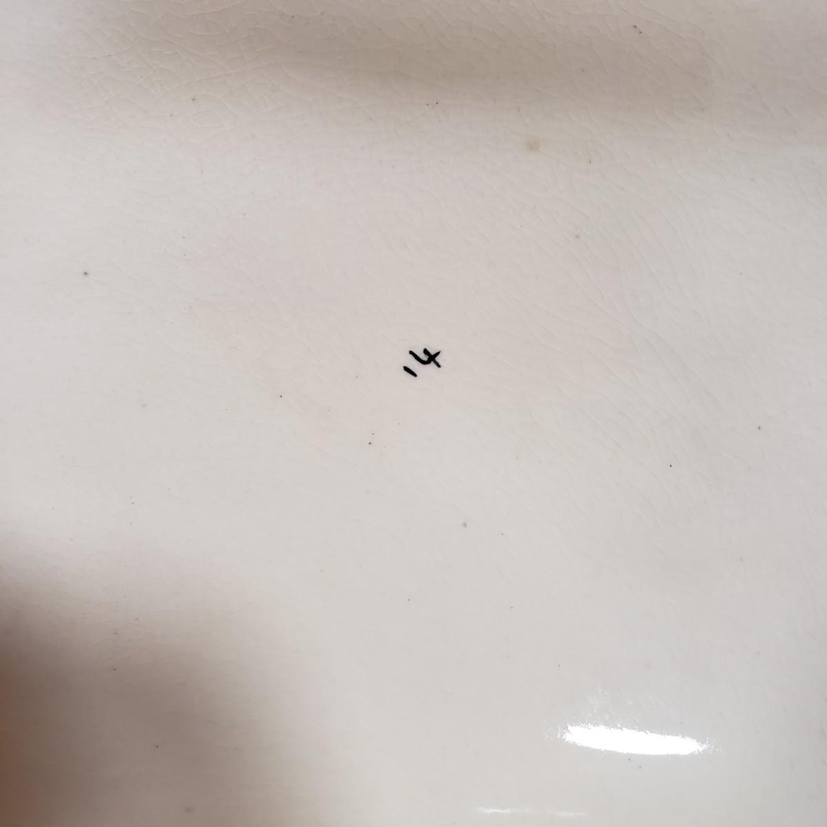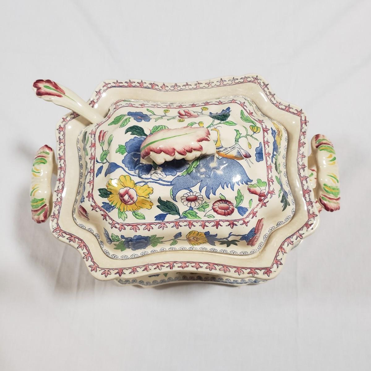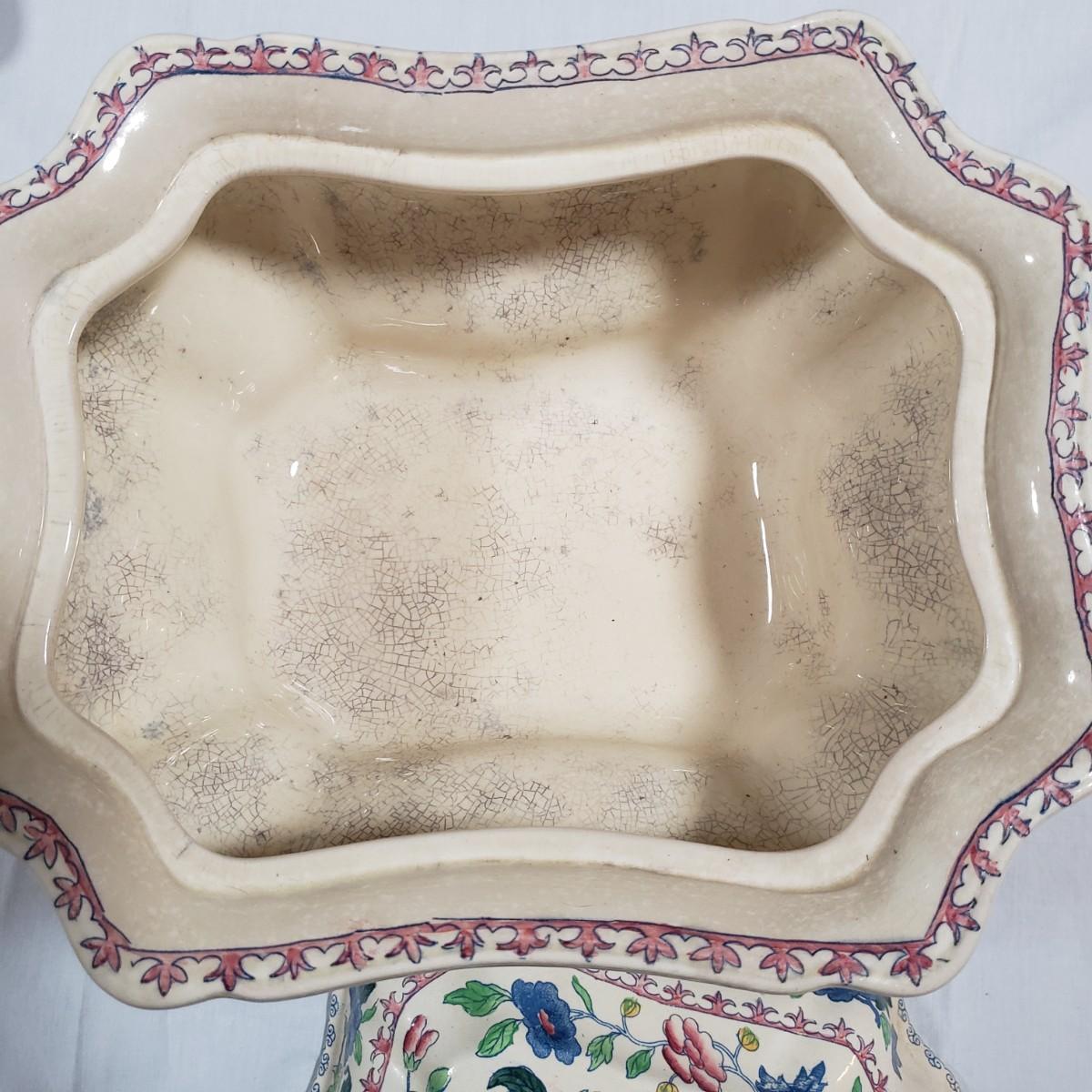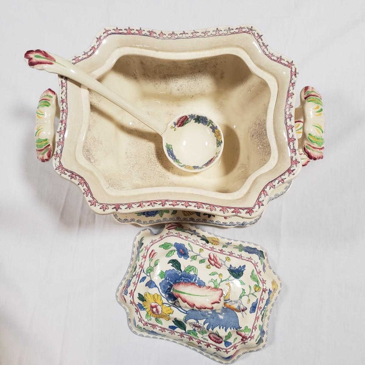 This tureen contains a platter, bowl with lid and a ladle. The platter measures 15" x 11" and the bowl/lid measure 14" x 9" x 7"H. There is some crackling of the glaze inside and on the rim of the bowl. Note that the ladle appears to have been repaired, see pictures.