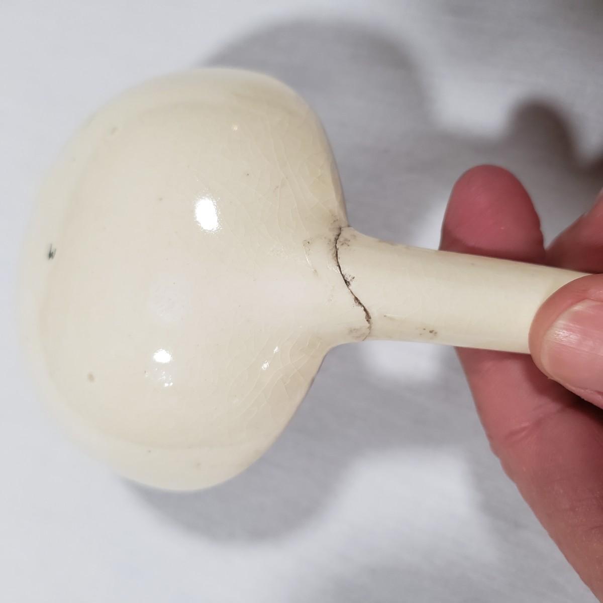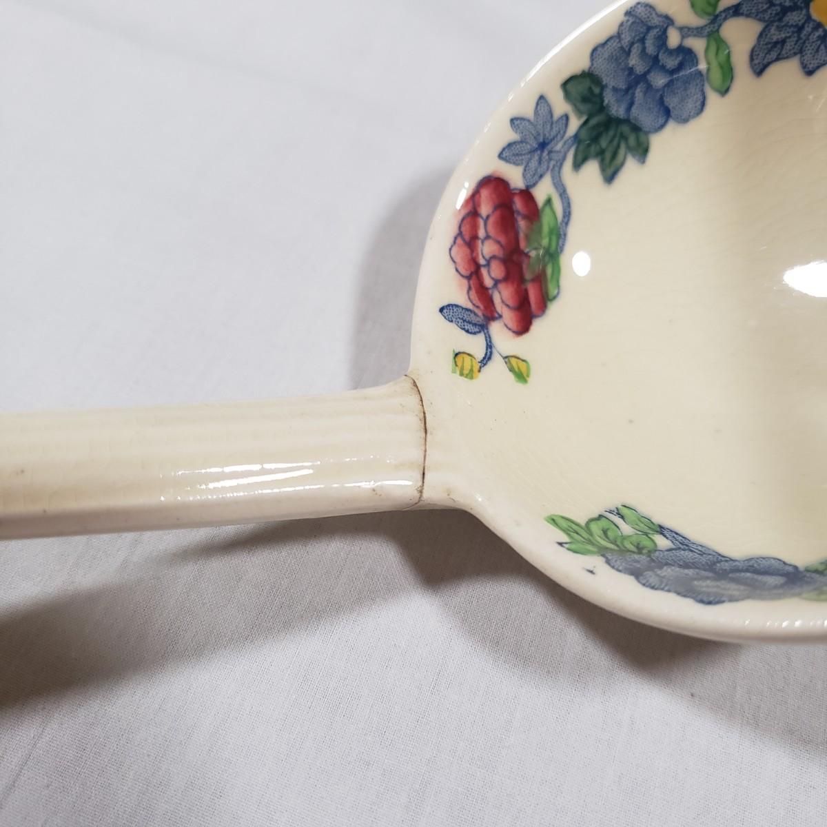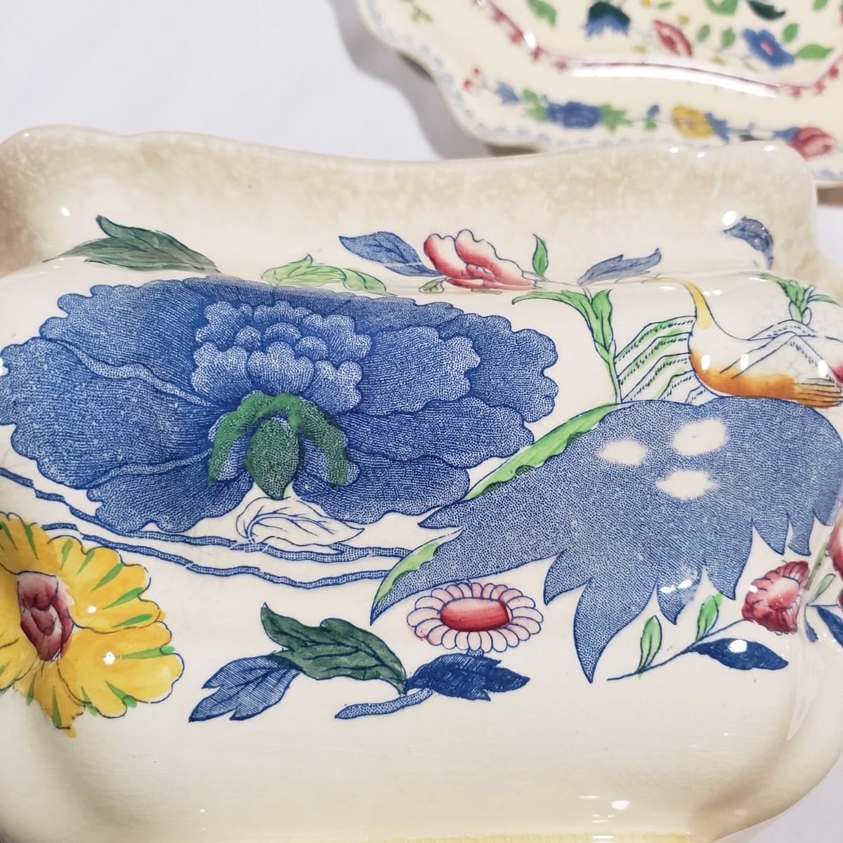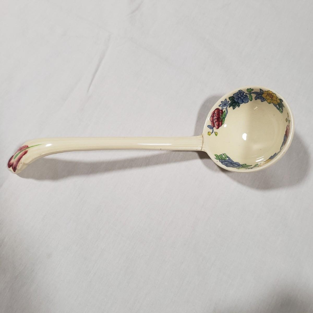 This tureen contains a platter, bowl with lid and a ladle. The platter measures 15" x 11" and the bowl/lid measure 14" x 9" x 7"H. There is some crackling of the glaze inside and on the rim of the bowl. Note that the ladle appears to have been repaired, see pictures.