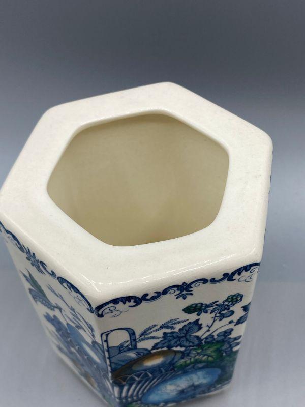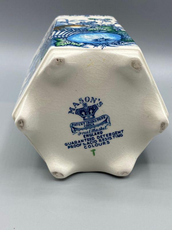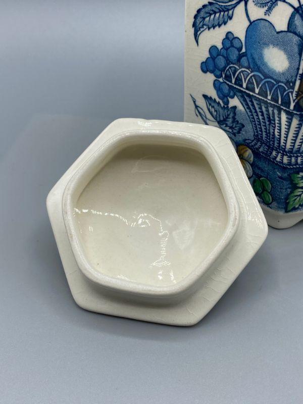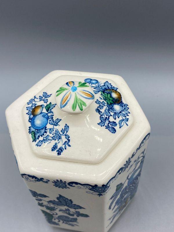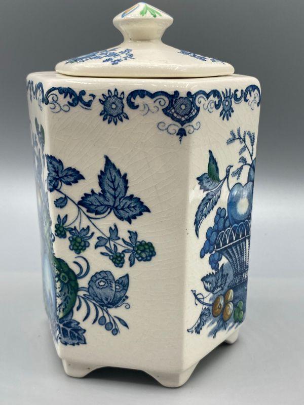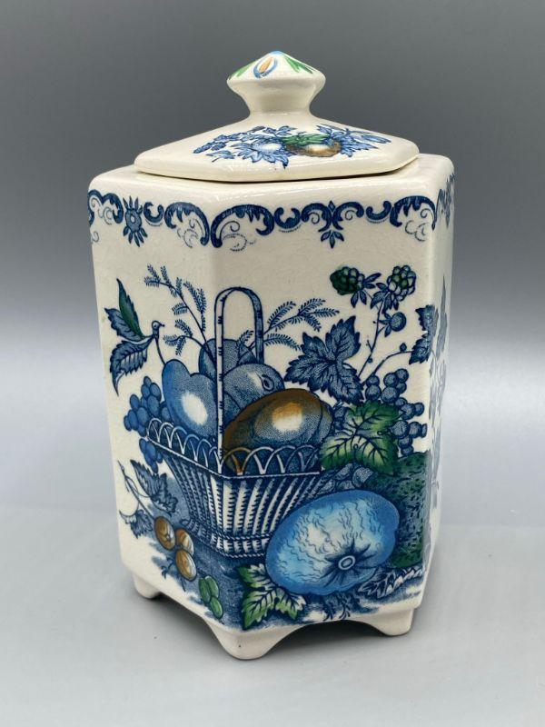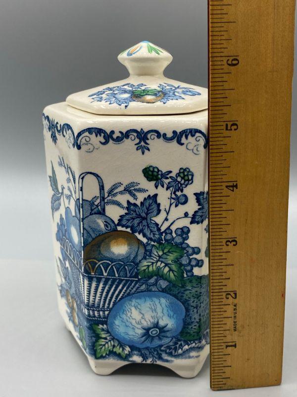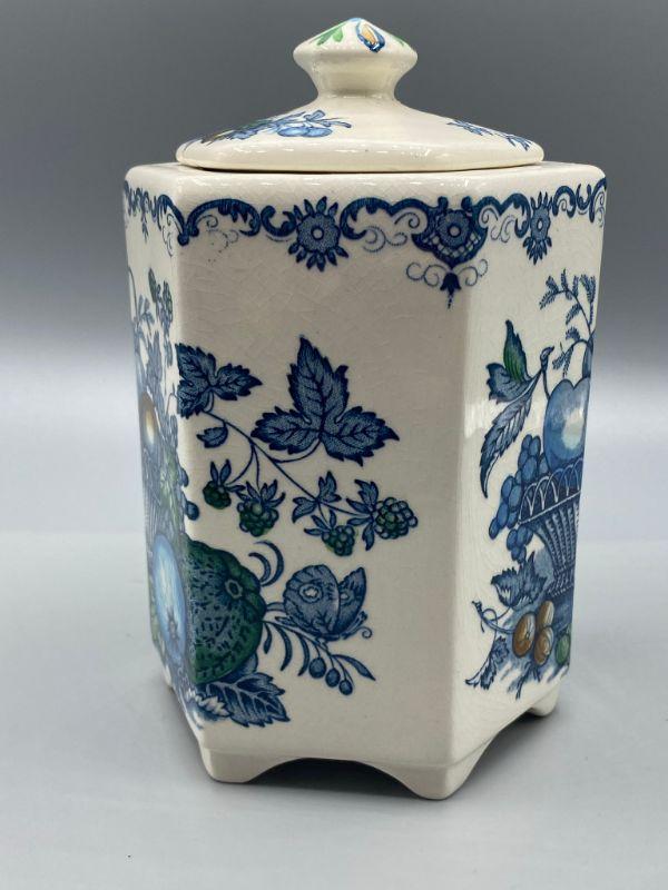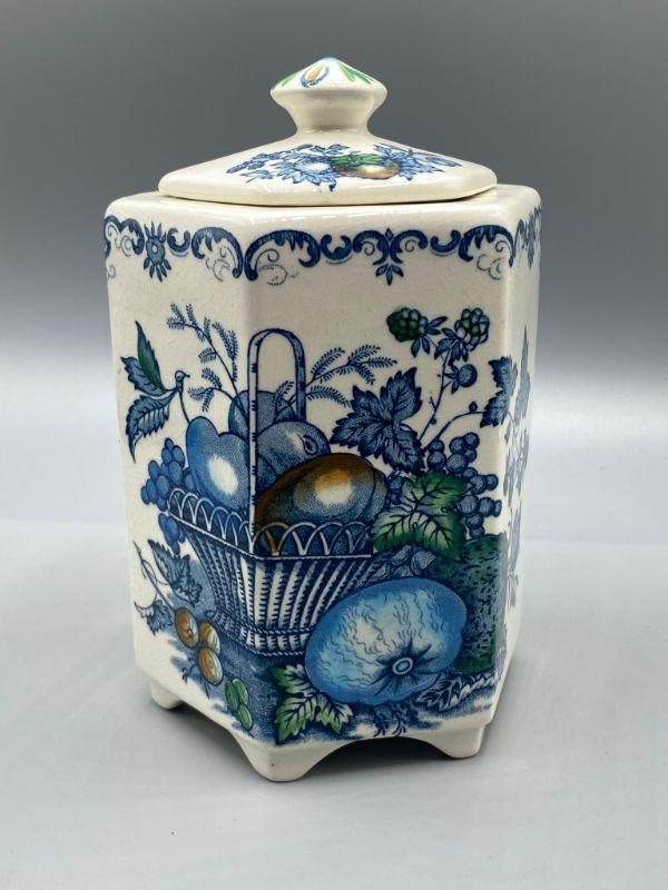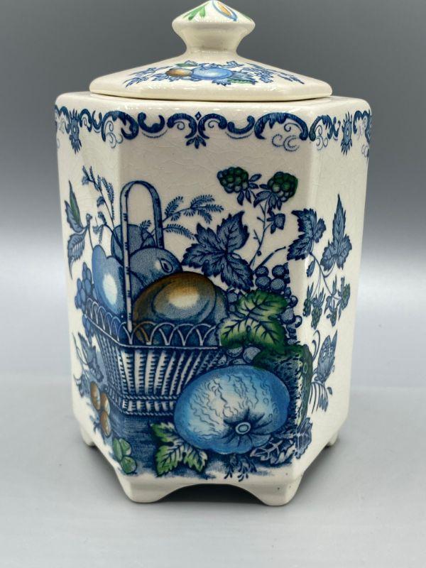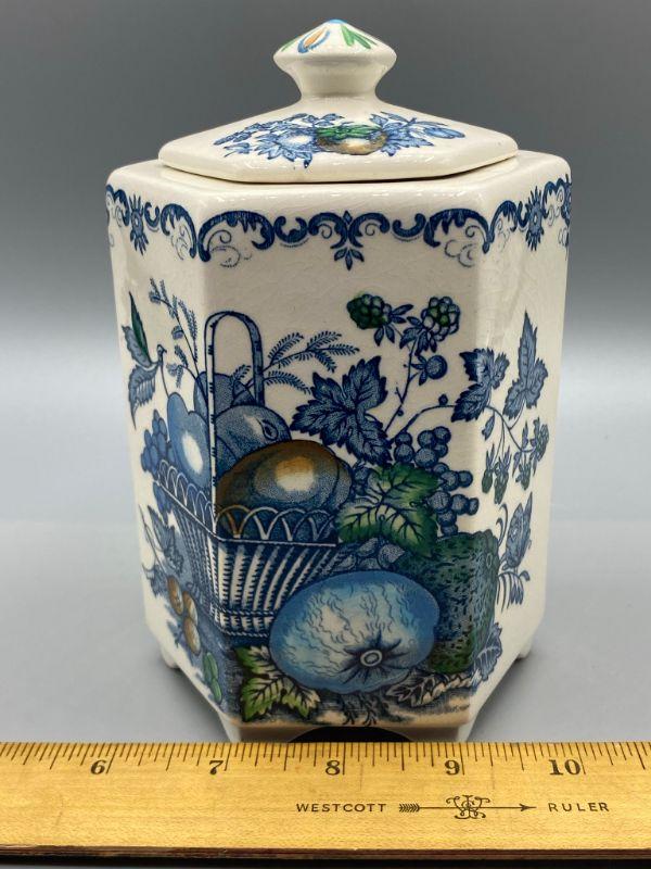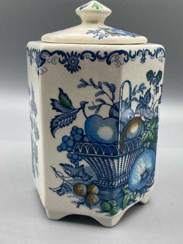 Vintage Mason's ironstone china biscuit or tea canister. "Fruit Basket" pattern, hand painted in shades of blue with hints of orange and green. Colors are vibrant, very eye catching. Displays beautifully. Small size, about 6" tall. Great condition, no damage.
