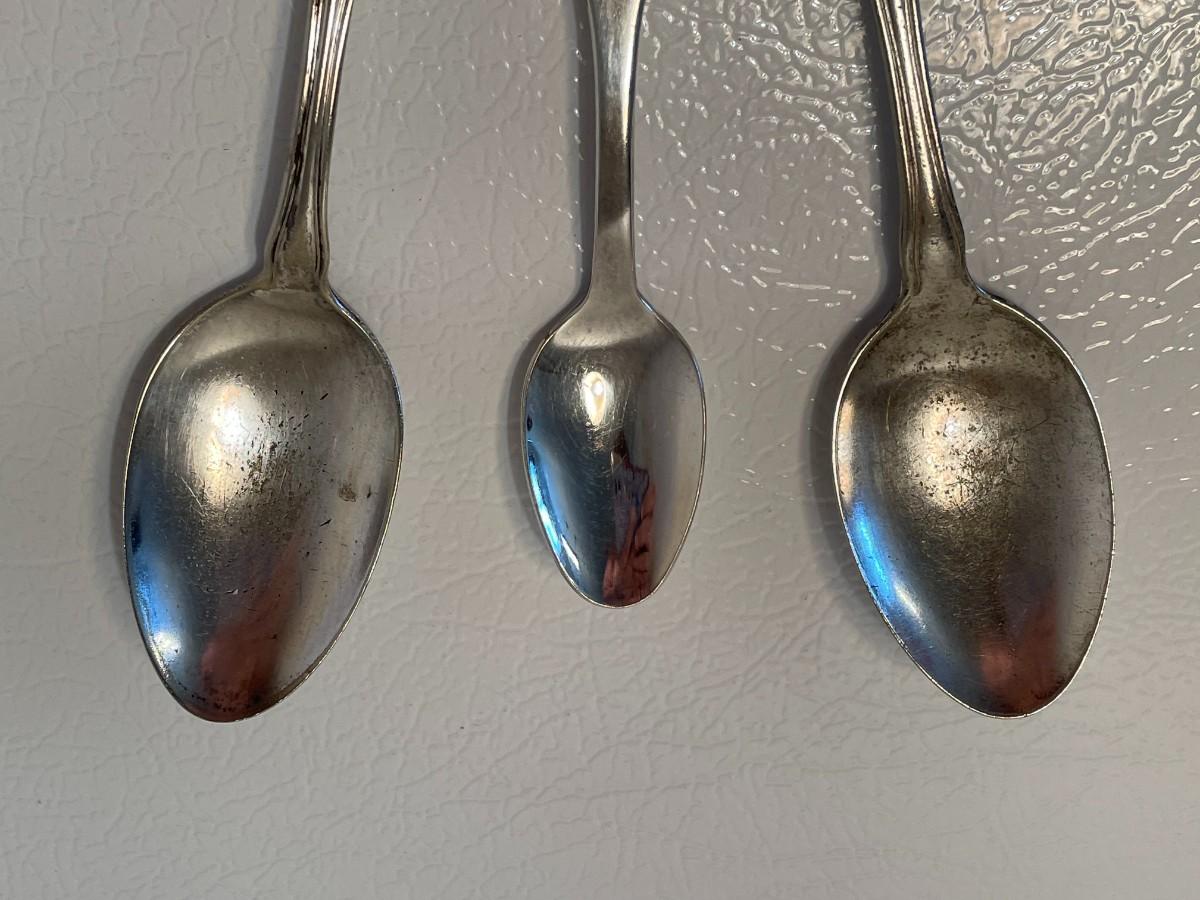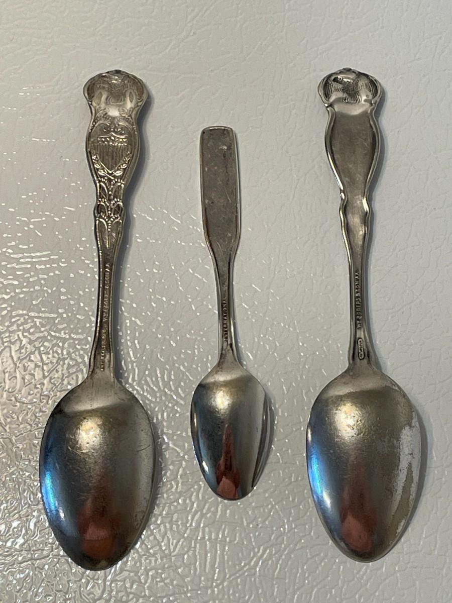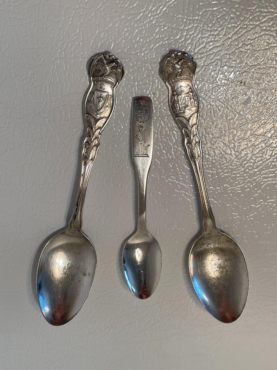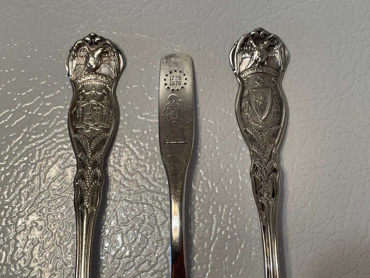 The larger Massachusetts and Maryland spoons are from Wm. Rogers and Son and in the Stately pattern. Each spoon is about 6" long and there is quite a bit of wear on the bowl of the spoons. The smaller spoon is a Bicentennial Minuteman 19776-1976 spoon from the International Silver compay. It is also silverplated and about 4.5 inches long.