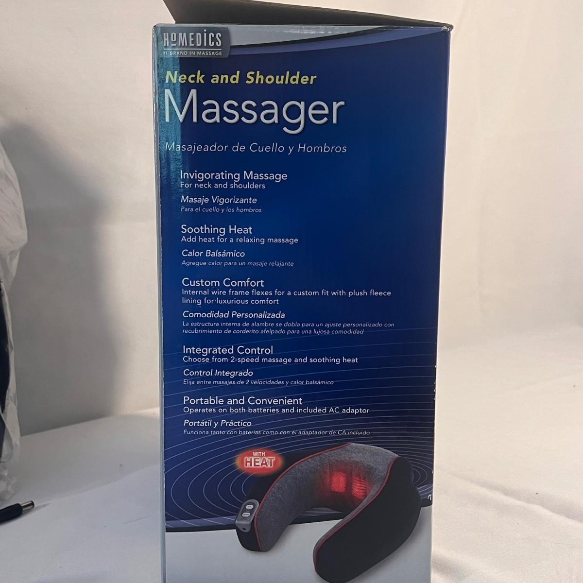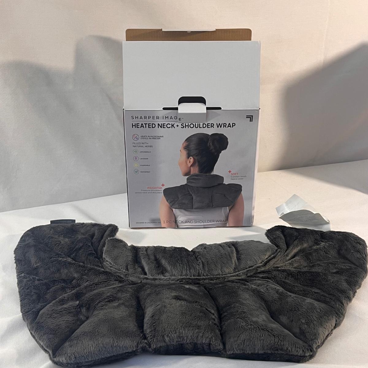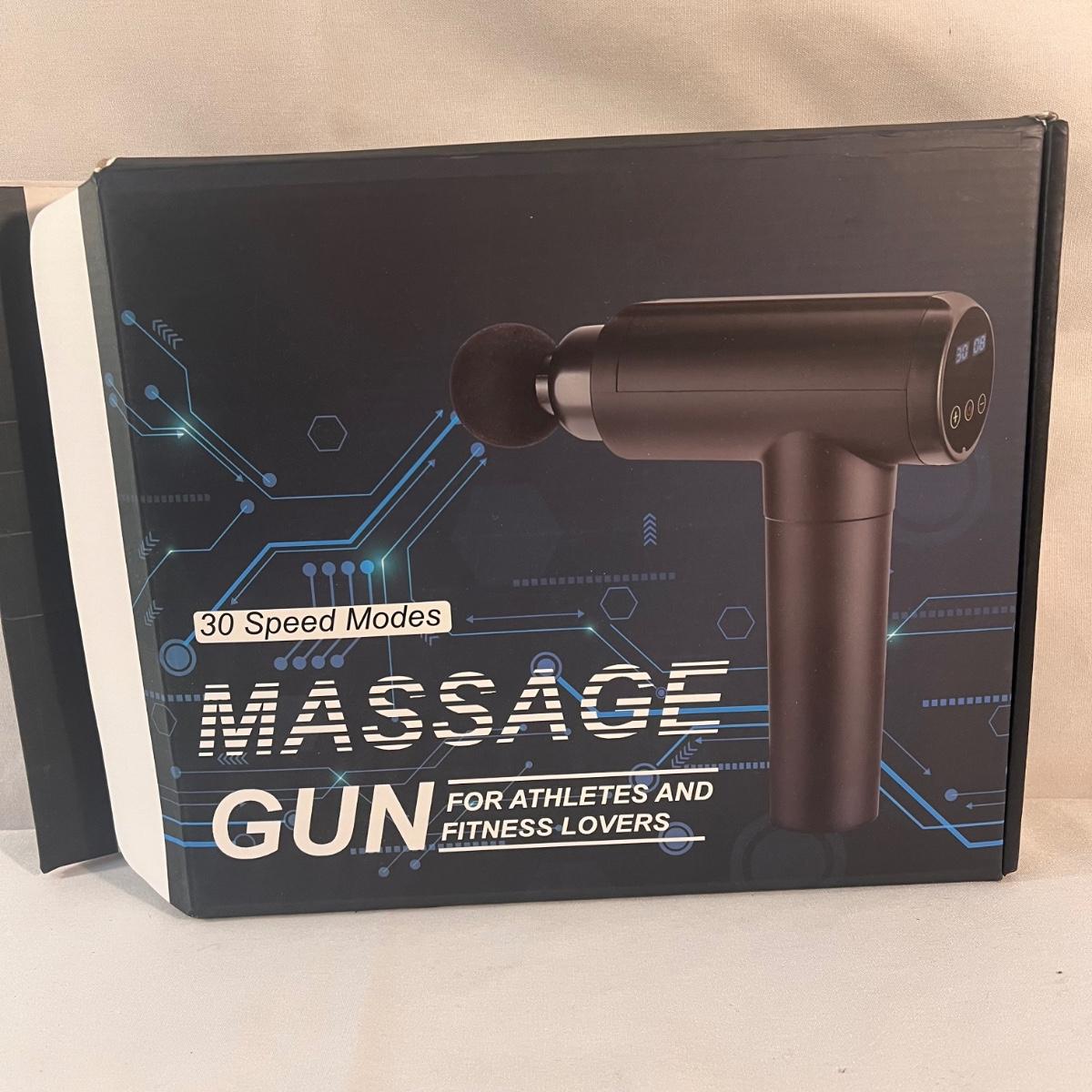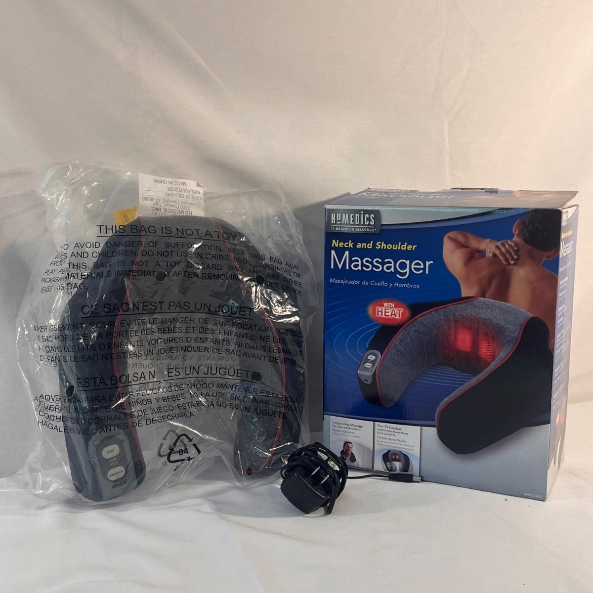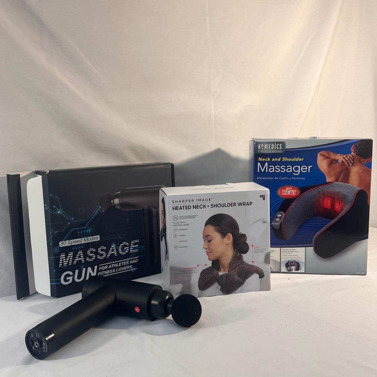 Lot includes one massage gun with 30 speed modes, one heated neck and shoulders wrap by Sharper Image, and one neck and shoulder massager by Homedics. All items powered on when plugged in. Shipping available.