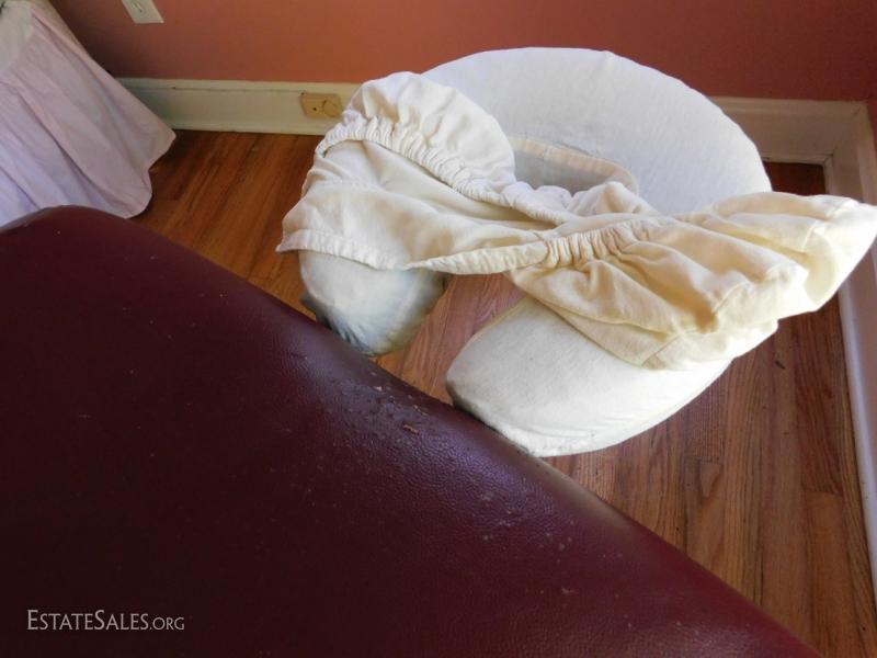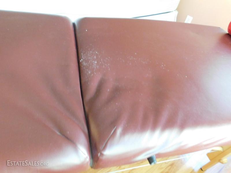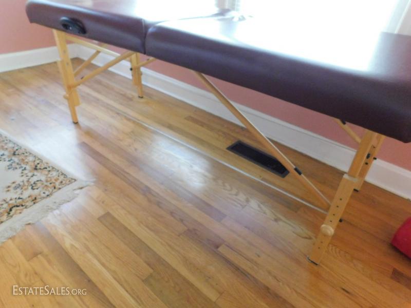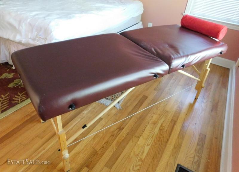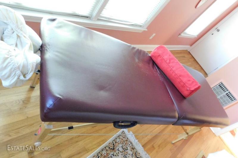 Massage Table with padded head rest. Could not find a brand name. Some picks and scratches on upholstery. Sturdy