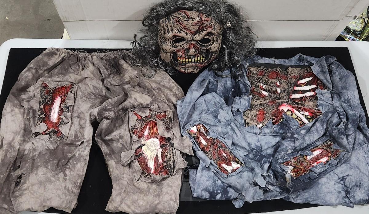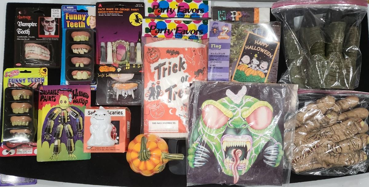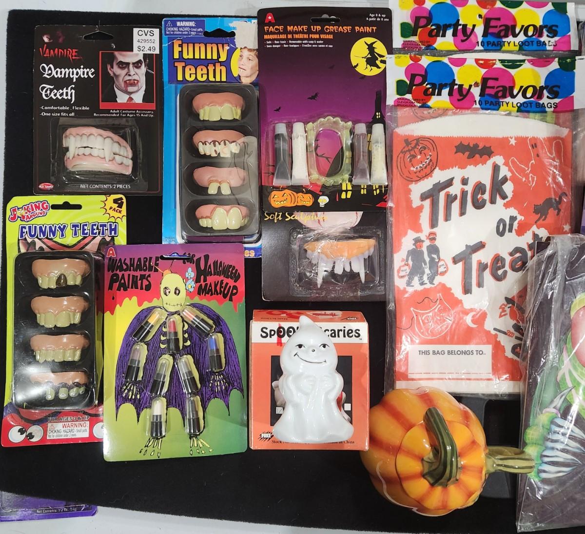 Vintage Halloween Monster plate holder - Paper Magic Group Monster Zombie Frankenstein Hands Gloves - Jurassic Park World Dinosaur Claw Hands - Vampire Fangs & Makeup - Wall Hang ups - Vintage Easter Unlimited Zombie Ghoul Skull Halloween Mask Costume w/ shirt & pants