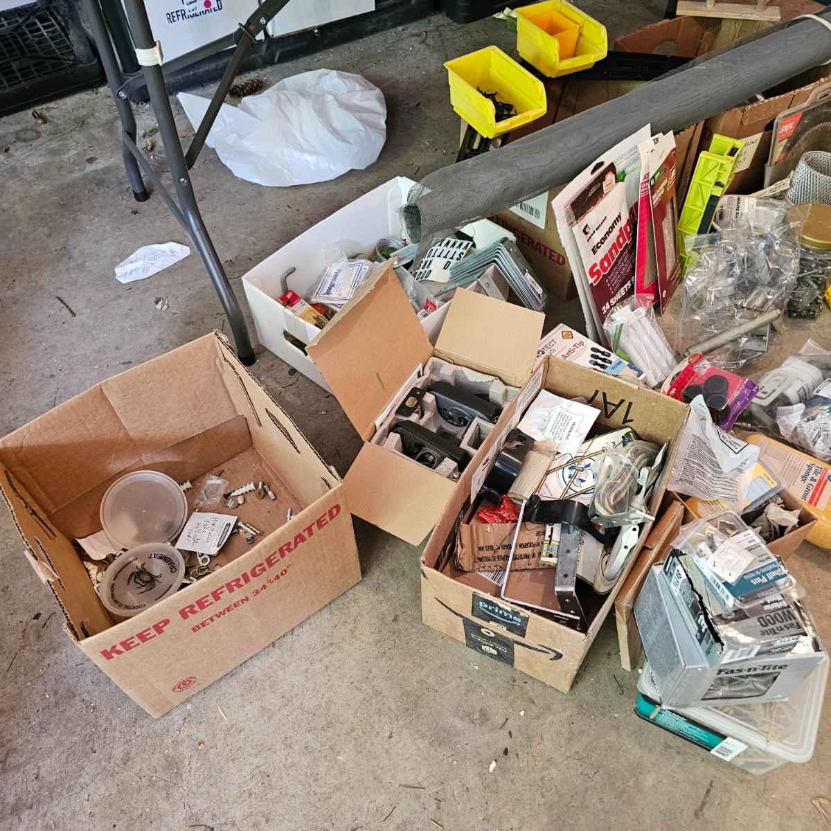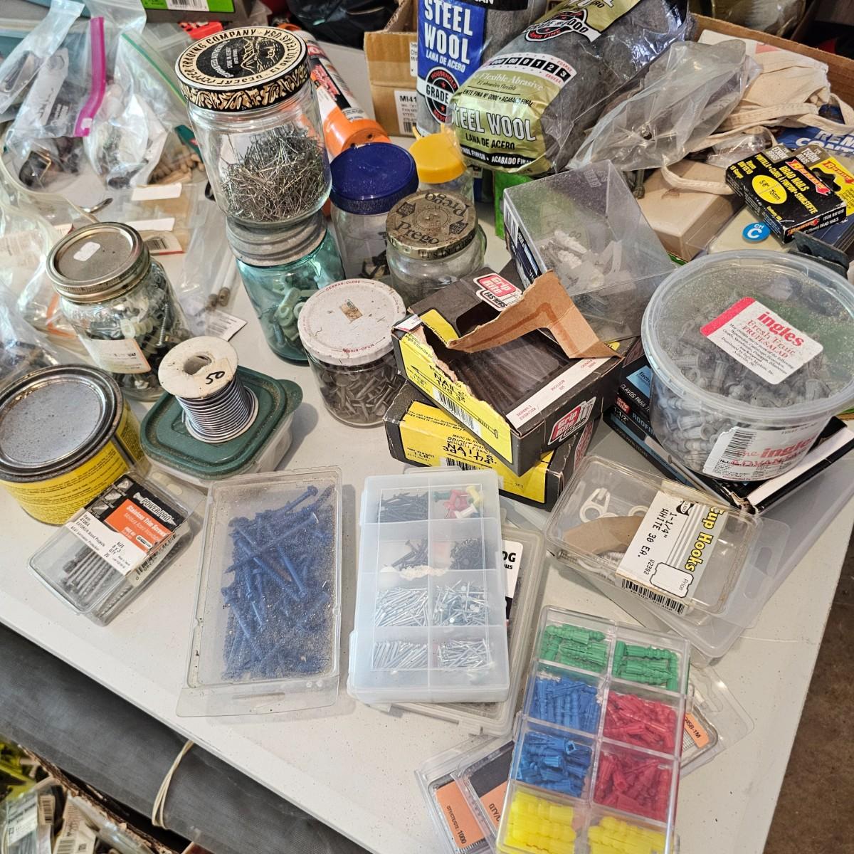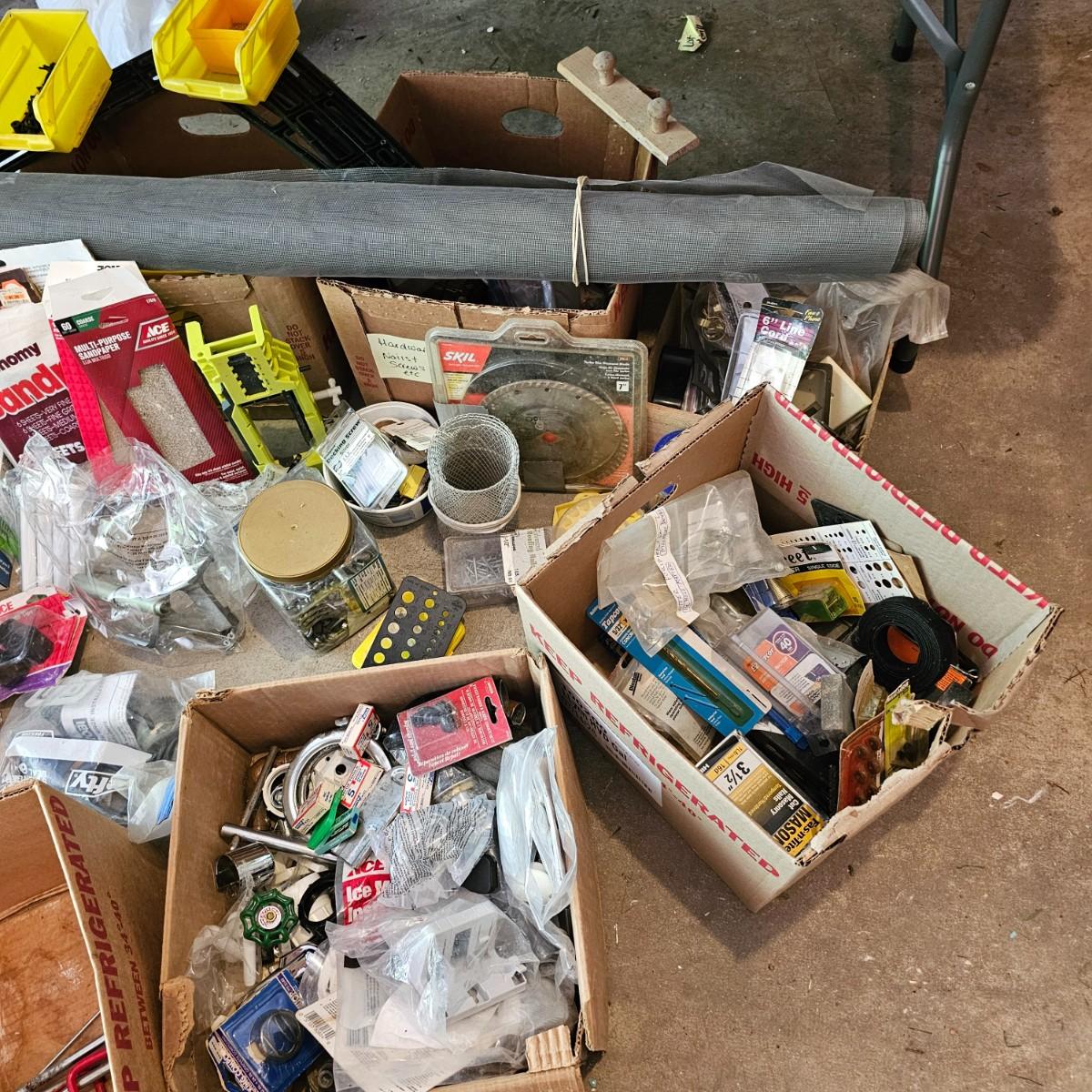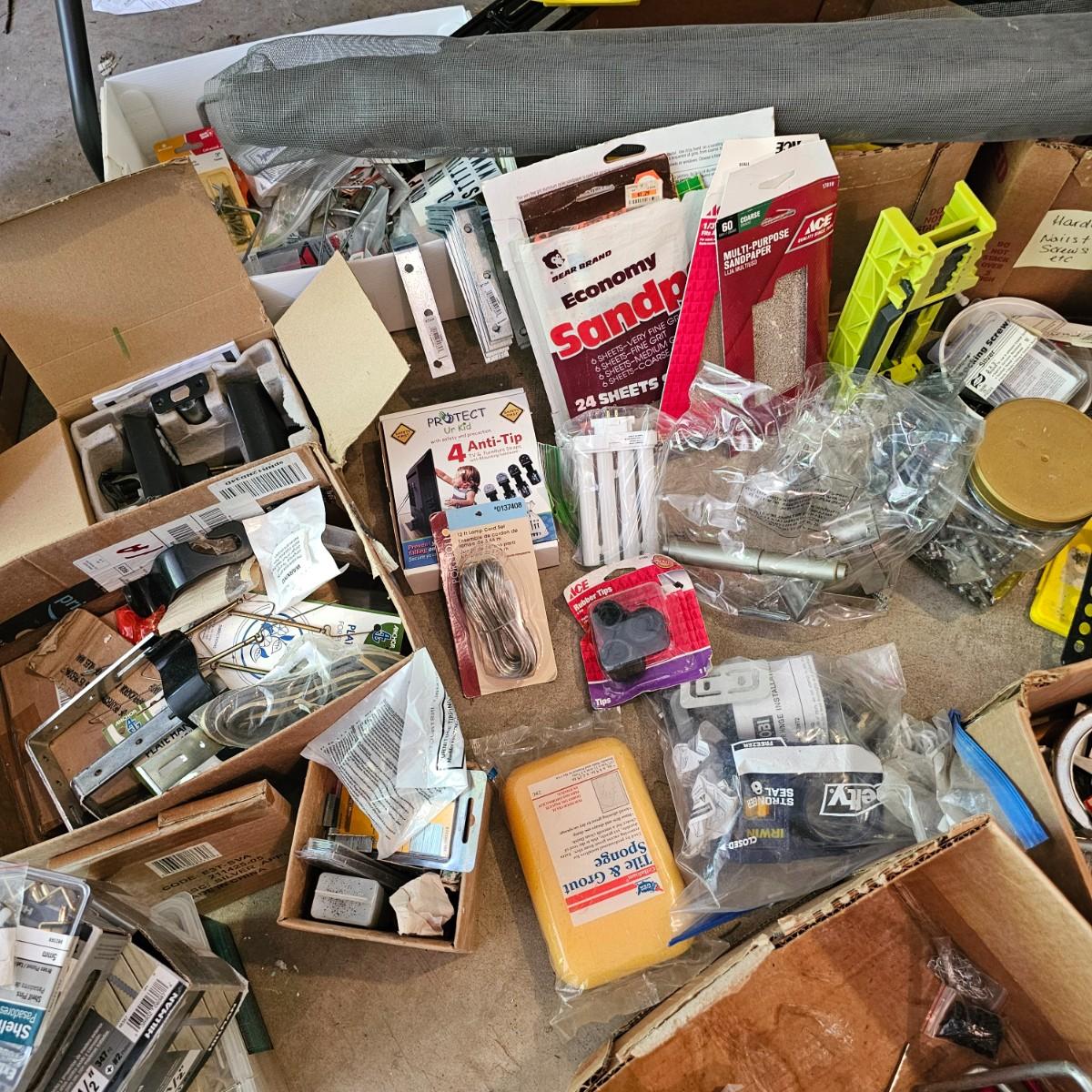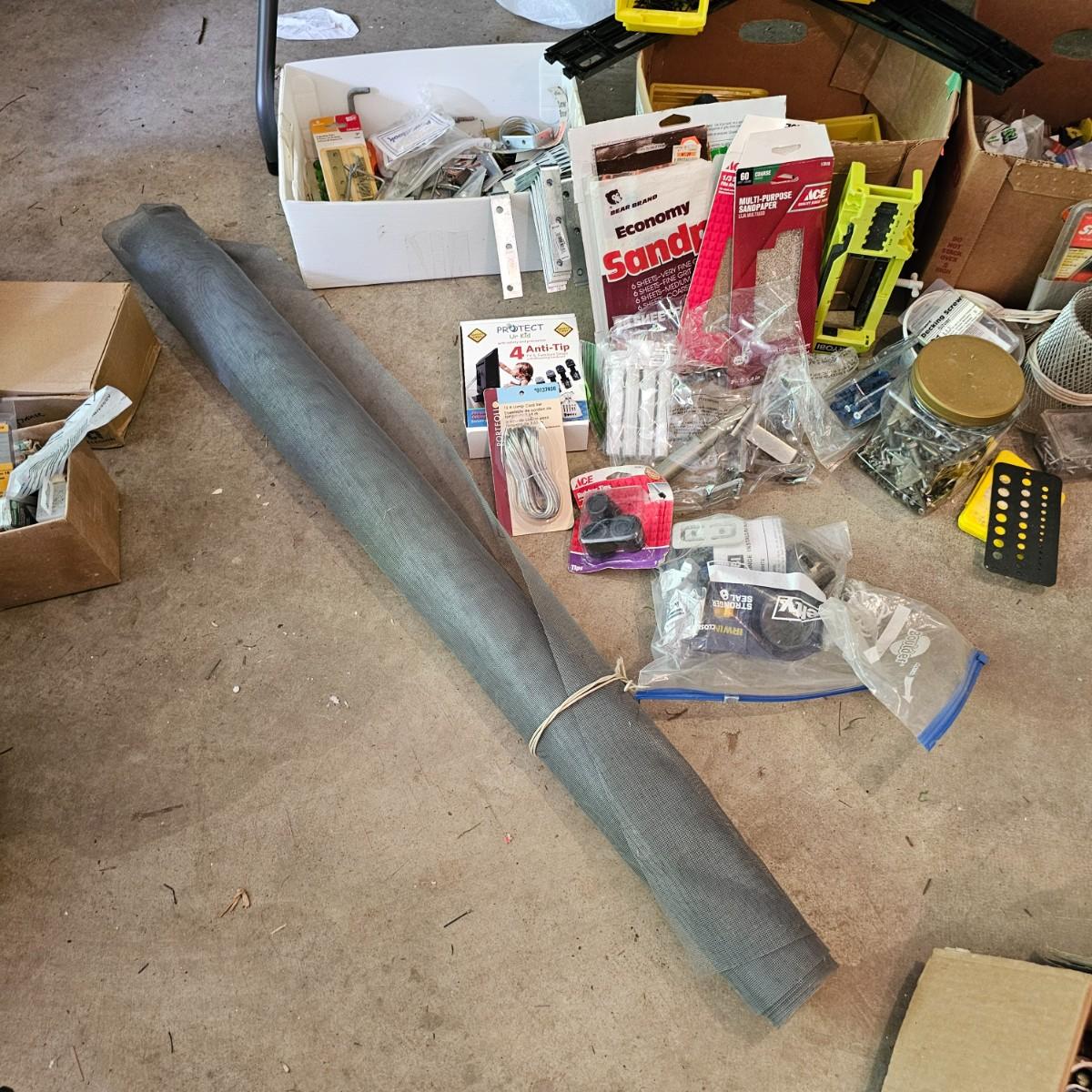 All the hardware you could ever want. Screws, nails, bolts, wire, tape, brackets, hooks, lots more. Eight boxes of this and that to go through and discover hidden treasures. One partial roll of fiberglass screen, length indeterminate. See photos for details. Local pickup only.
