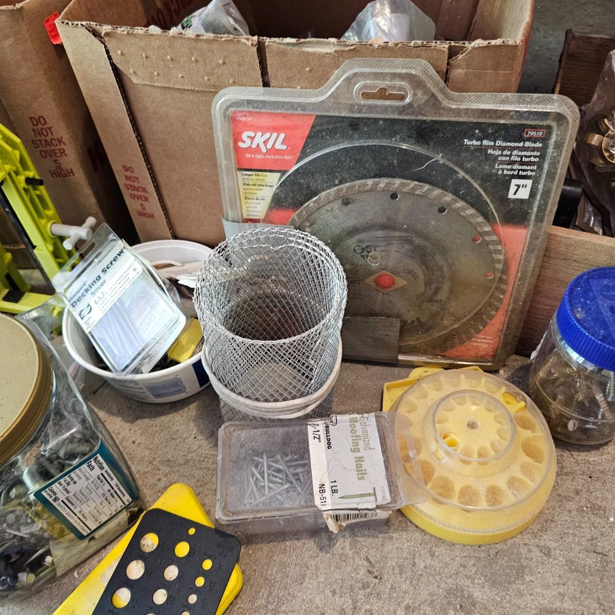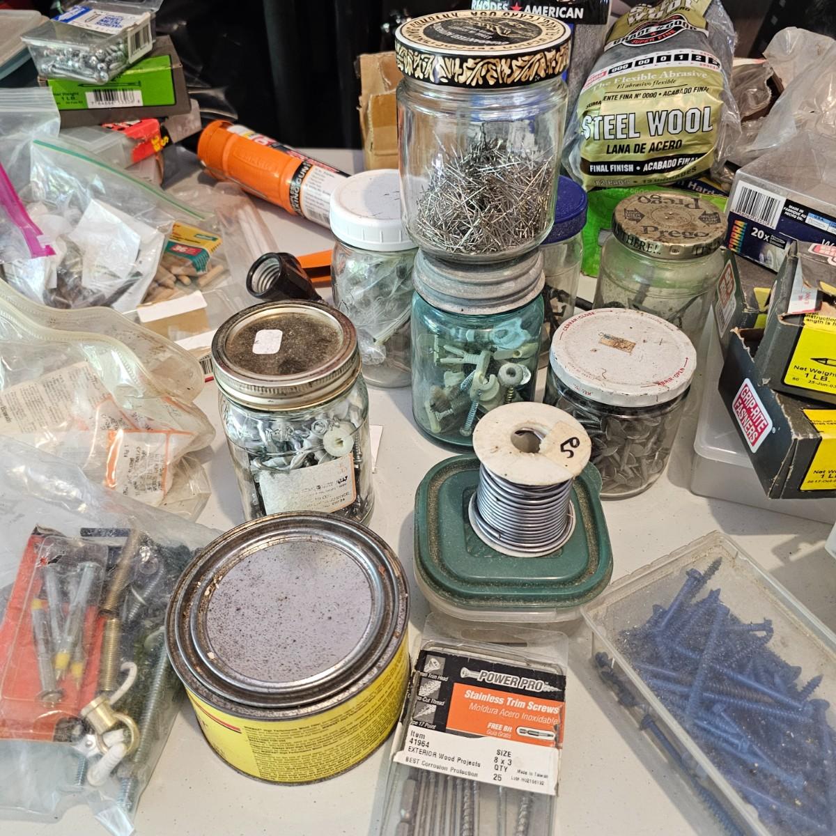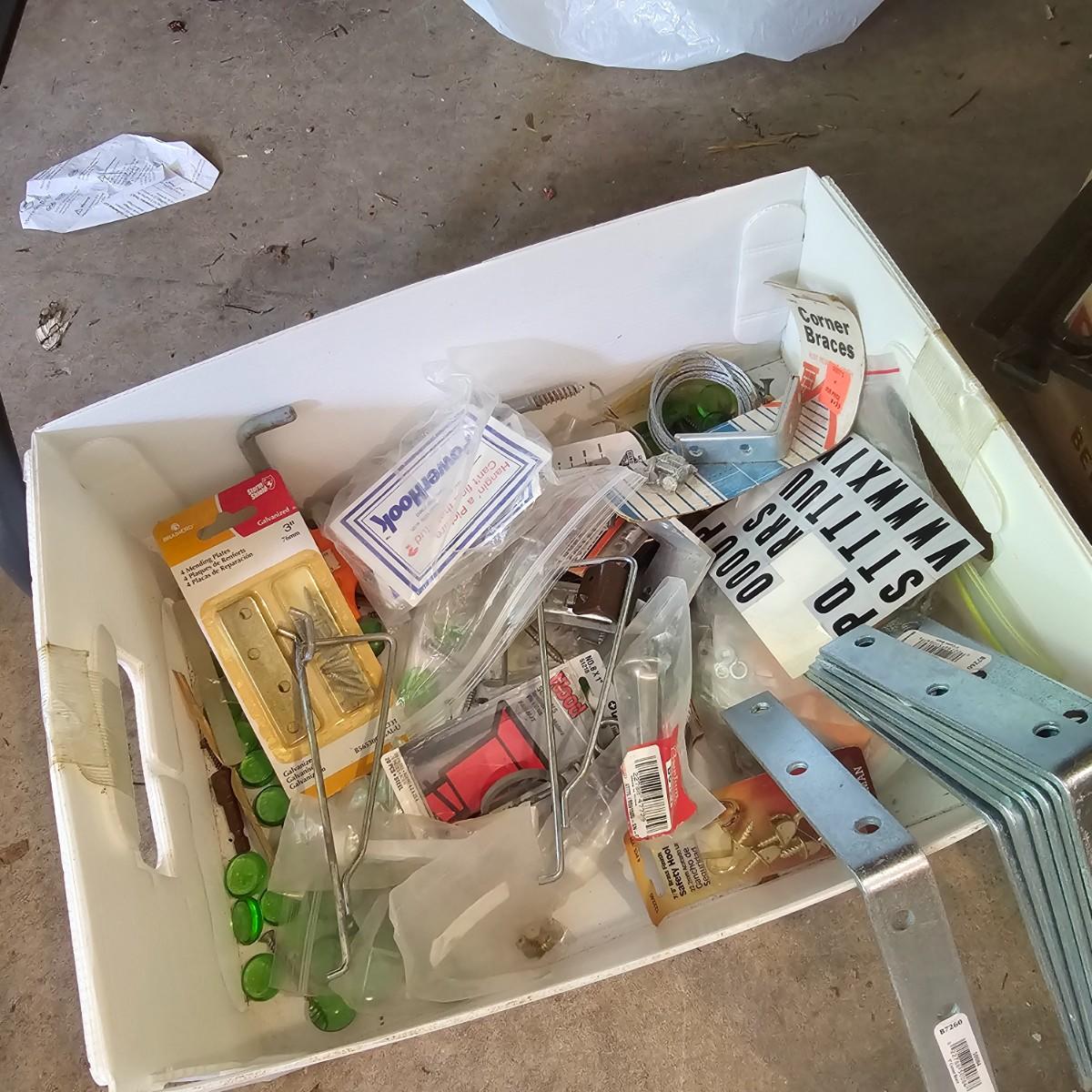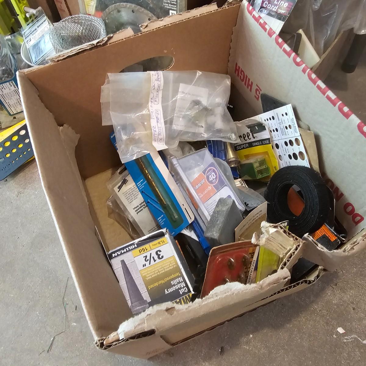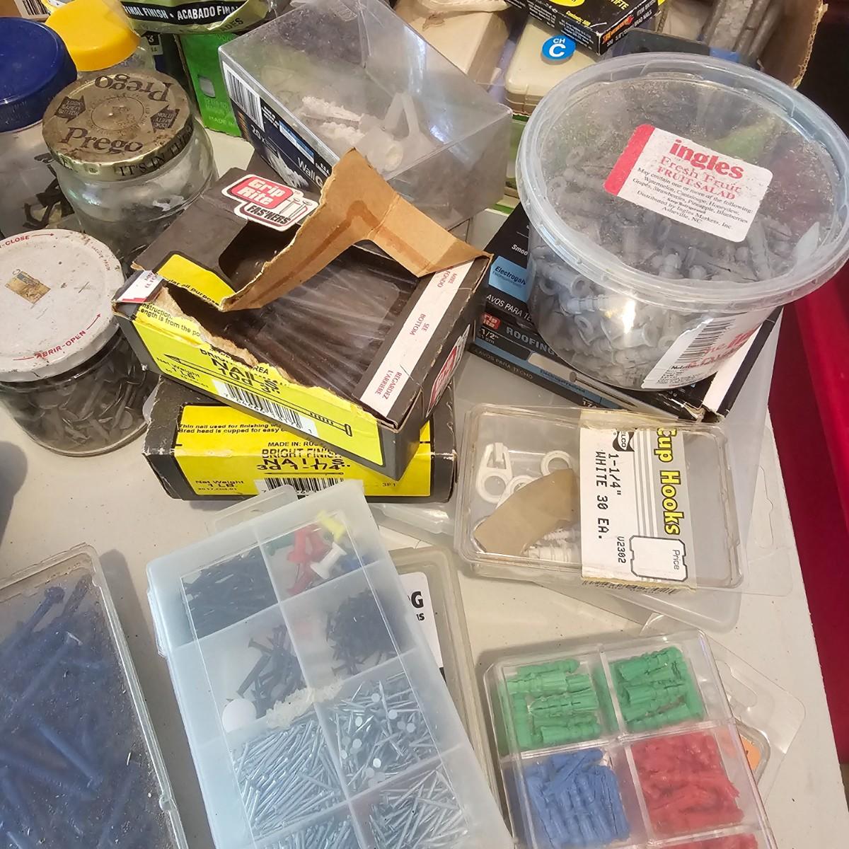 All the hardware you could ever want. Screws, nails, bolts, wire, tape, brackets, hooks, lots more. Eight boxes of this and that to go through and discover hidden treasures. One partial roll of fiberglass screen, length indeterminate. See photos for details. Local pickup only.