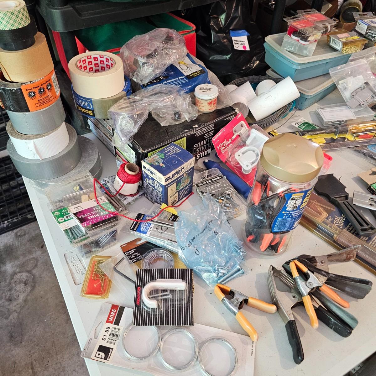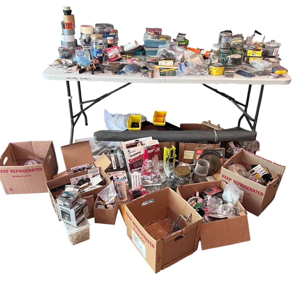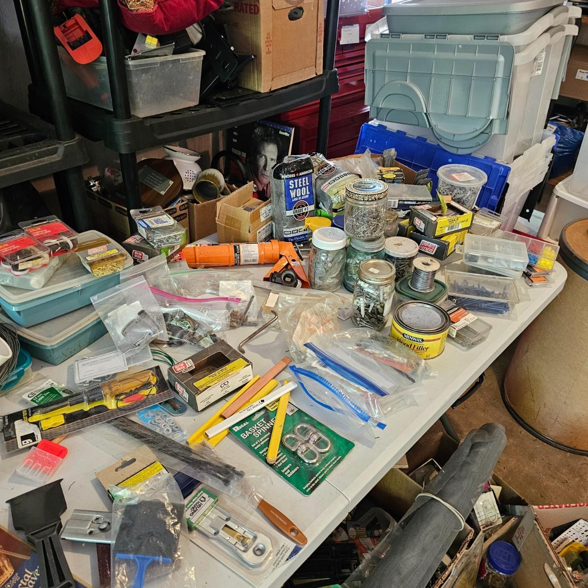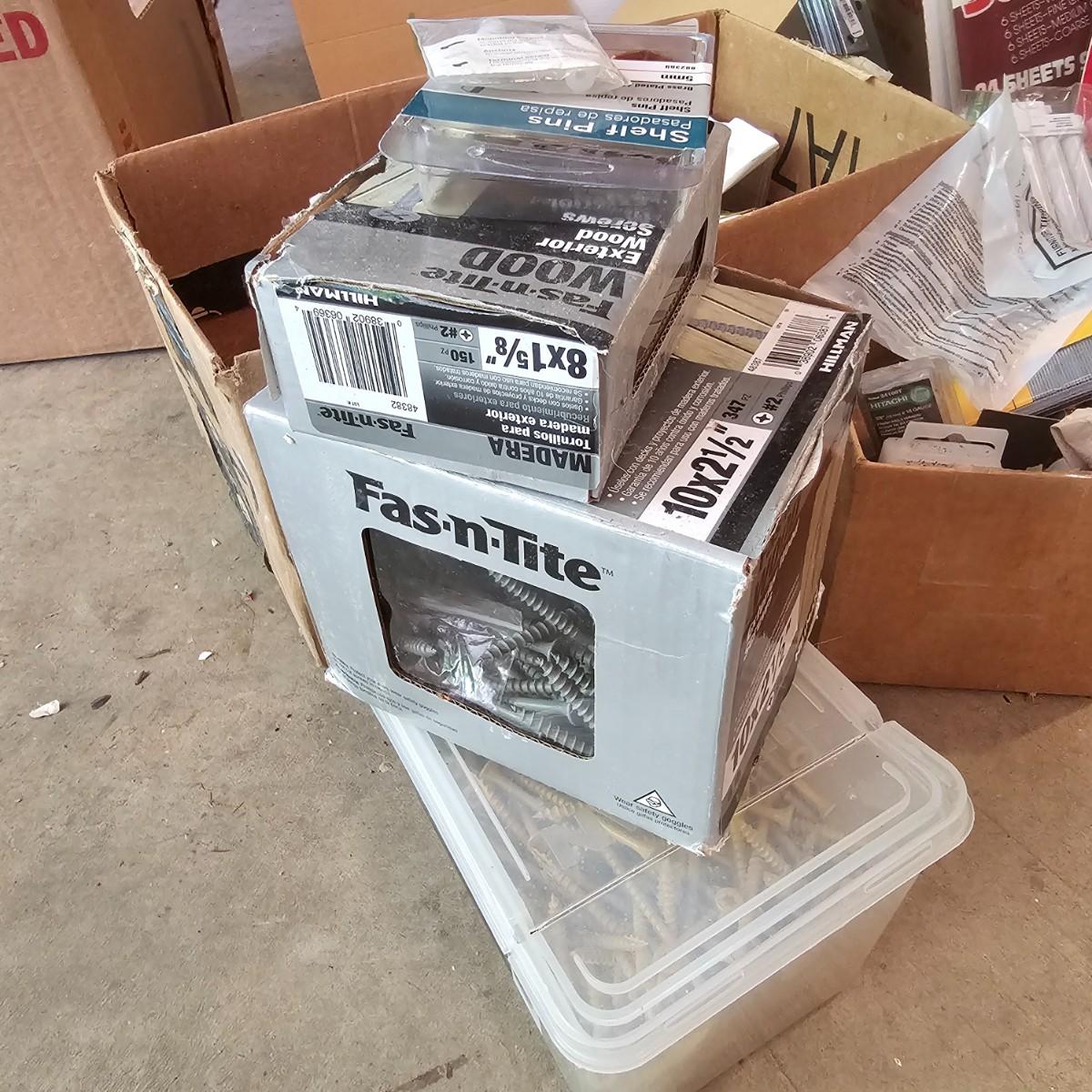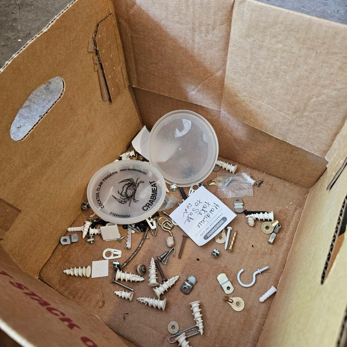 All the hardware you could ever want. Screws, nails, bolts, wire, tape, brackets, hooks, lots more. Eight boxes of this and that to go through and discover hidden treasures. One partial roll of fiberglass screen, length indeterminate. See photos for details. Local pickup only.