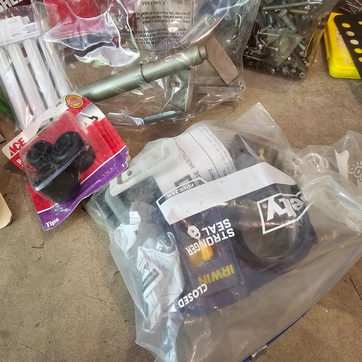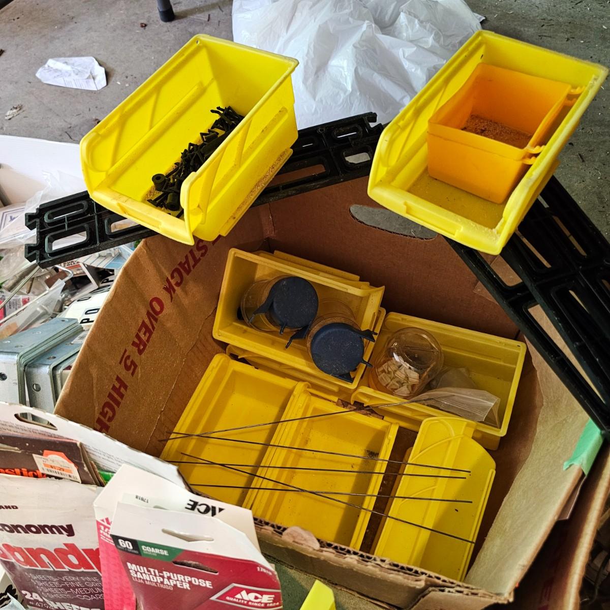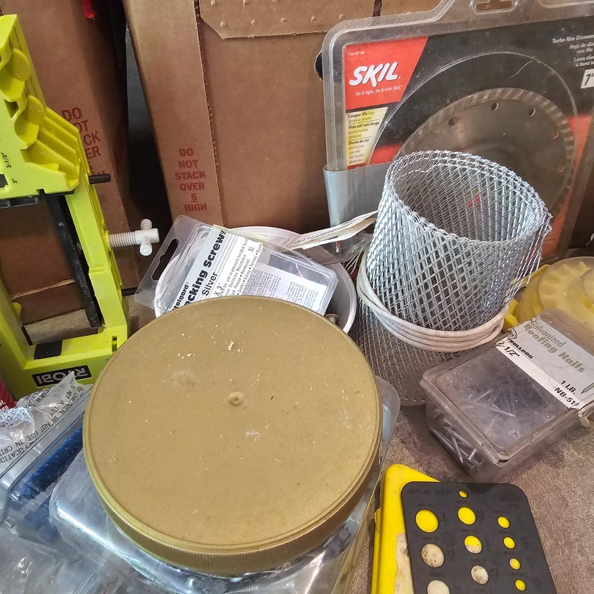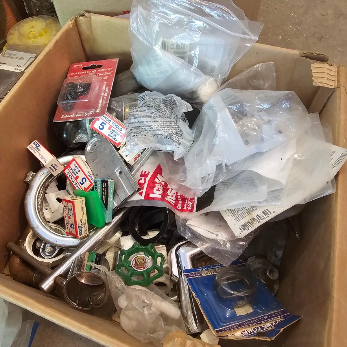 All the hardware you could ever want. Screws, nails, bolts, wire, tape, brackets, hooks, lots more. Eight boxes of this and that to go through and discover hidden treasures. One partial roll of fiberglass screen, length indeterminate. See photos for details. Local pickup only.