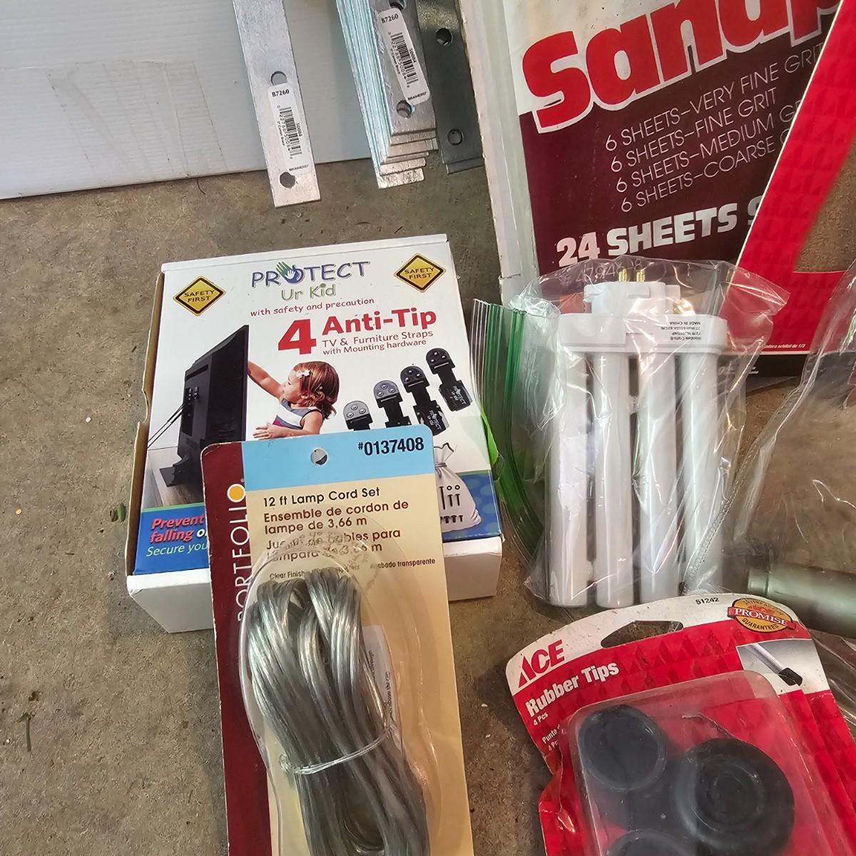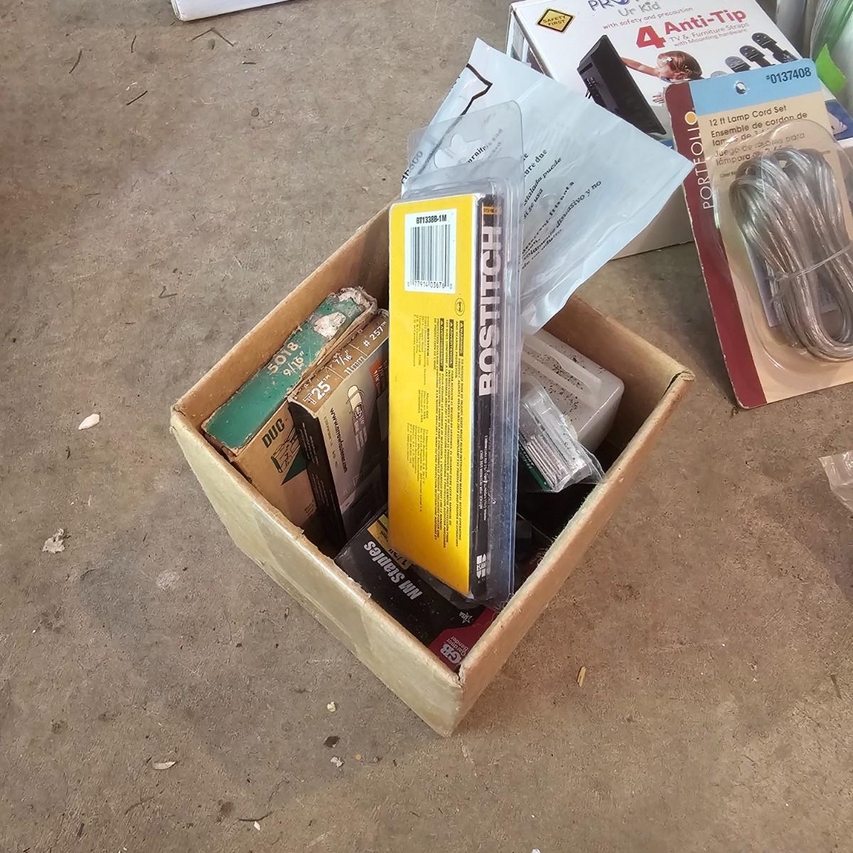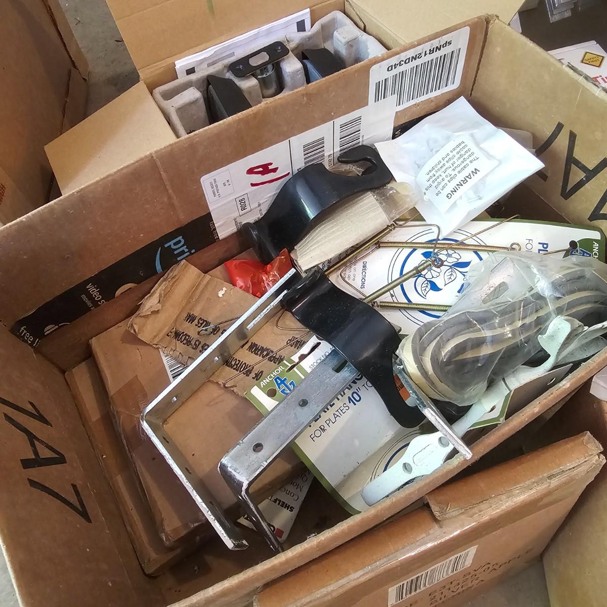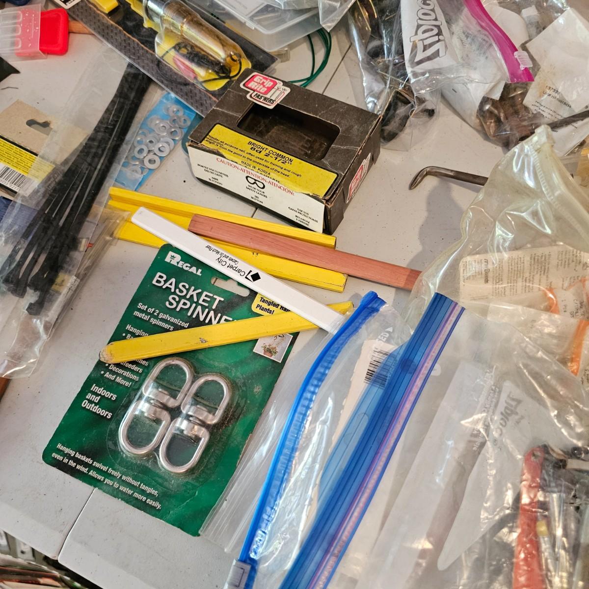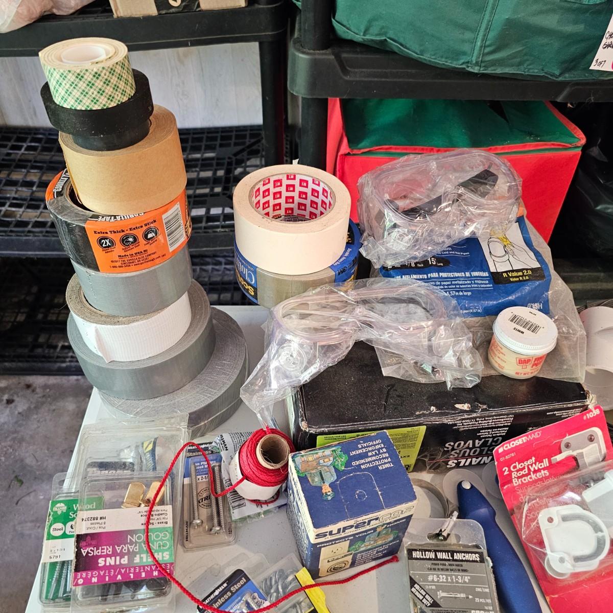 All the hardware you could ever want. Screws, nails, bolts, wire, tape, brackets, hooks, lots more. Eight boxes of this and that to go through and discover hidden treasures. One partial roll of fiberglass screen, length indeterminate. See photos for details. Local pickup only.