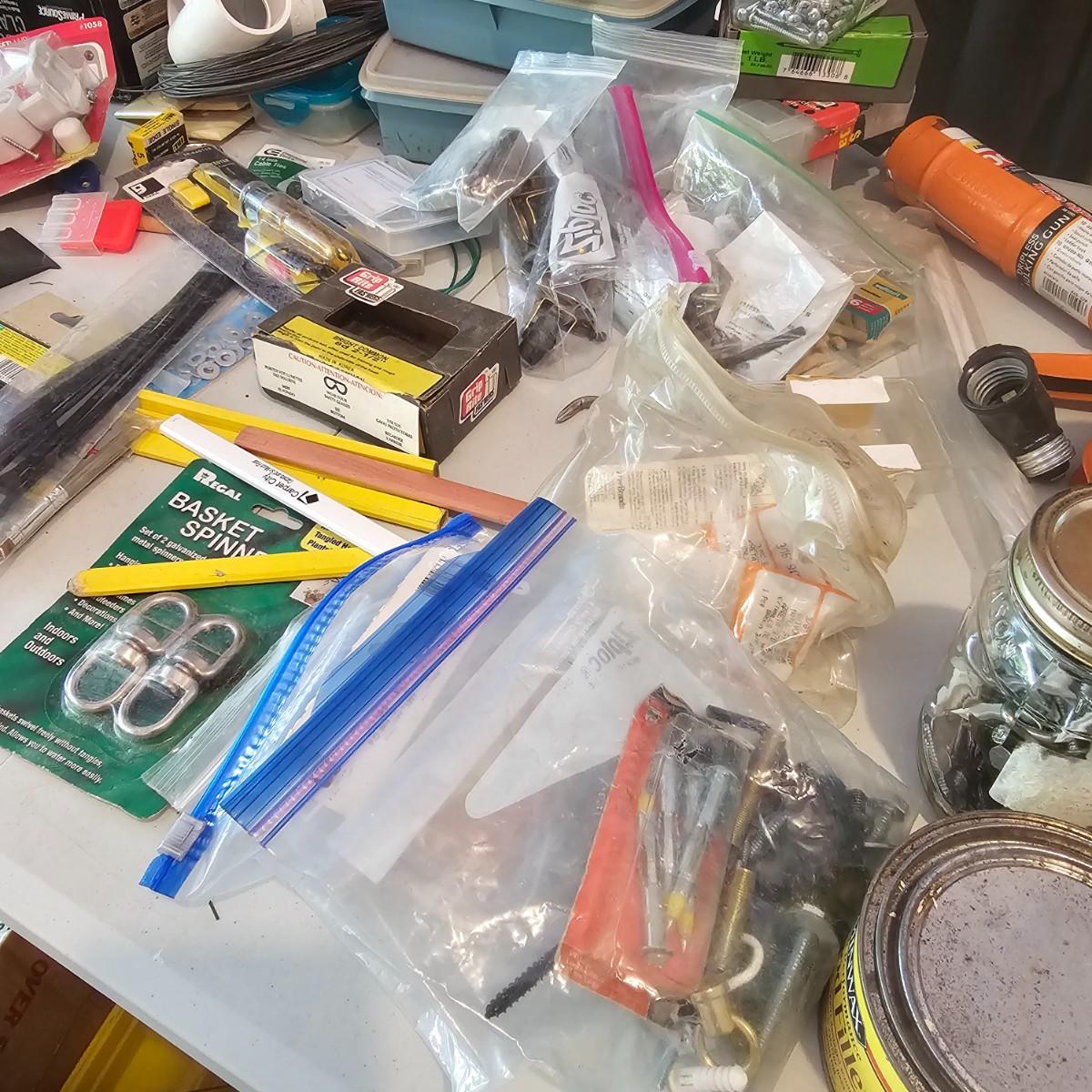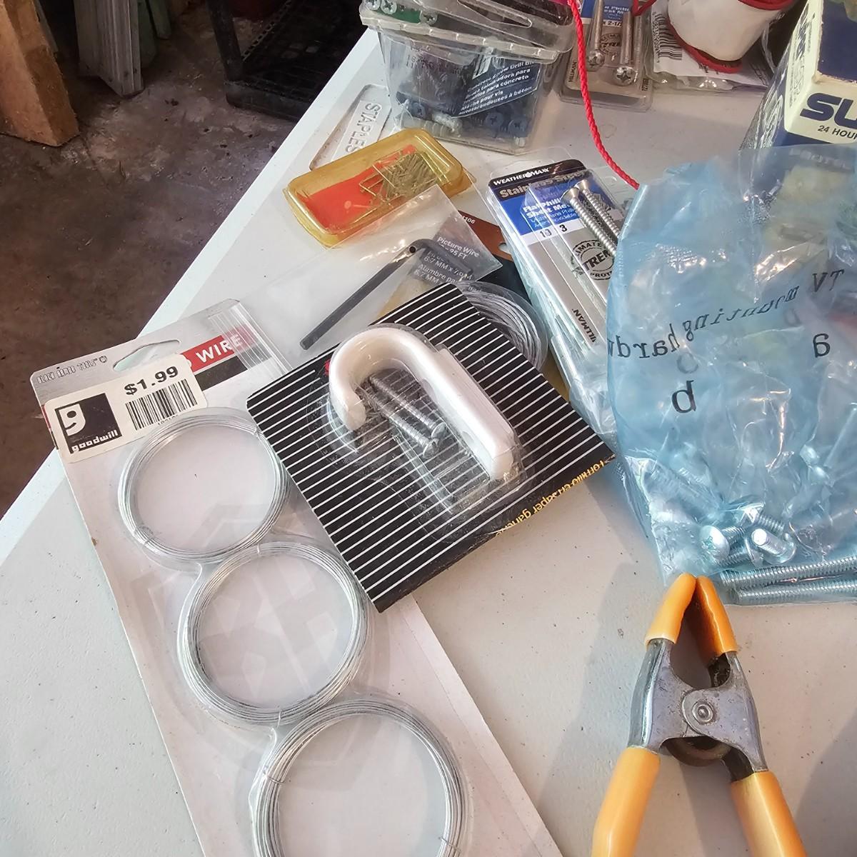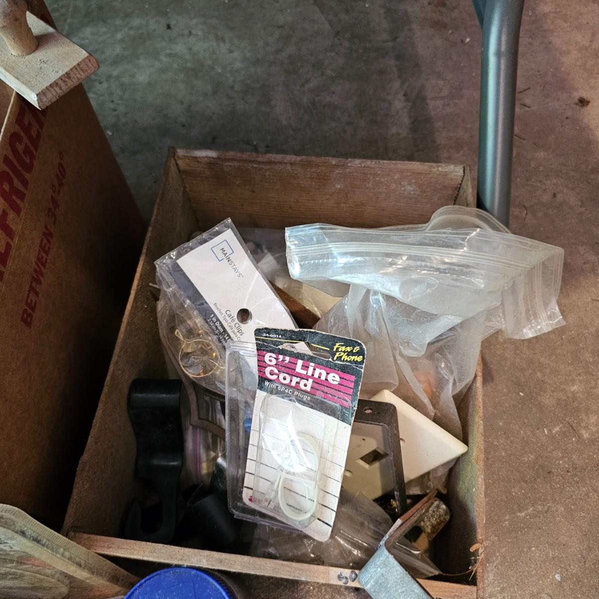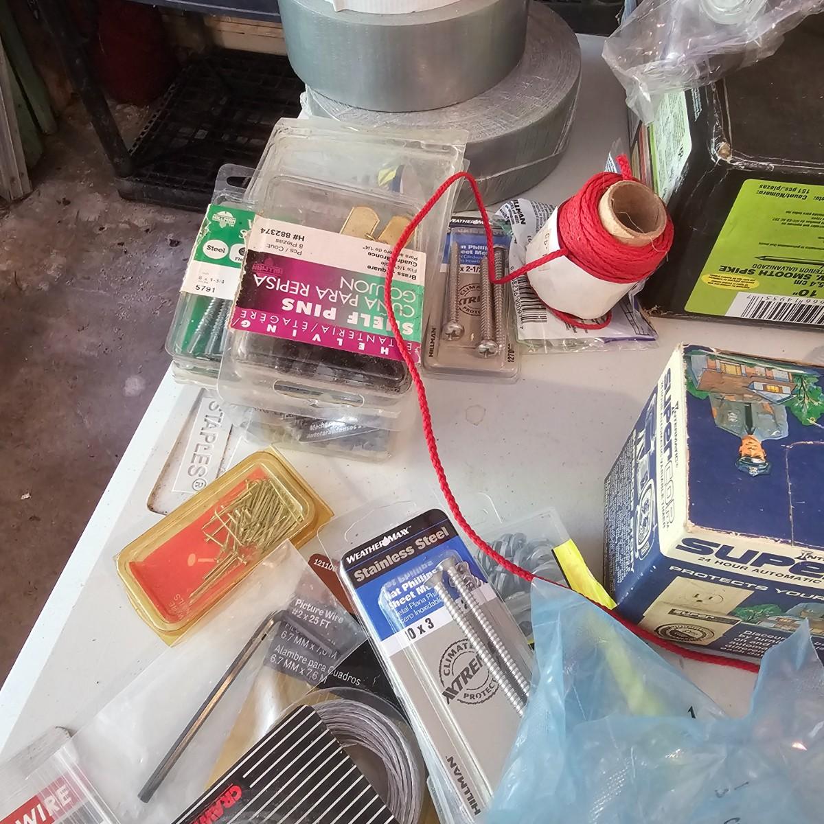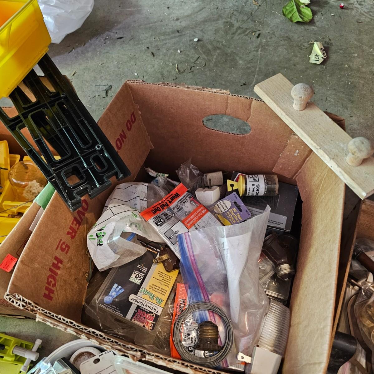 All the hardware you could ever want. Screws, nails, bolts, wire, tape, brackets, hooks, lots more. Eight boxes of this and that to go through and discover hidden treasures. One partial roll of fiberglass screen, length indeterminate. See photos for details. Local pickup only.