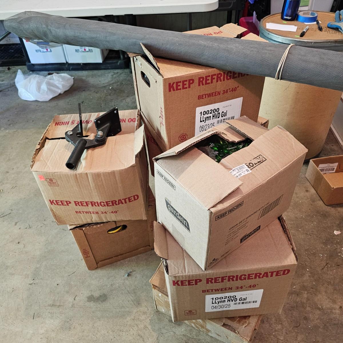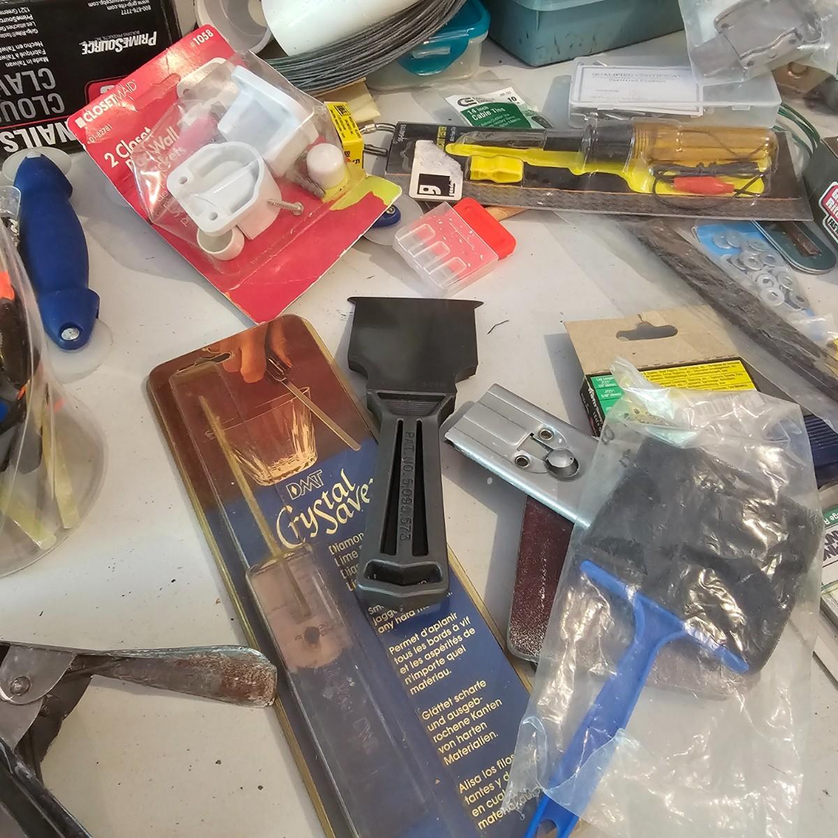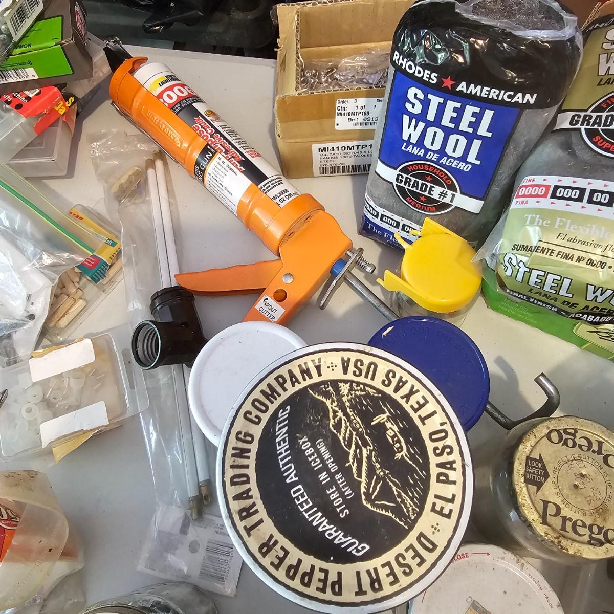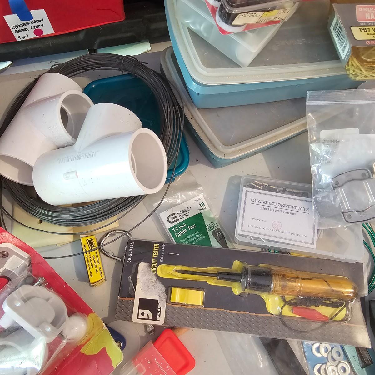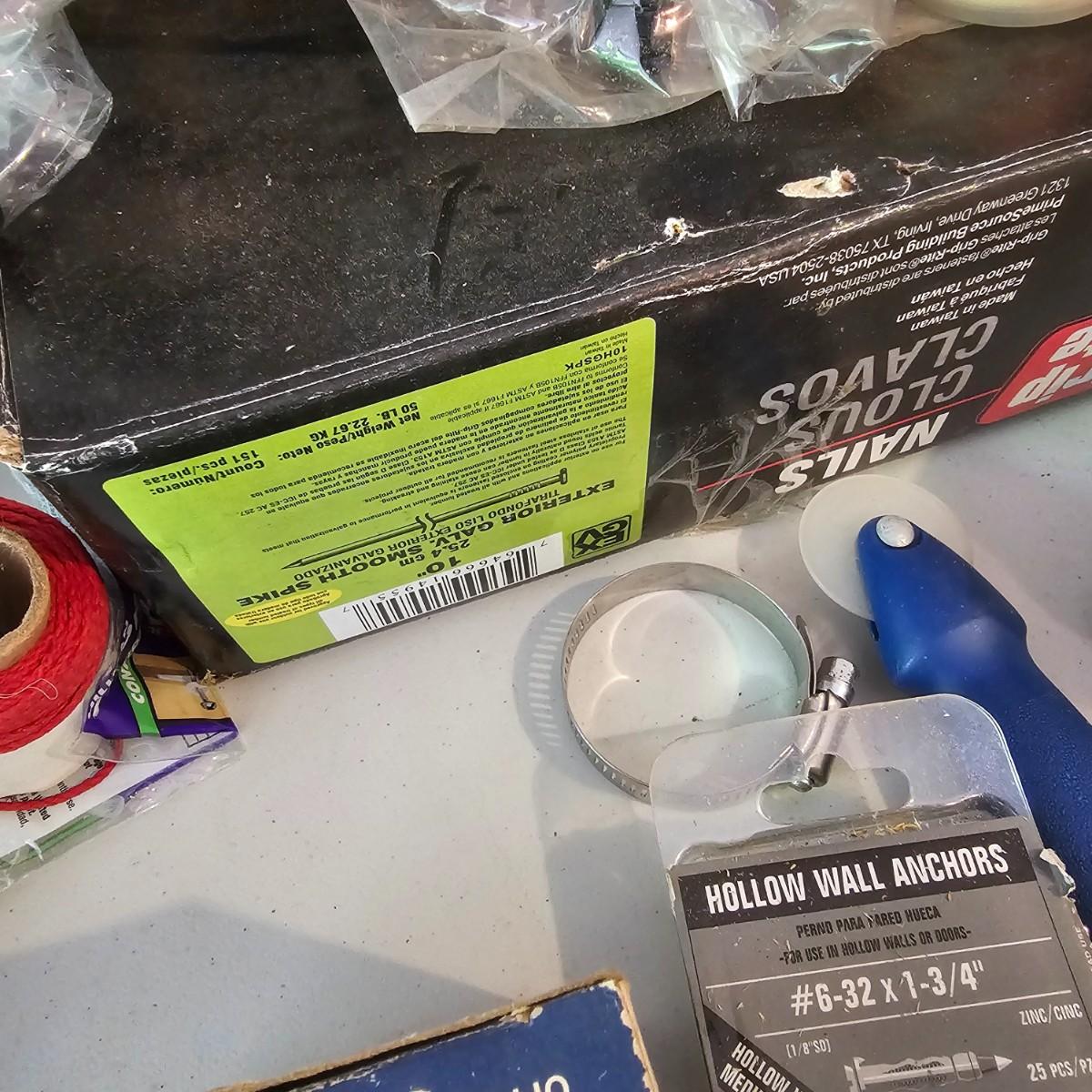 All the hardware you could ever want. Screws, nails, bolts, wire, tape, brackets, hooks, lots more. Eight boxes of this and that to go through and discover hidden treasures. One partial roll of fiberglass screen, length indeterminate. See photos for details. Local pickup only.