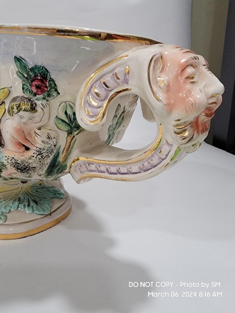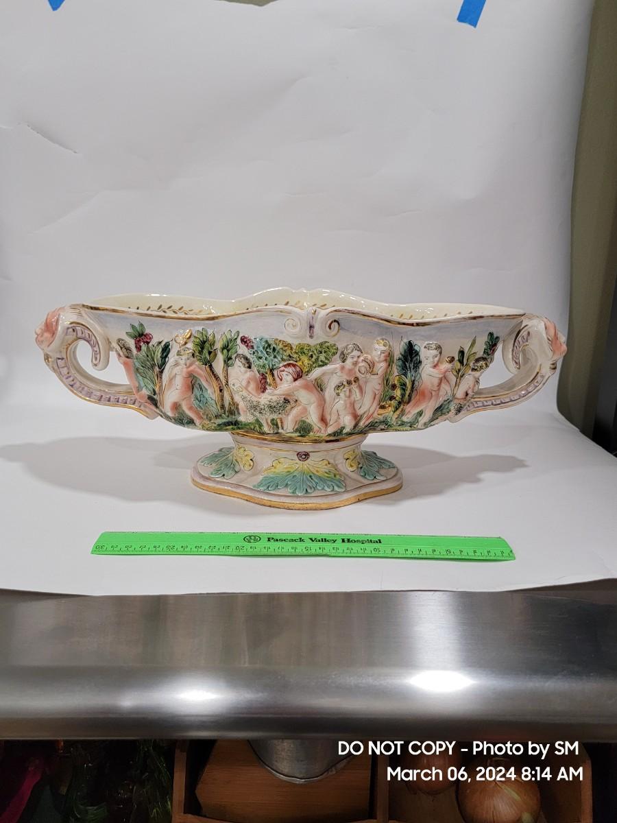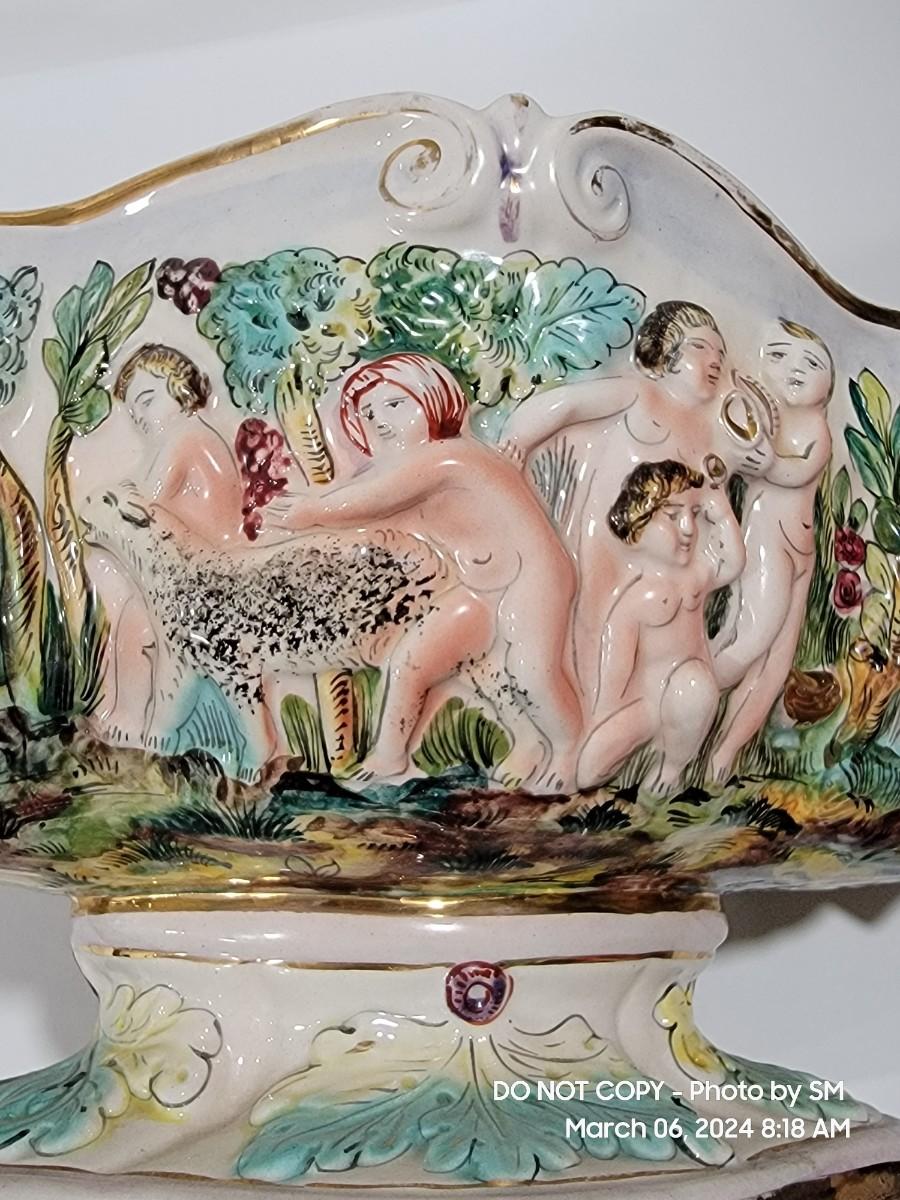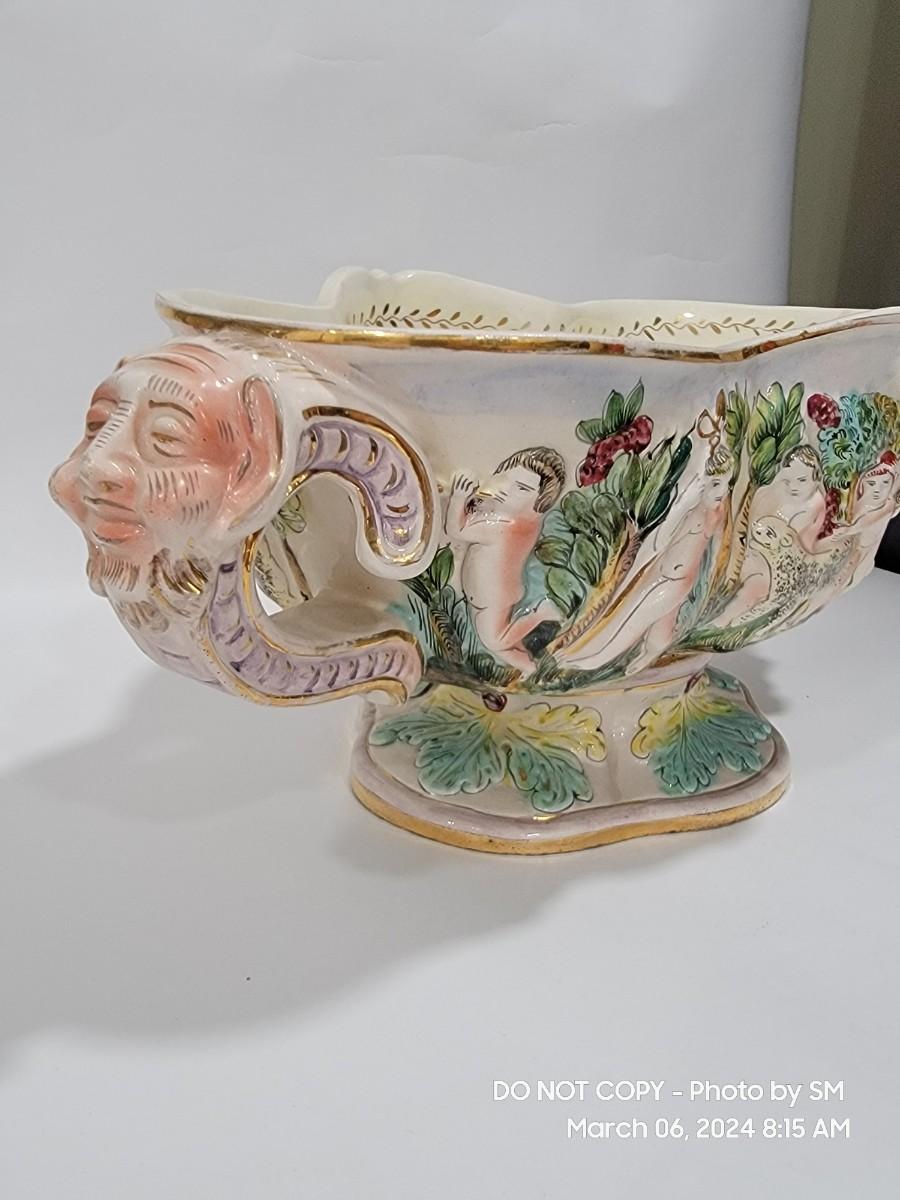 This extraordinary vintage piece is very capodimonte, it looks like it was signed on the bottom, which has faded. Unsure of who actually made it, ient purchased this in an antique shop decades ago. The bowl is very large, along both sides it has nude figural / people with animals, and the handles are faces with horns (devils face?). Some gold rubbing off and inside has some yellowing. This is an exotic piece of heavy porcelain- handpainted has gold gilt, vibrant colors. Truly exquisite! No cracks or chips. But as mentioned it has minor imperfections.