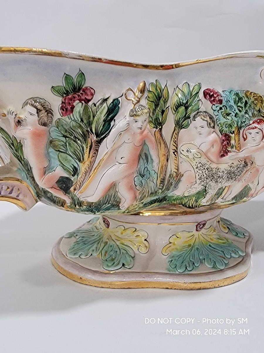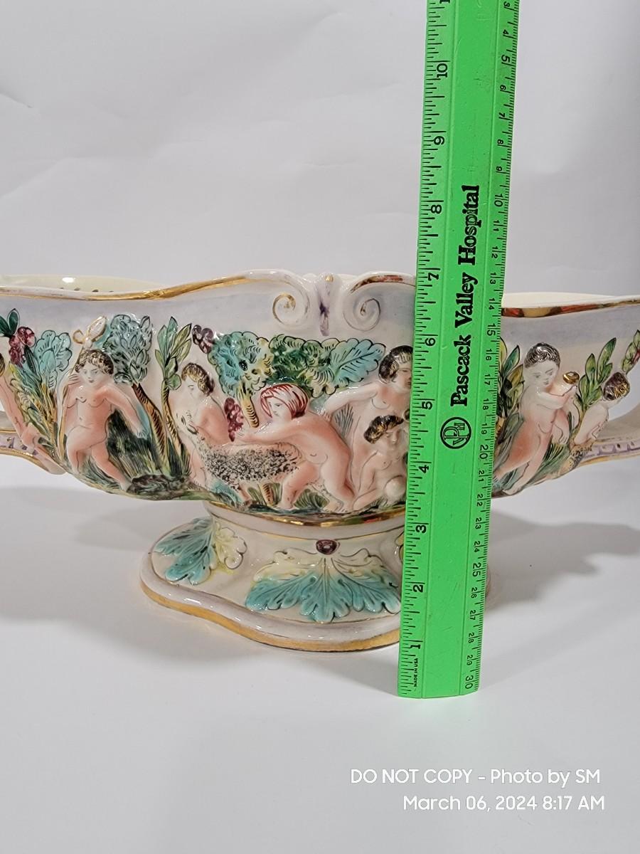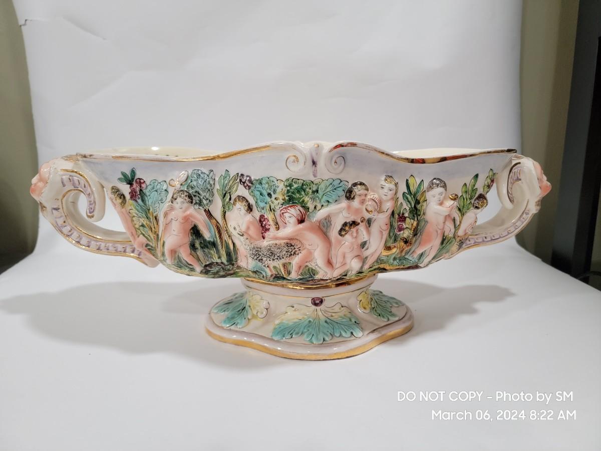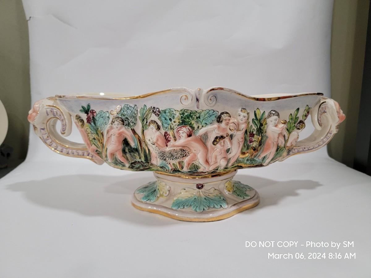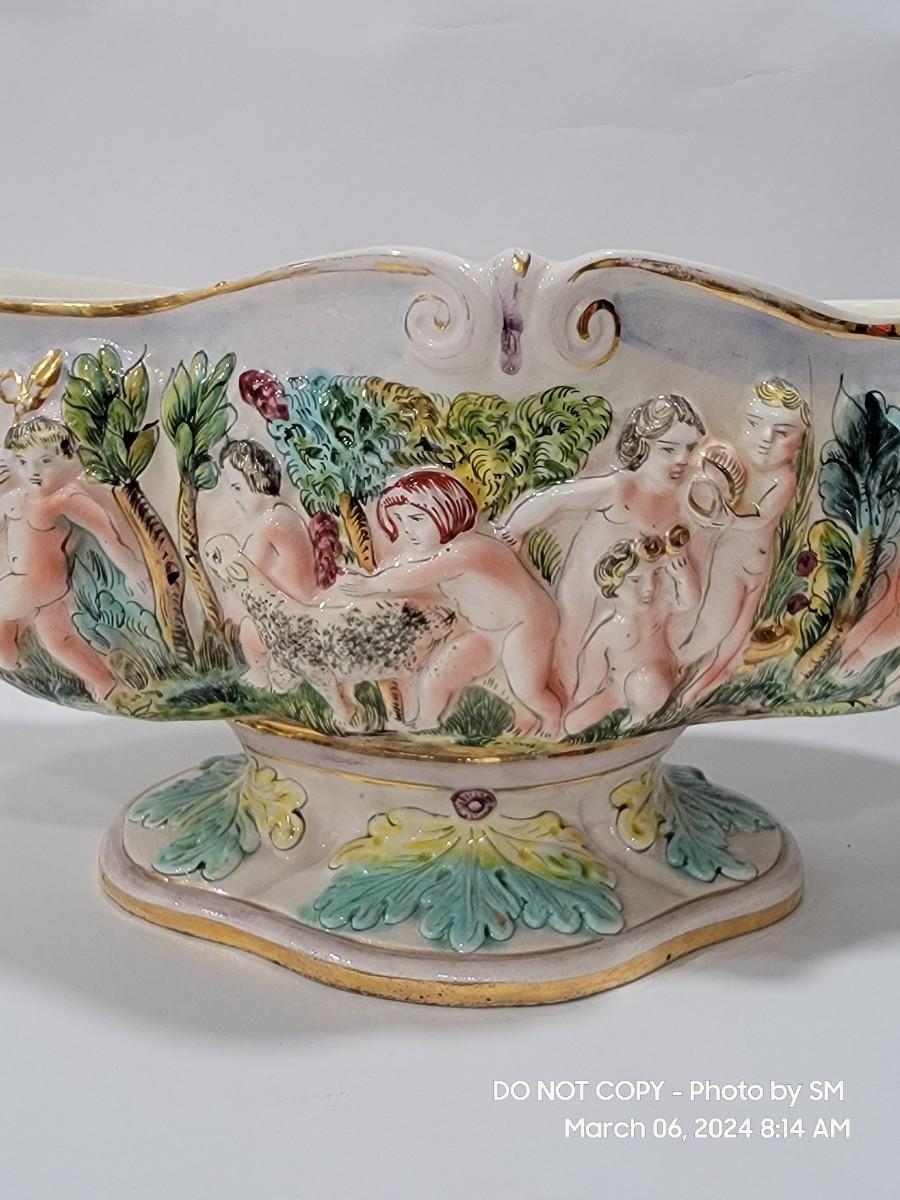This extraordinary vintage piece is very capodimonte, it looks like it was signed on the bottom, which has faded. Unsure of who actually made it, ient purchased this in an antique shop decades ago. The bowl is very large, along both sides it has nude figural / people with animals, and the handles are faces with horns (devils face?). Some gold rubbing off and inside has some yellowing. This is an exotic piece of heavy porcelain- handpainted has gold gilt, vibrant colors. Truly exquisite! No cracks or chips. But as mentioned it has minor imperfections.