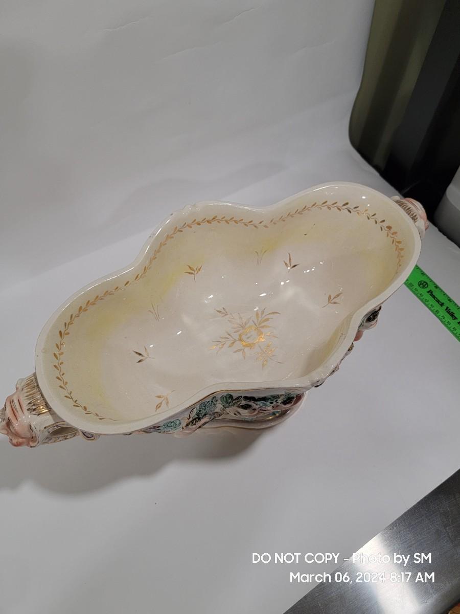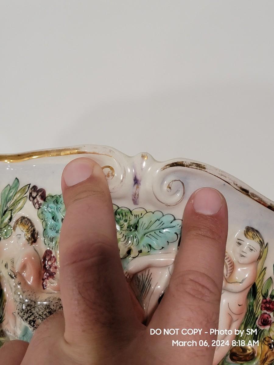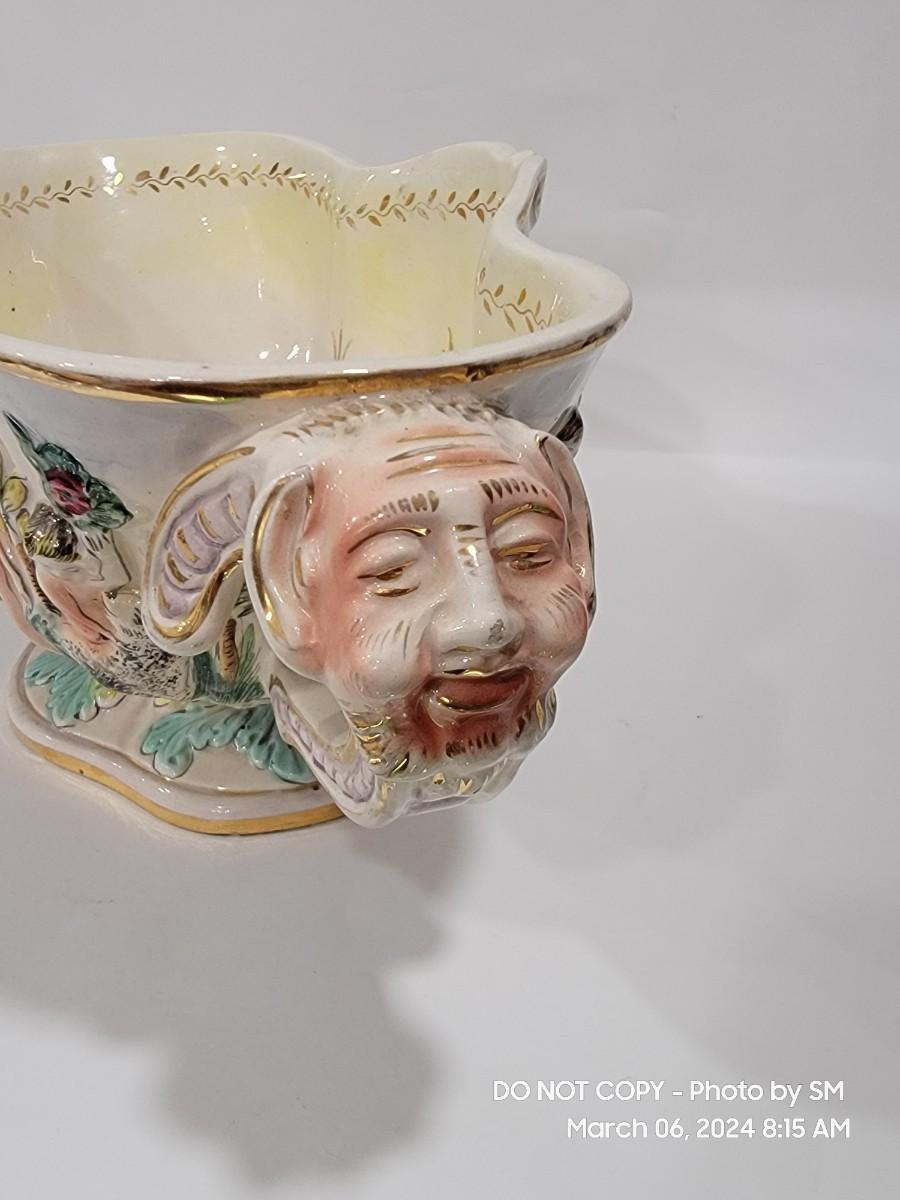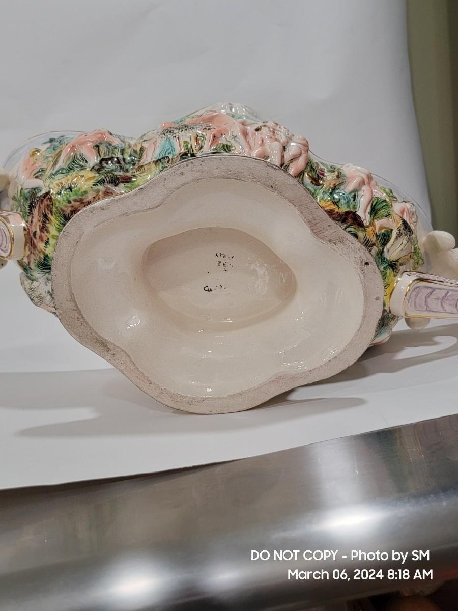 This extraordinary vintage piece is very capodimonte, it looks like it was signed on the bottom, which has faded. Unsure of who actually made it, ient purchased this in an antique shop decades ago. The bowl is very large, along both sides it has nude figural / people with animals, and the handles are faces with horns (devils face?). Some gold rubbing off and inside has some yellowing. This is an exotic piece of heavy porcelain- handpainted has gold gilt, vibrant colors. Truly exquisite! No cracks or chips. But as mentioned it has minor imperfections.