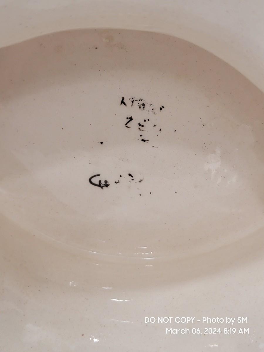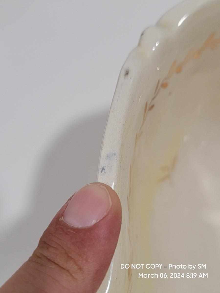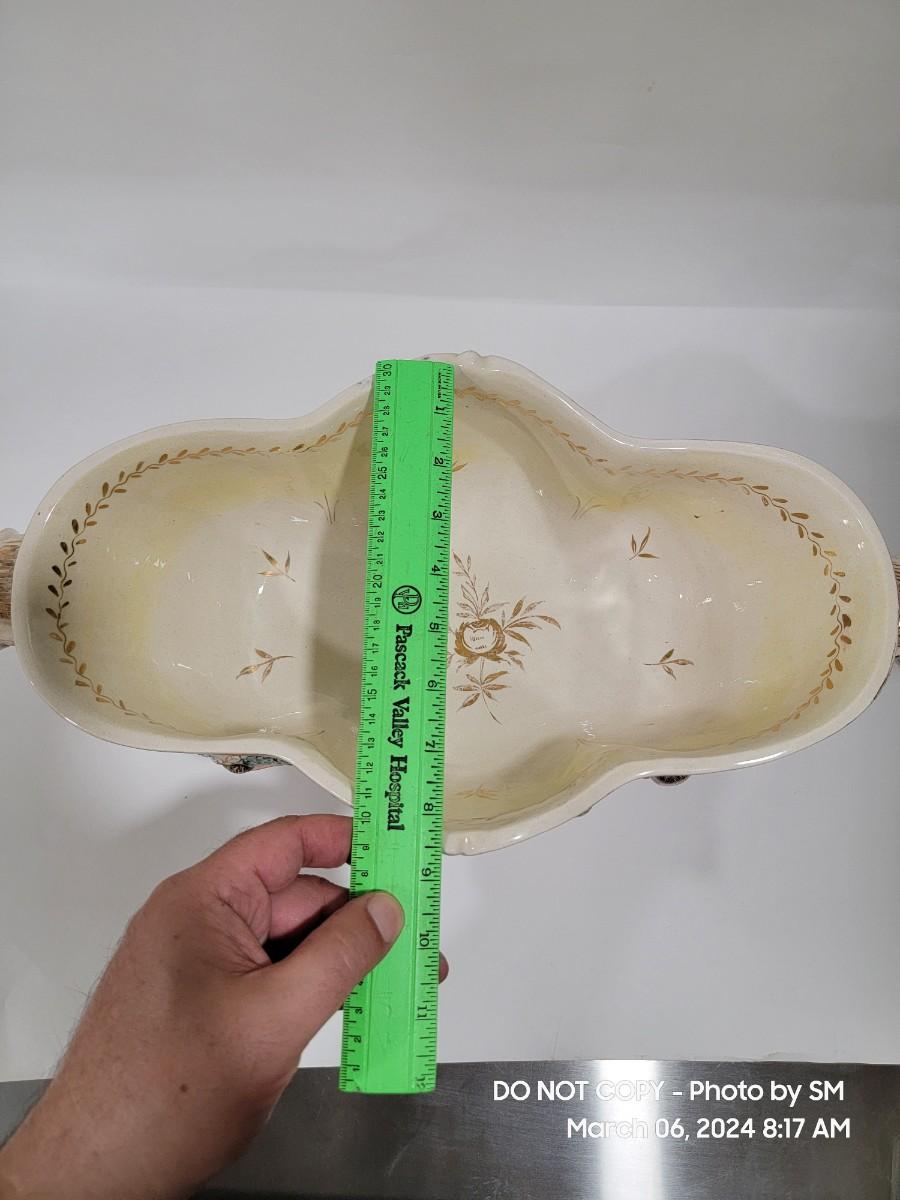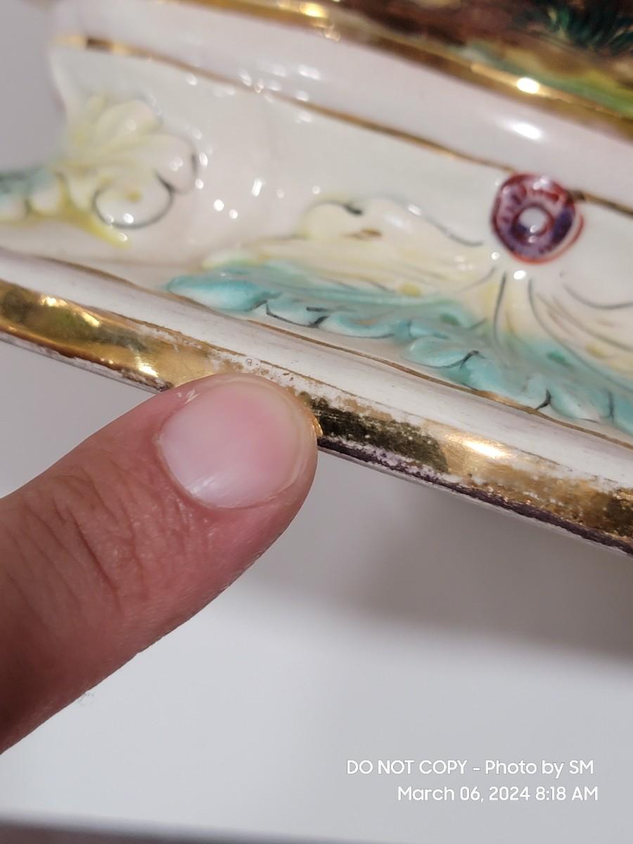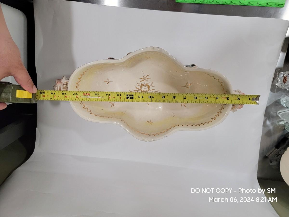 This extraordinary vintage piece is very capodimonte, it looks like it was signed on the bottom, which has faded. Unsure of who actually made it, ient purchased this in an antique shop decades ago. The bowl is very large, along both sides it has nude figural / people with animals, and the handles are faces with horns (devils face?). Some gold rubbing off and inside has some yellowing. This is an exotic piece of heavy porcelain- handpainted has gold gilt, vibrant colors. Truly exquisite! No cracks or chips. But as mentioned it has minor imperfections.