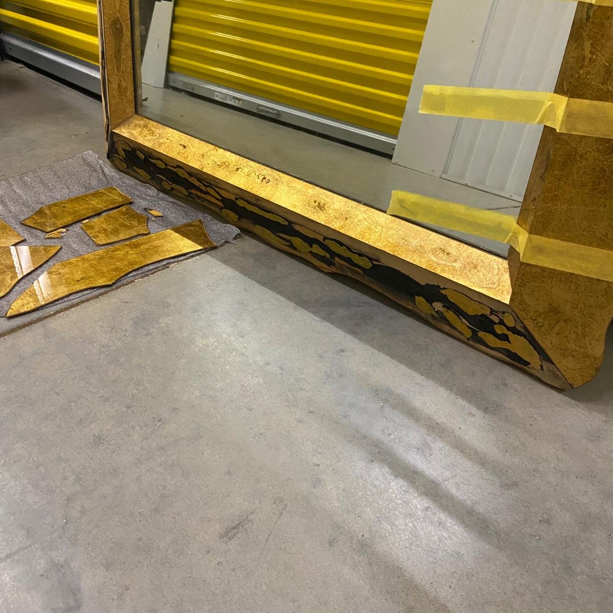 This large mirror stands 47” x 60” and comes out about 4” from the wall. The frame is a stunning metallic gold glass, however the glass is broken on the left and bottom of the frame. There are some pieces of the frame it will come with but the pieces seem to be enough to only cover one side (not the bottom). Local pickup only. Winning bidder must bring assistance to help move and load this item due to its weight and/or size.