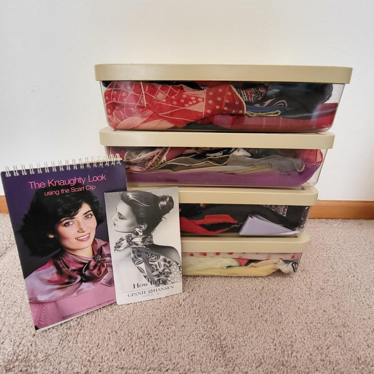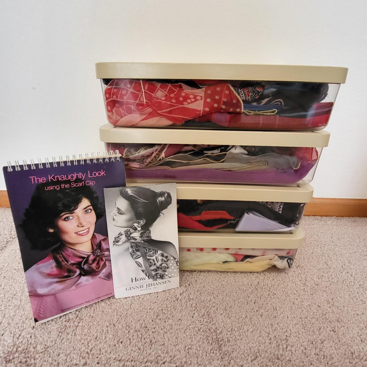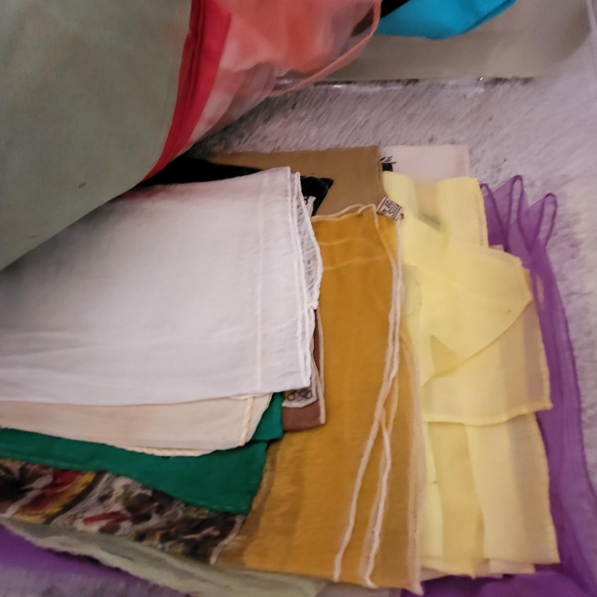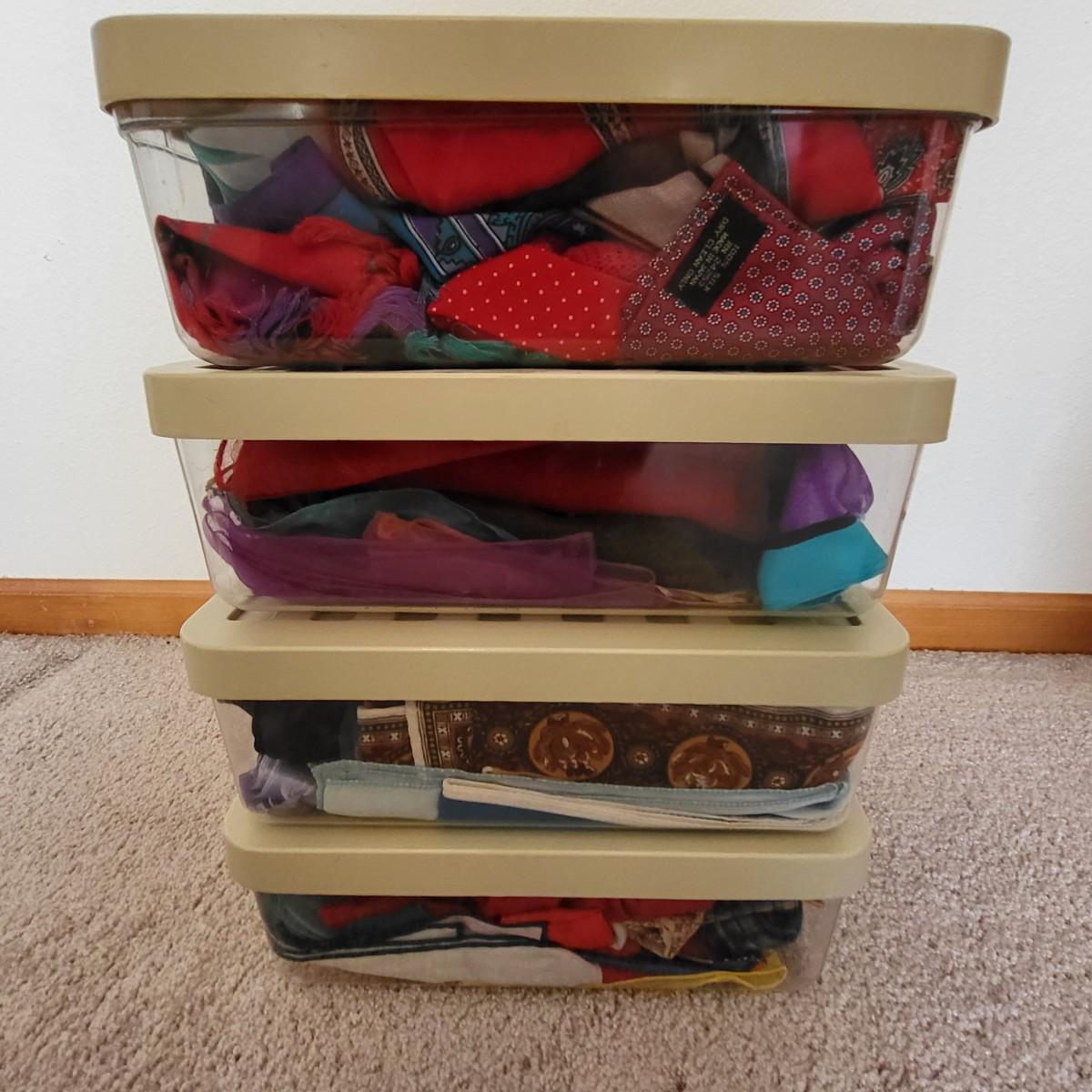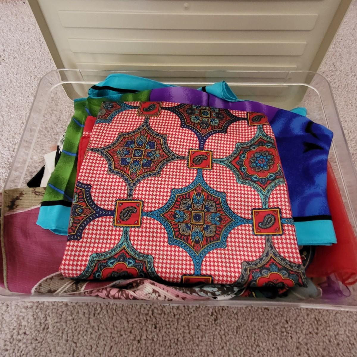 Silk, sheer, polyester and more. Huge variety of colors, styles and sizes. Four 12" x 10" lidded tubs filled with scarves. Comes with booklets on how to tie and use scarf clips.