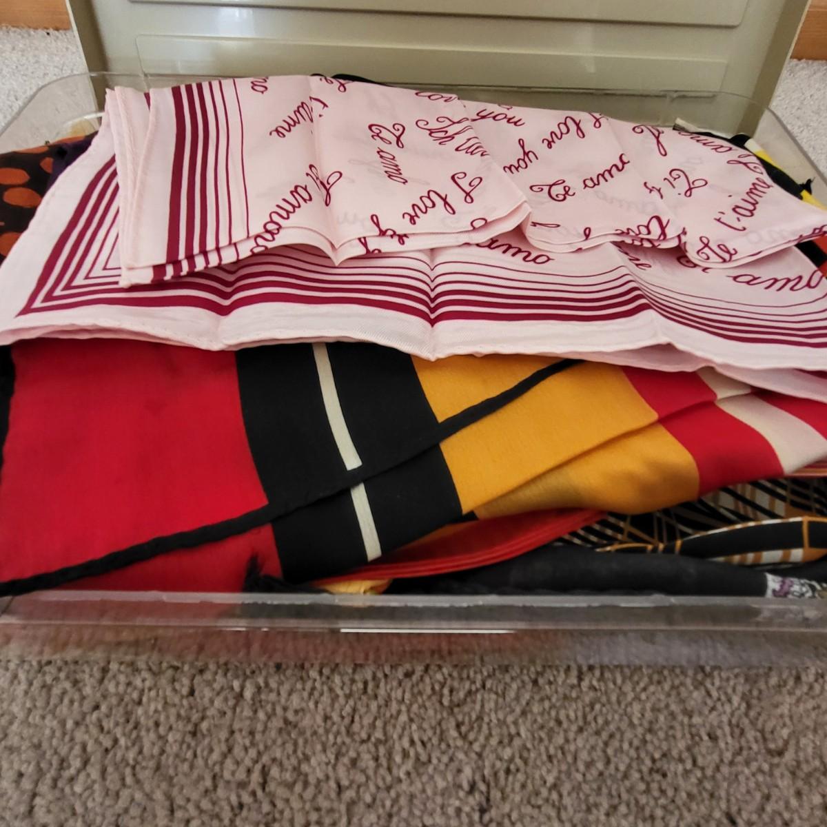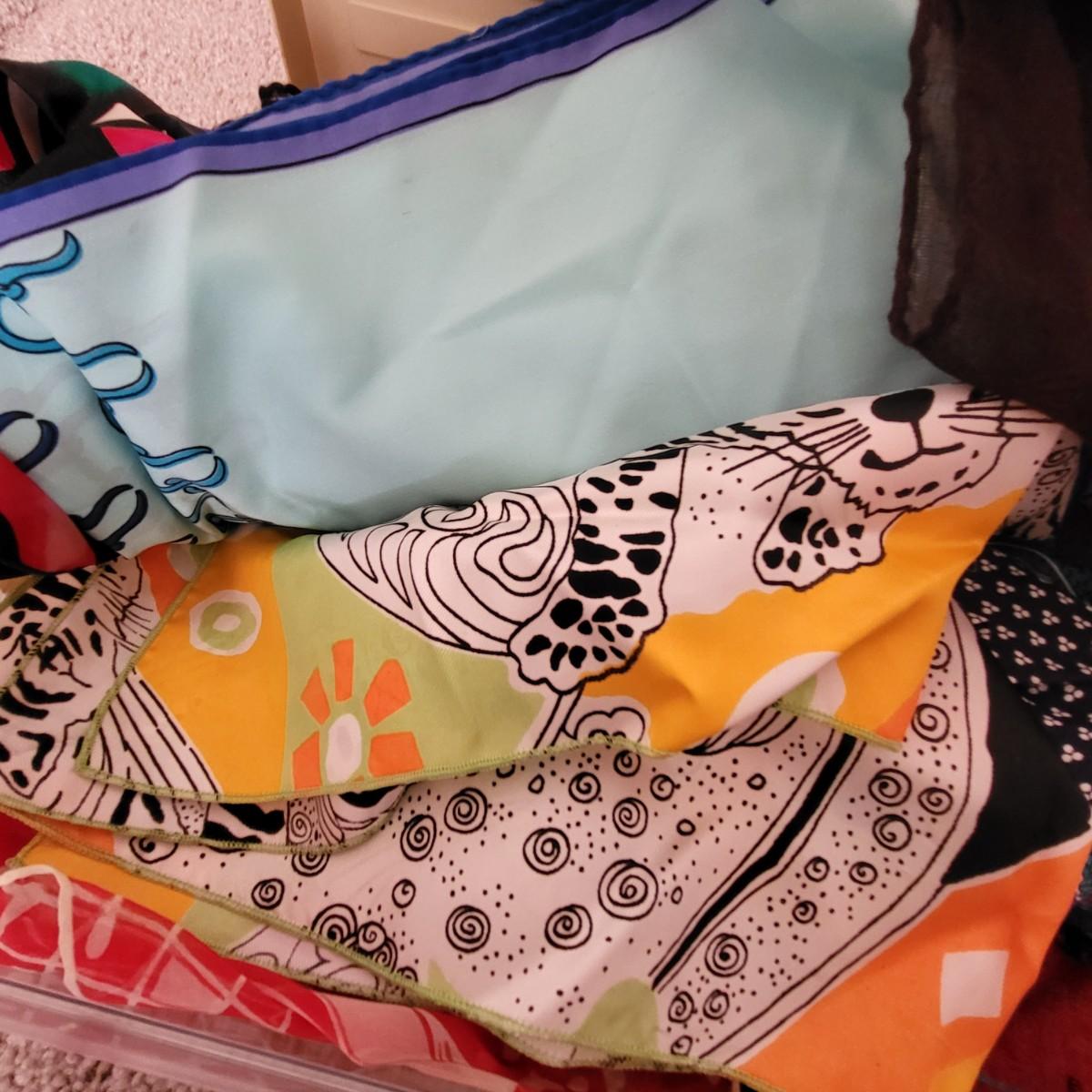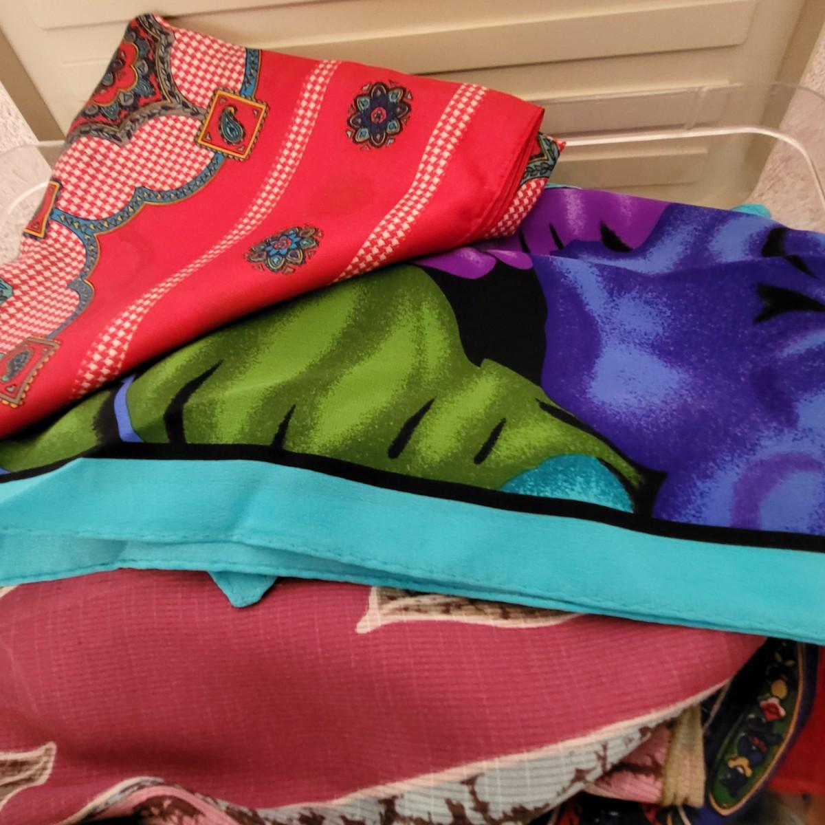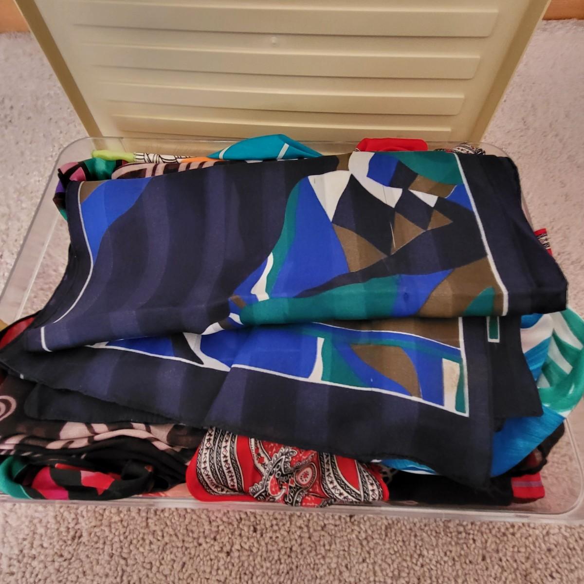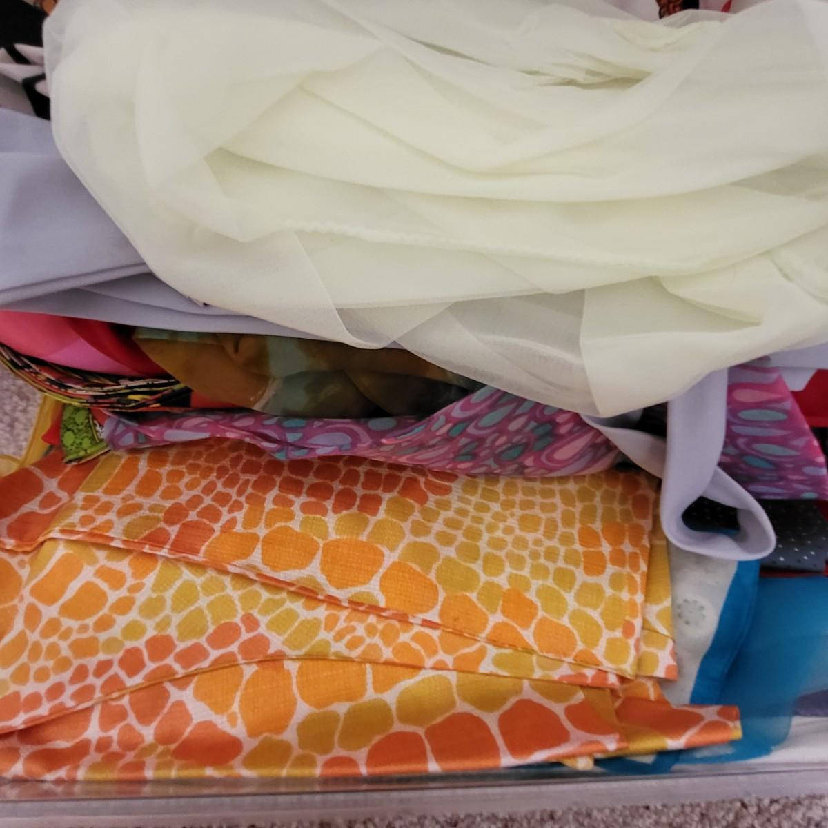 Silk, sheer, polyester and more. Huge variety of colors, styles and sizes. Four 12" x 10" lidded tubs filled with scarves. Comes with booklets on how to tie and use scarf clips.