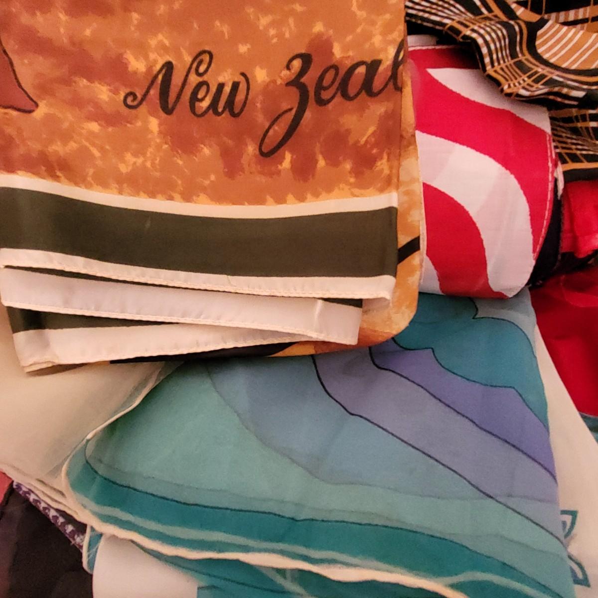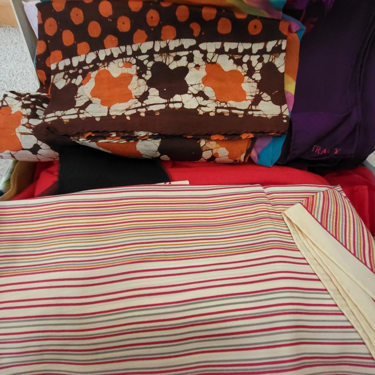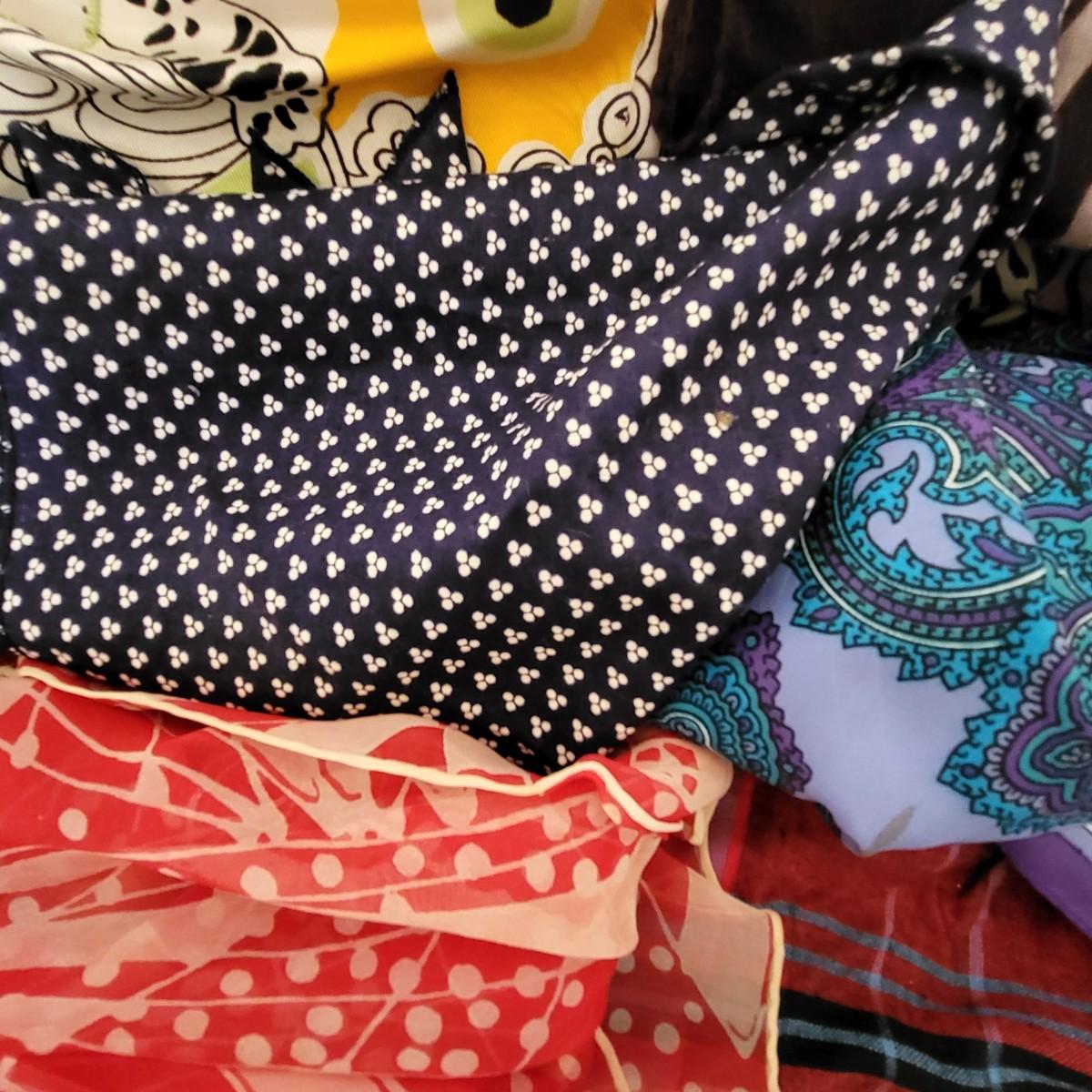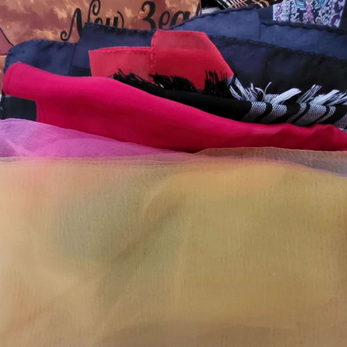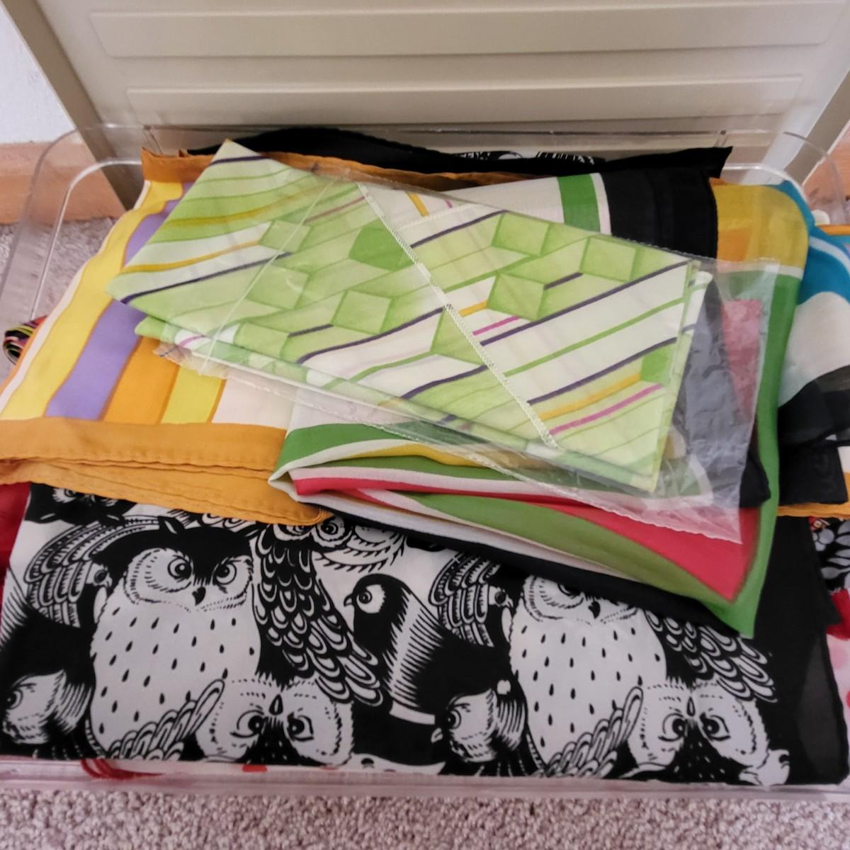 Silk, sheer, polyester and more. Huge variety of colors, styles and sizes. Four 12" x 10" lidded tubs filled with scarves. Comes with booklets on how to tie and use scarf clips.