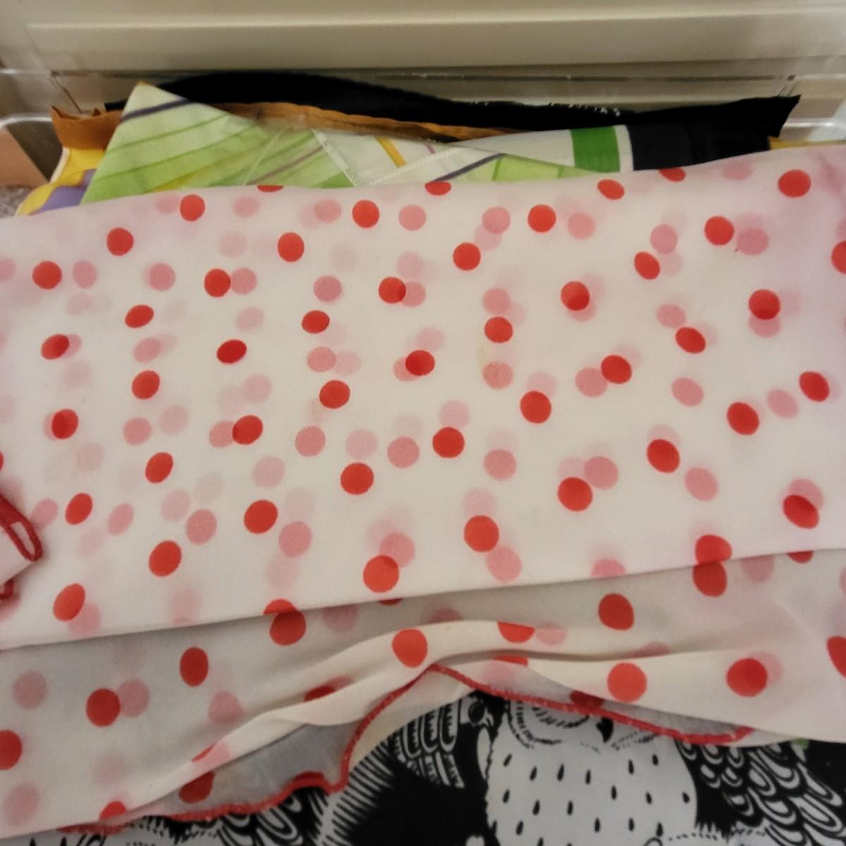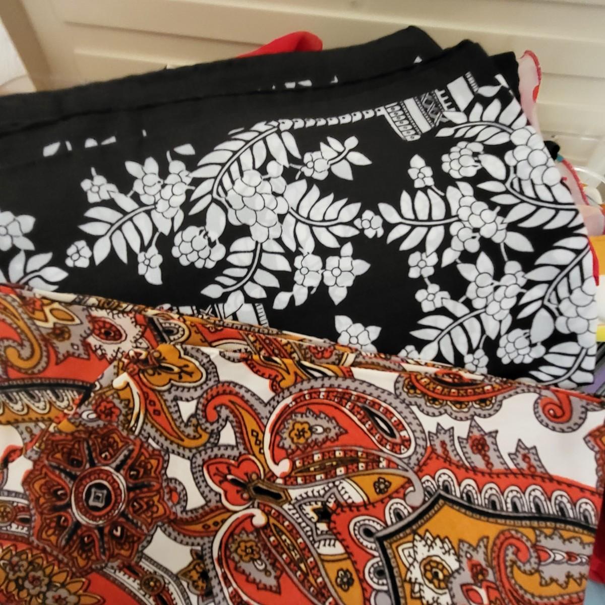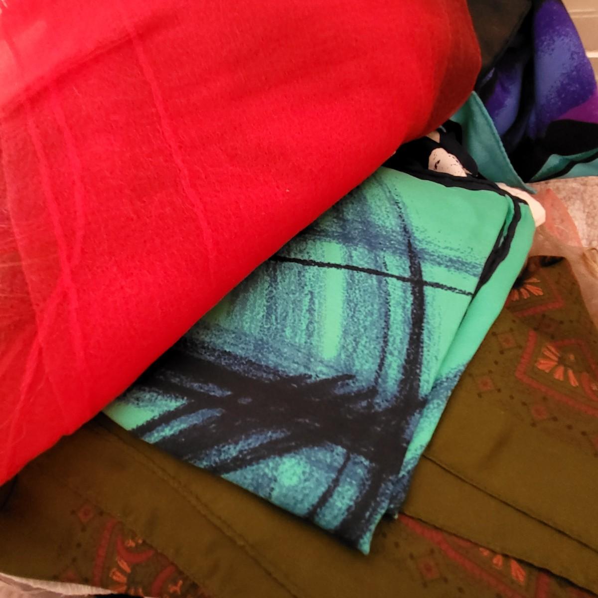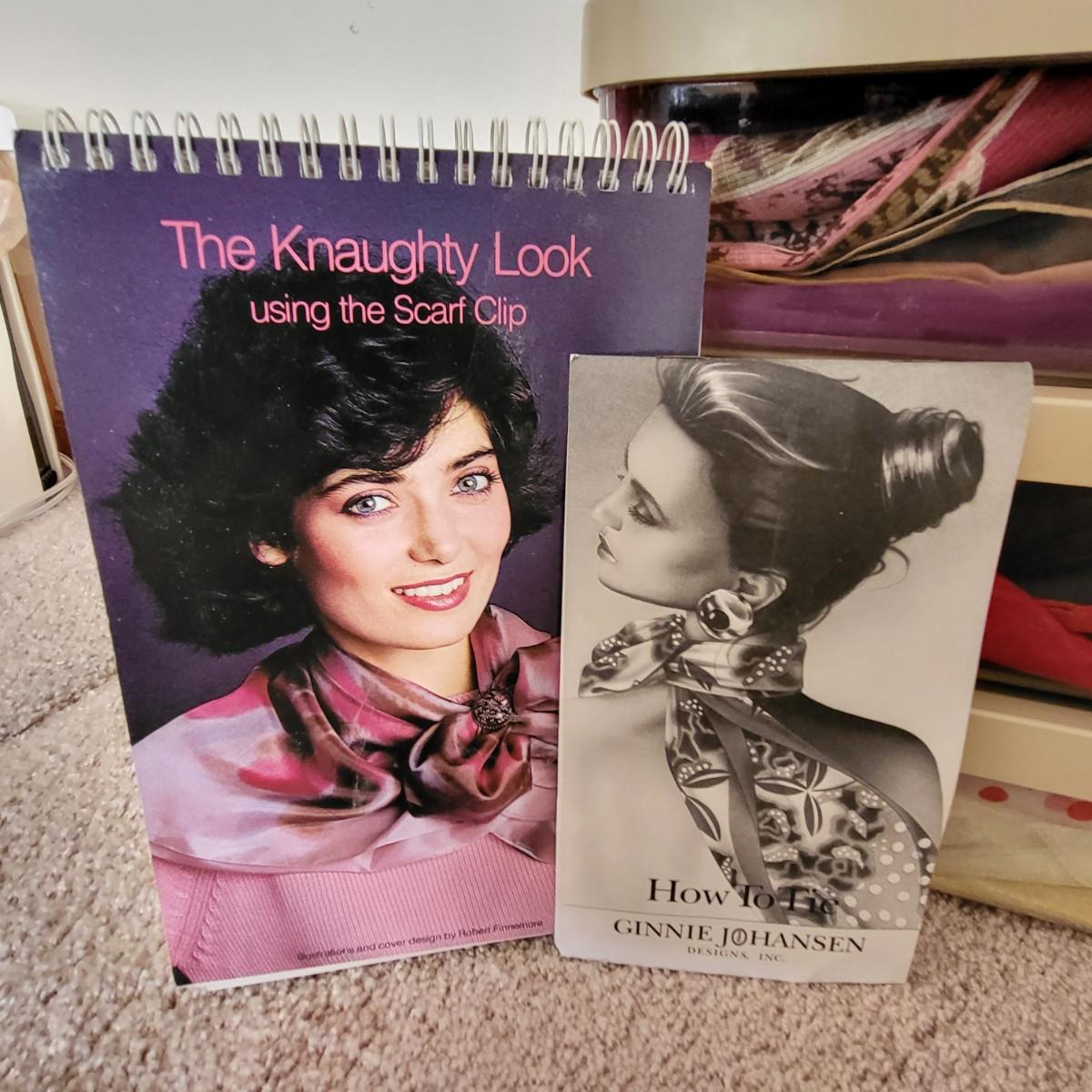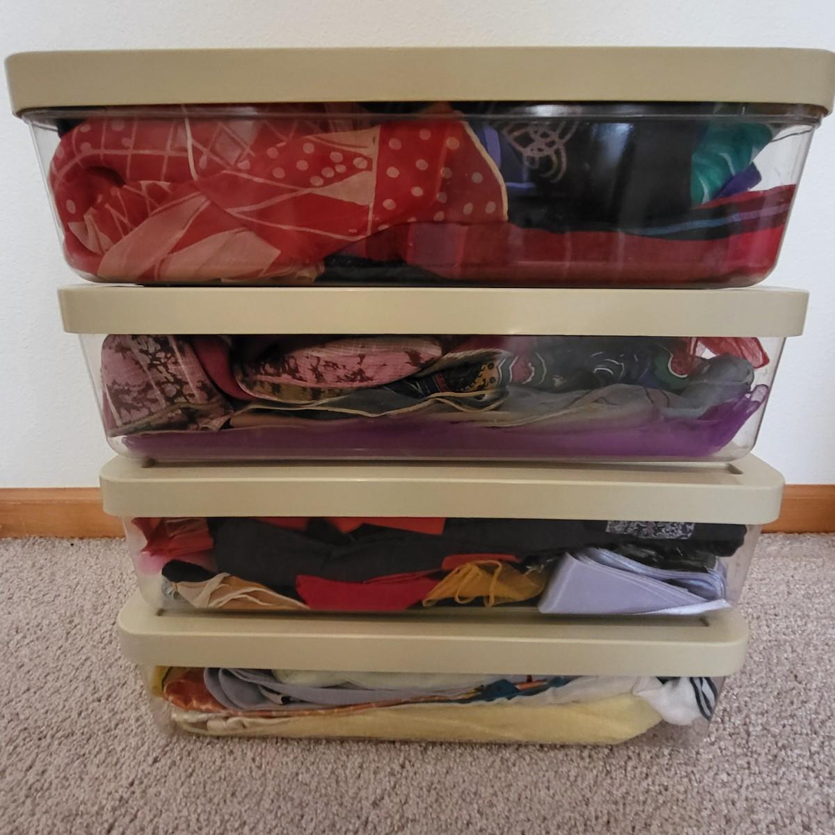 Silk, sheer, polyester and more. Huge variety of colors, styles and sizes. Four 12" x 10" lidded tubs filled with scarves. Comes with booklets on how to tie and use scarf clips.