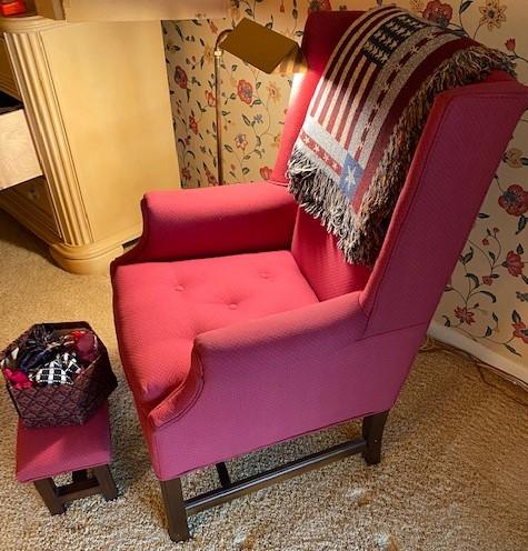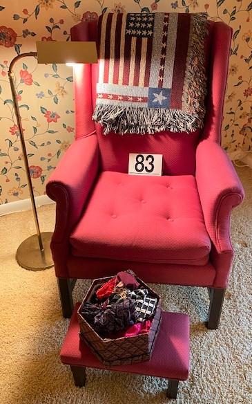 LOT#83: Master Accent Chair with Foot Stool, Floor Lamp & Blanket
