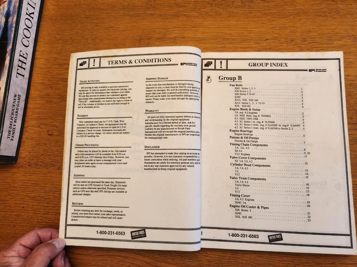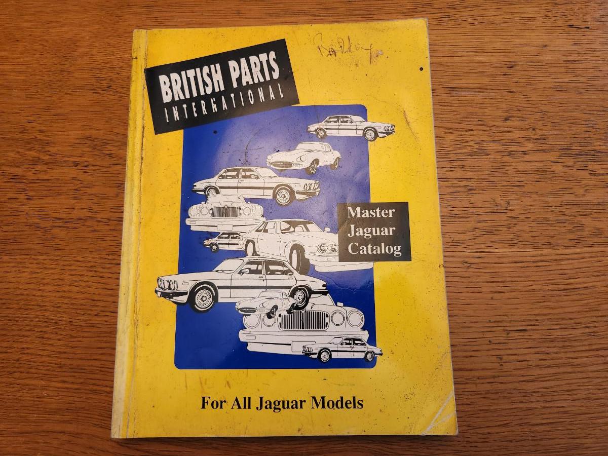 This auction lot is for automotive parts to repair most any Jaguar vehicle - a Master Jaguar Catalog. Parts were offered by British Parts International only to authorized dealers. No date, but catalog has a 1-800 number included. This book was used by a mechanic thus it hold some staining.