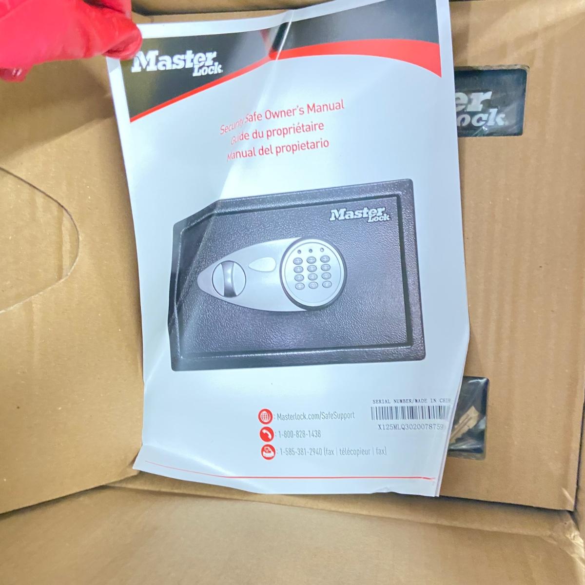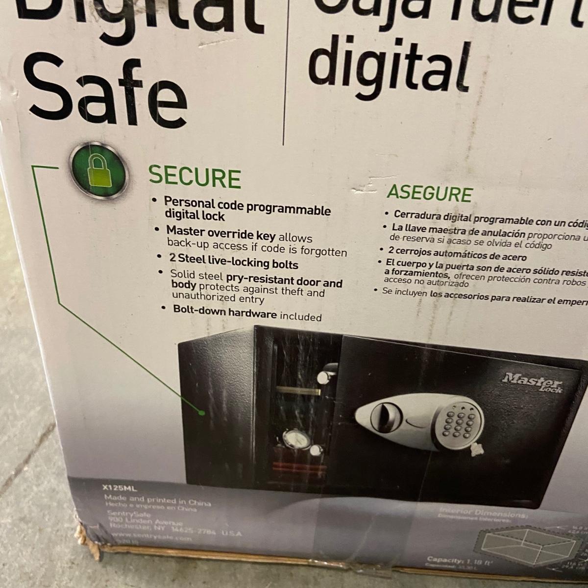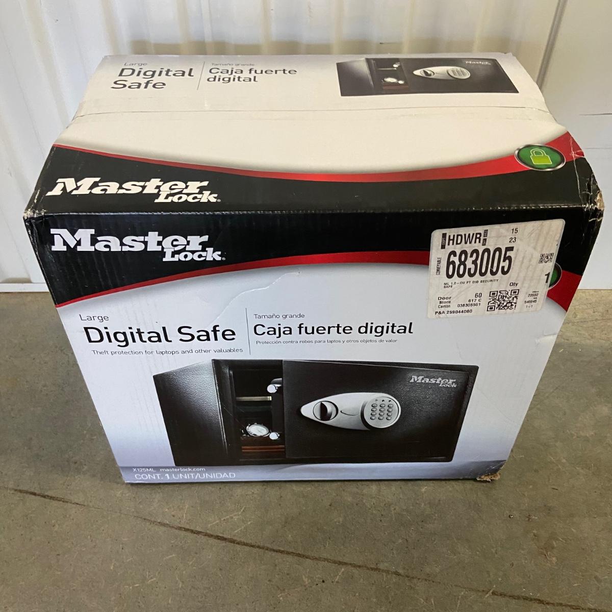 The lot contains a Master Lock large digital safe that is new in the box. It measures 16.5” x 11.5” x 10.5”H. It has two steel live locking bolts and a solid steel pry-resistant door. Shipping available.