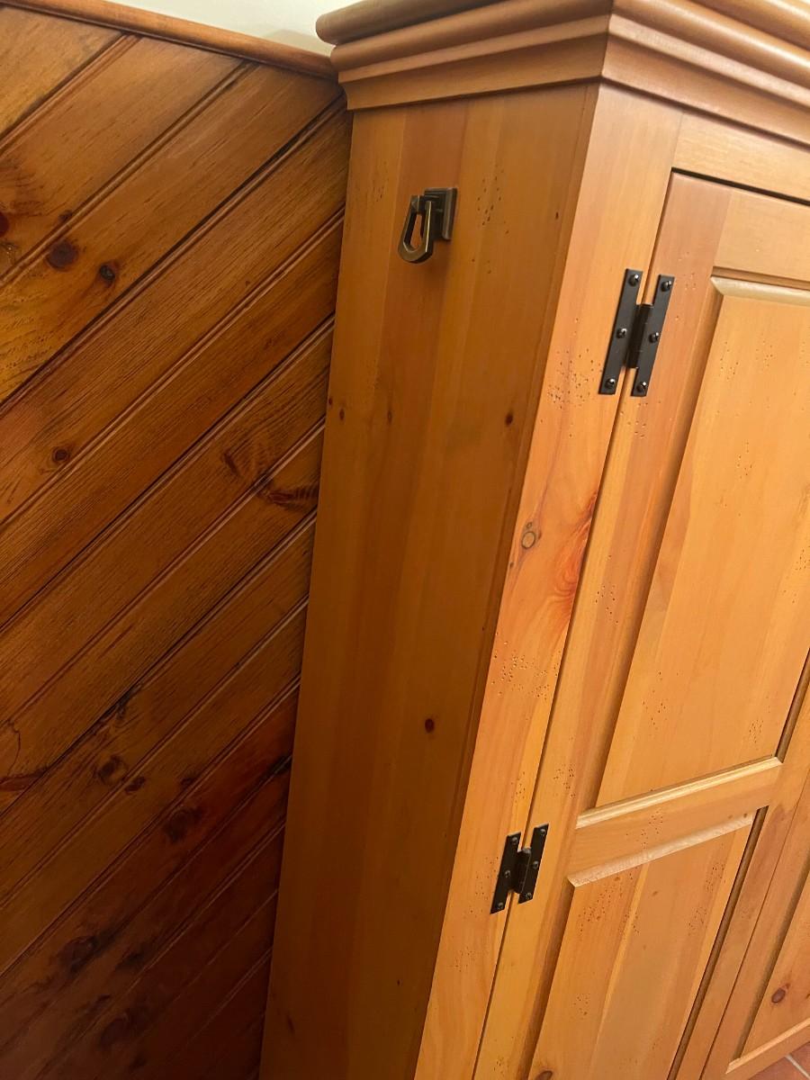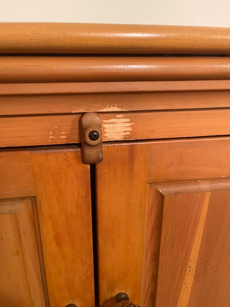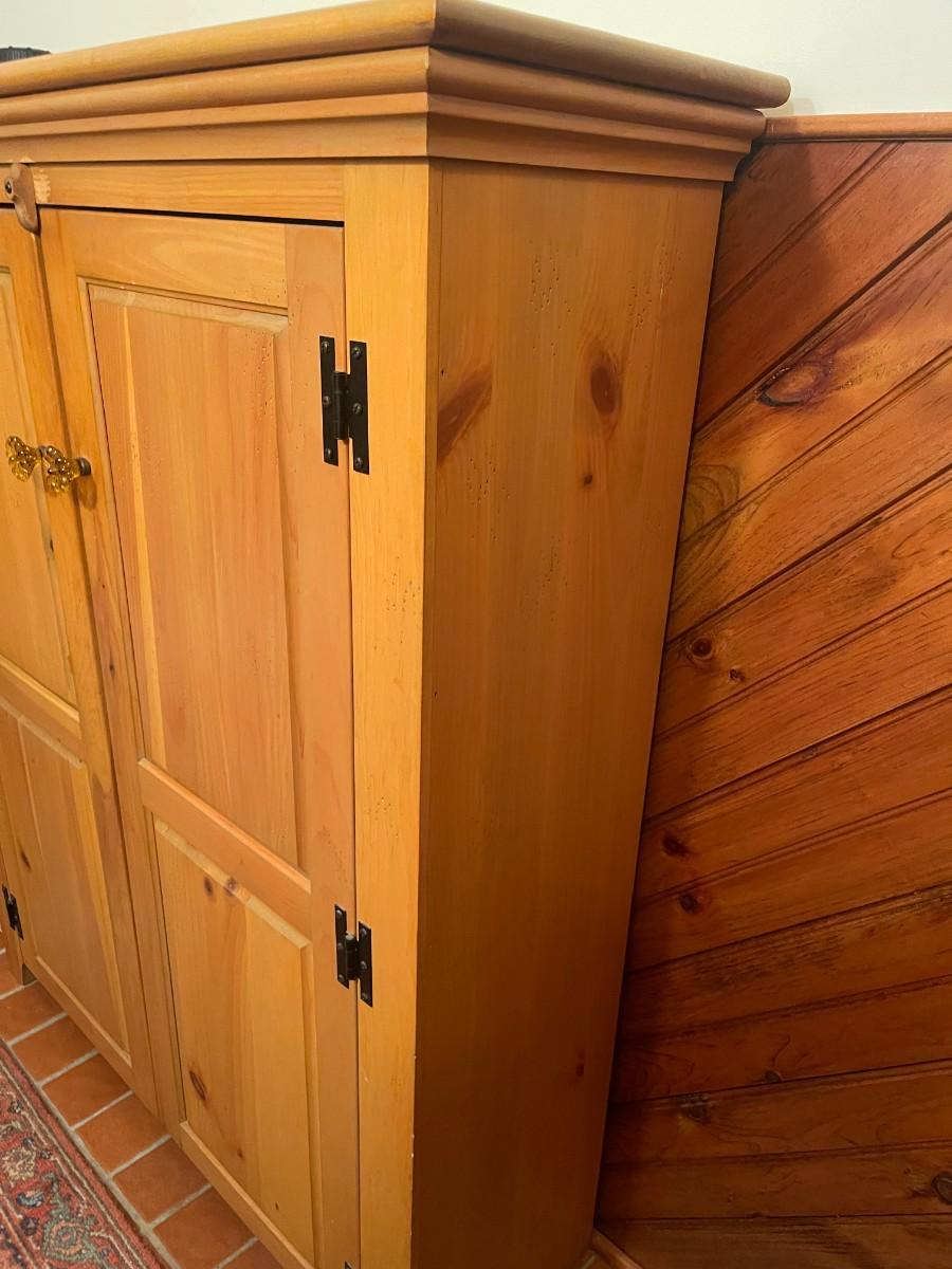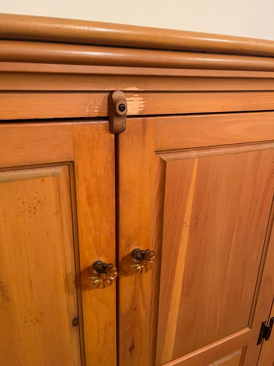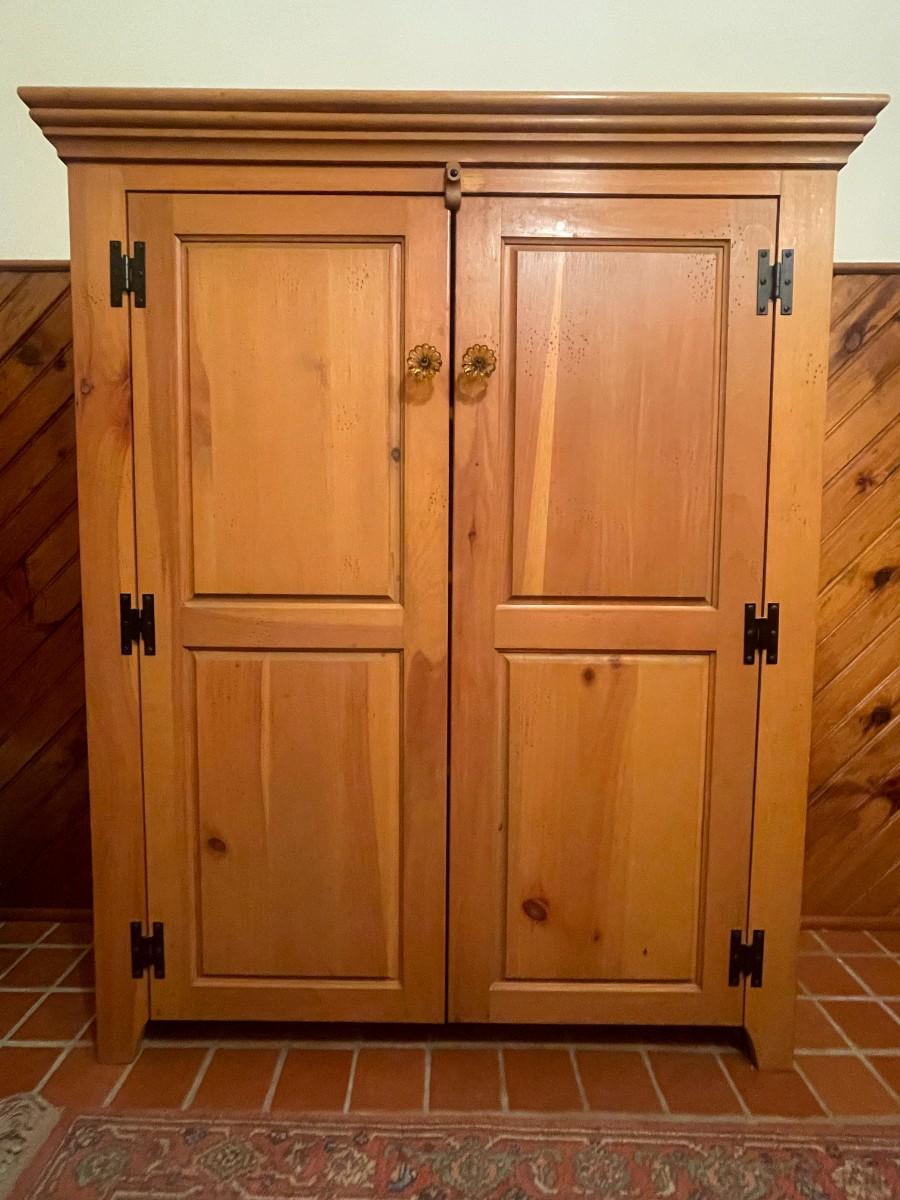 Mastercraft 2 door jelly cabinet. Very good condition with some minor scratching where the wooden latch rubs against the frame. 38 1/2" wide x 47" high x 13" deep.