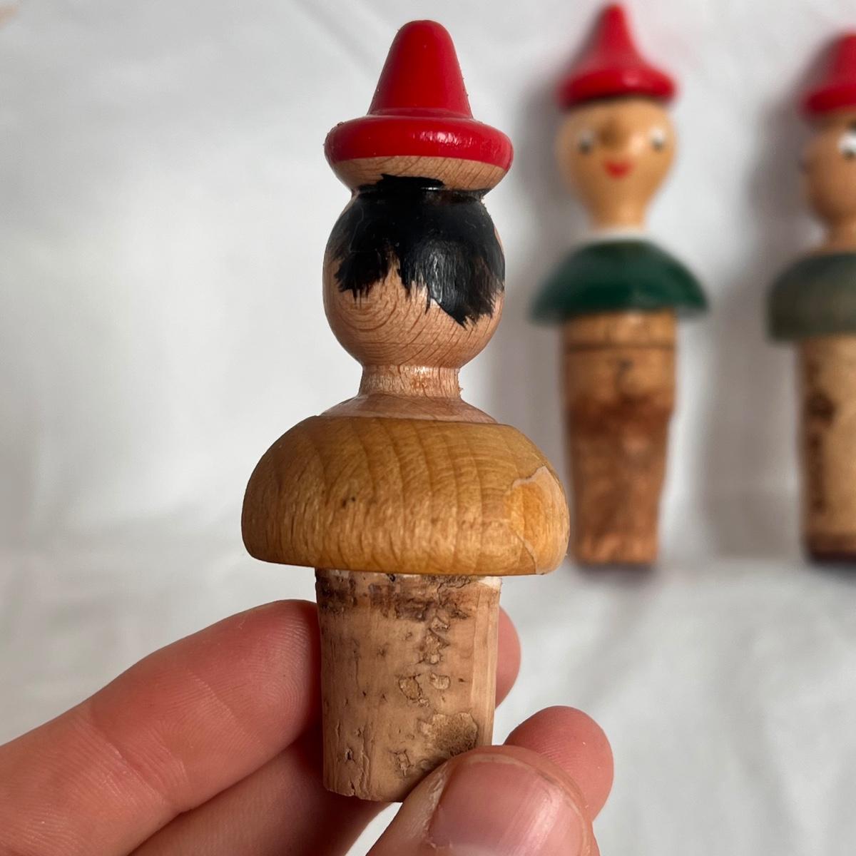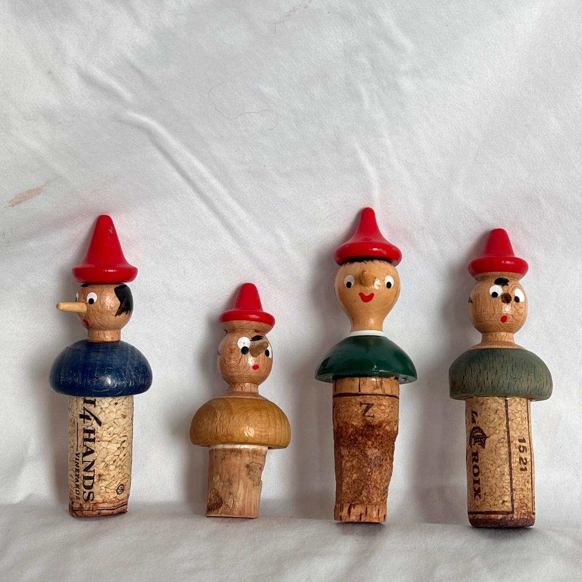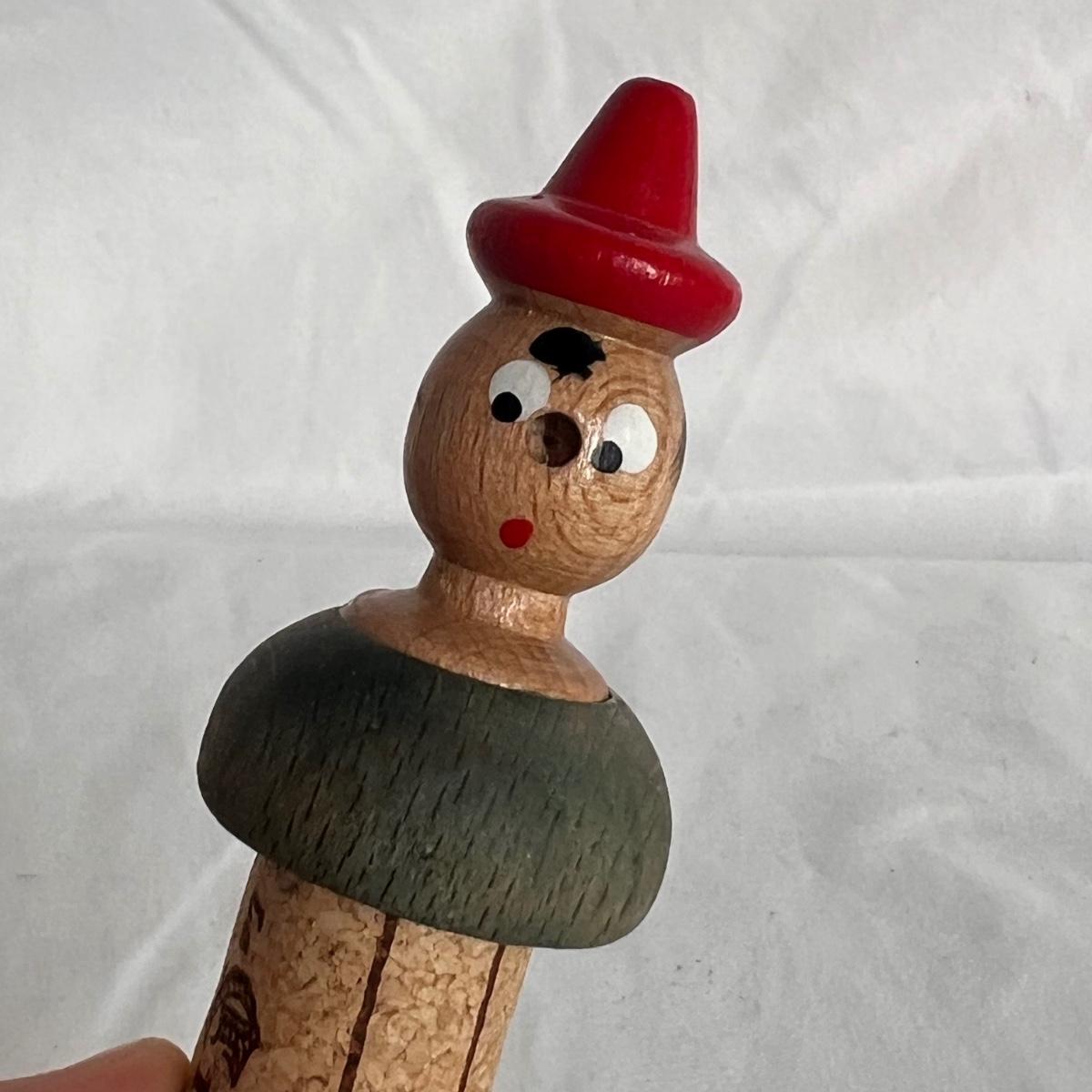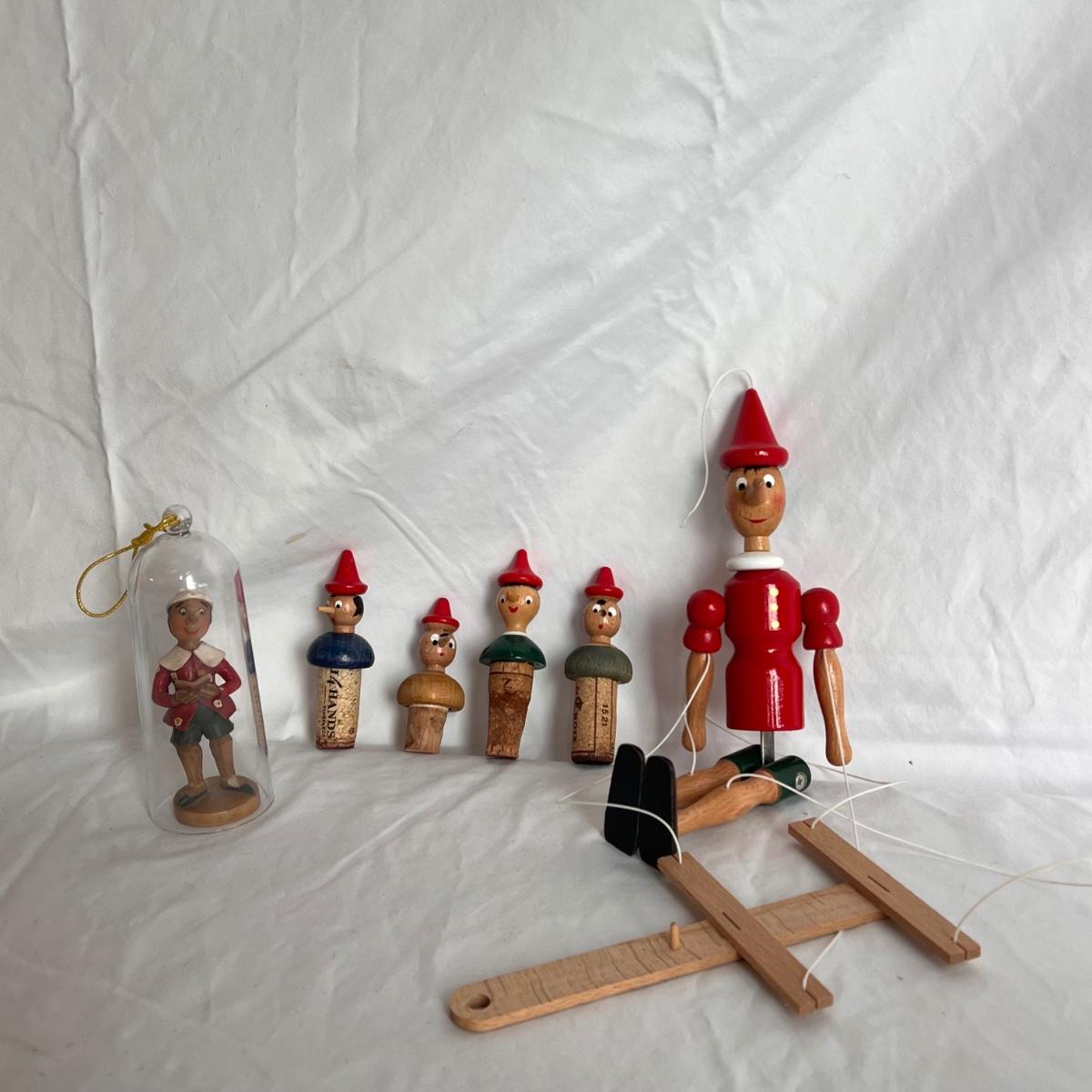 This lot includes one Mastro Geppetto handheld Pinocchio puppet, four Pinocchio wine bottle stoppers, and one small Pinocchio figurine with a glass covering. One of the Pinocchio bottle stoppers is missing his nose (he must be honest!) - see picture included. The Pinocchio figurine has a glass covering that is easily removable. Each Pinocchio piece is made out of wood. The puppet is the largest piece measuring 3” x 1” x 9”H. Shipping available.
