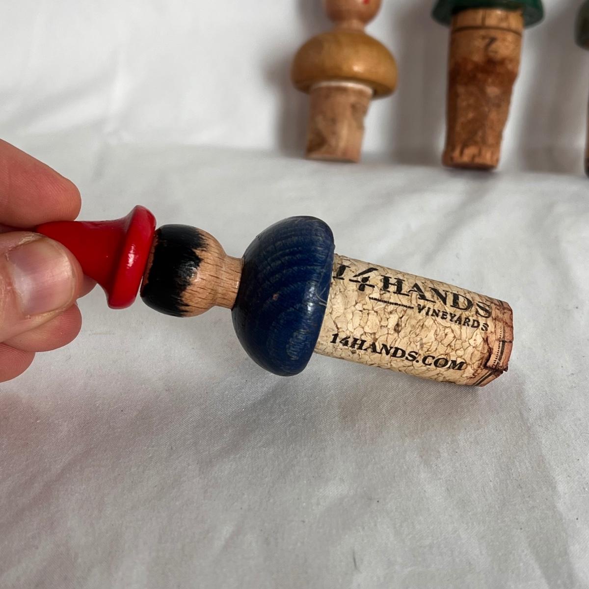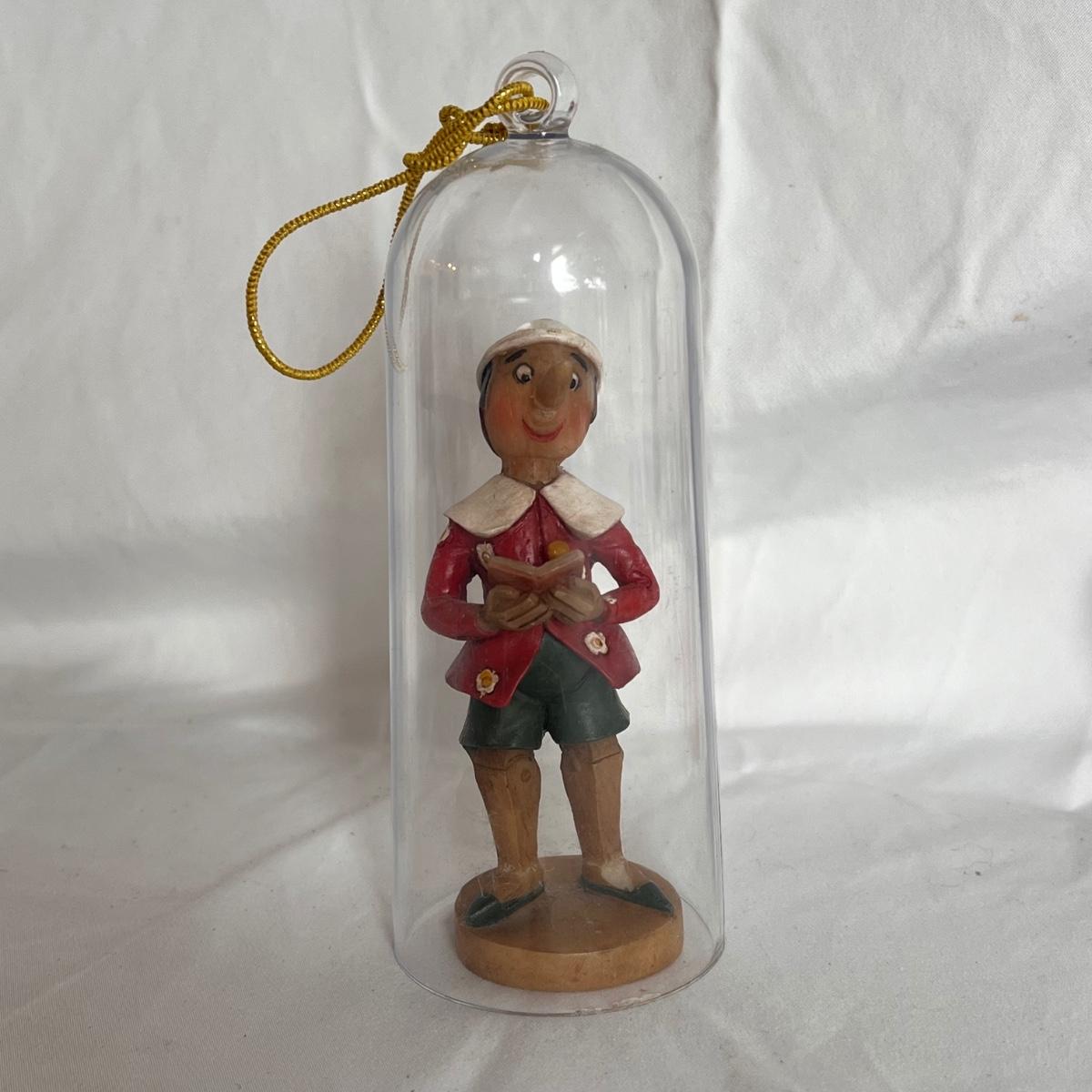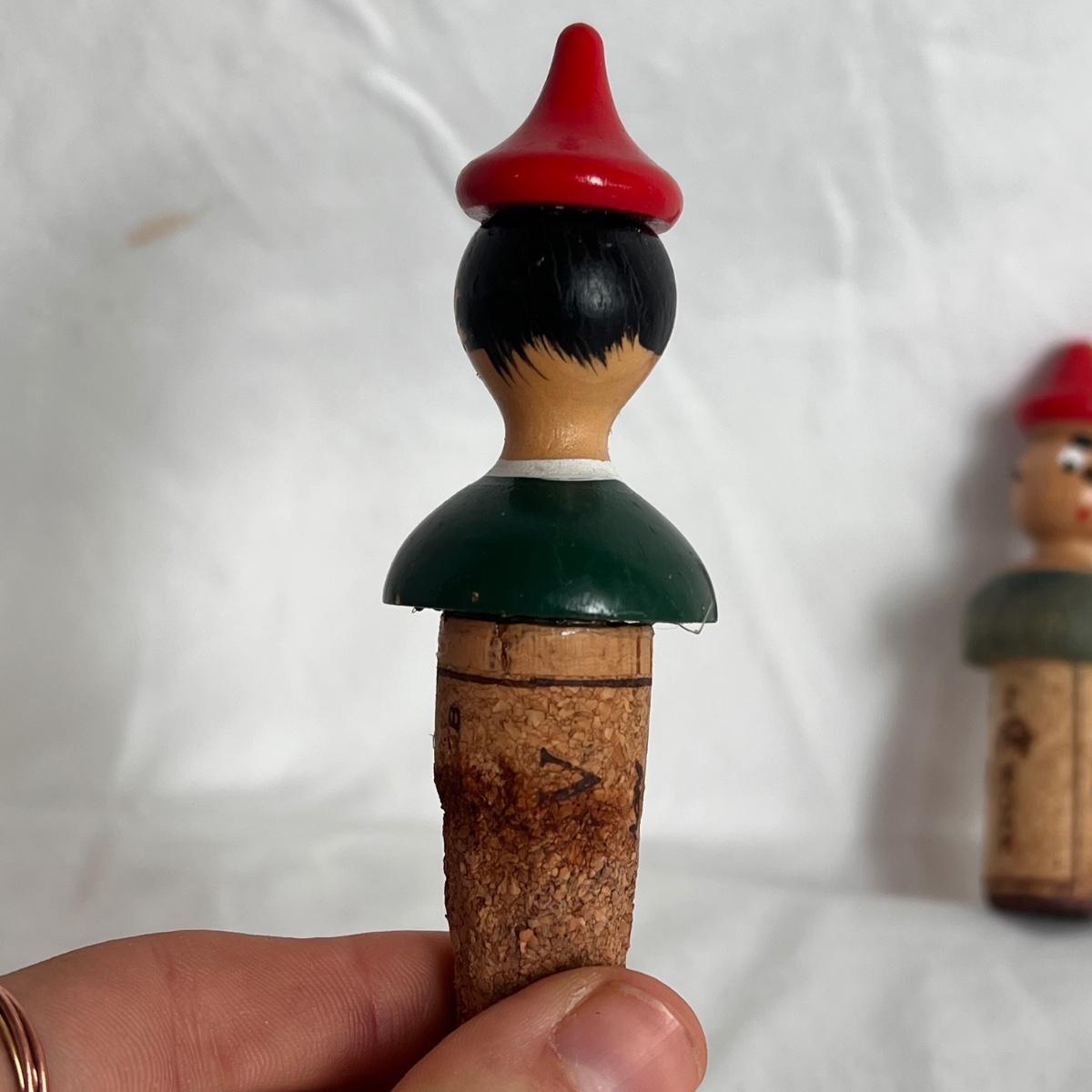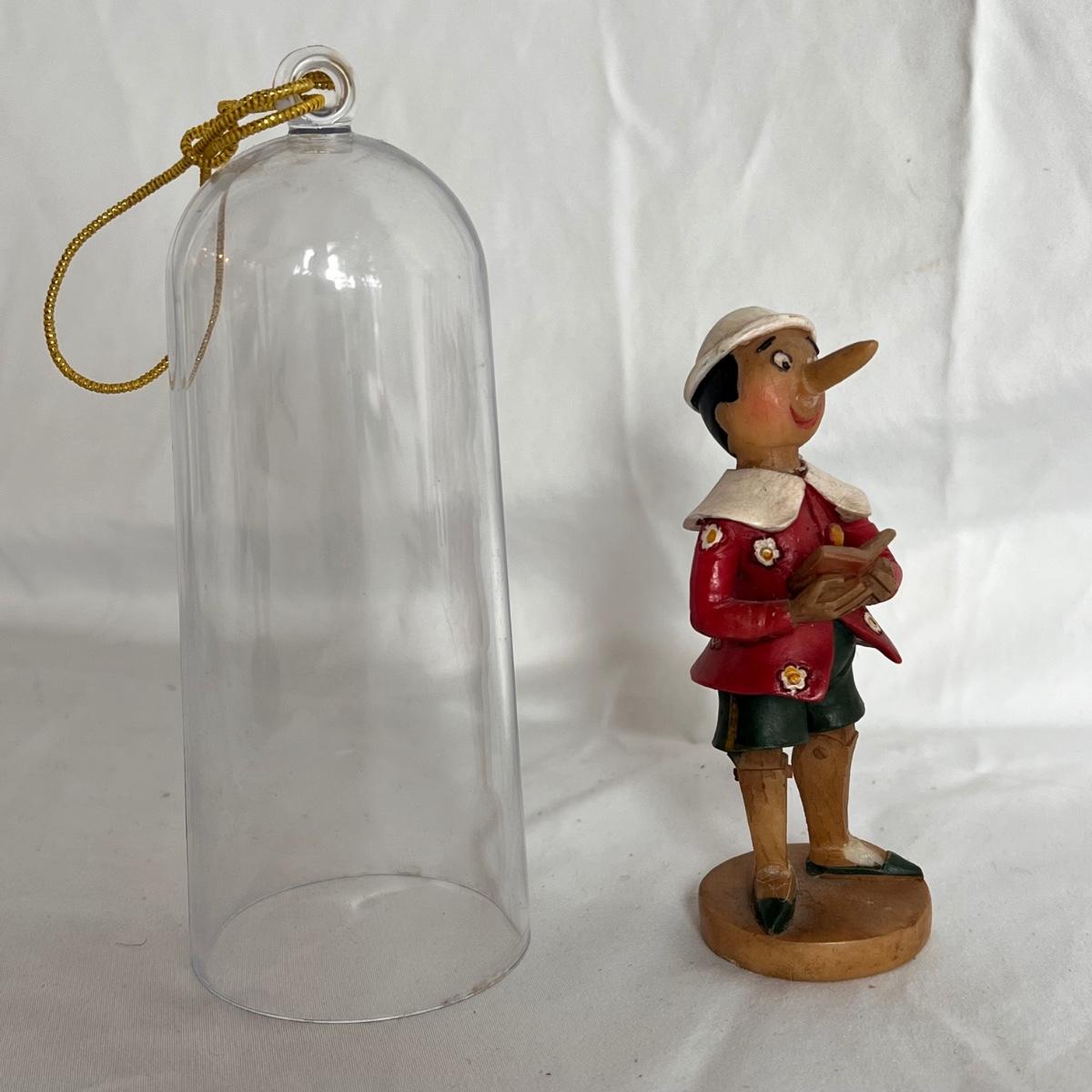 This lot includes one Mastro Geppetto handheld Pinocchio puppet, four Pinocchio wine bottle stoppers, and one small Pinocchio figurine with a glass covering. One of the Pinocchio bottle stoppers is missing his nose (he must be honest!) - see picture included. The Pinocchio figurine has a glass covering that is easily removable. Each Pinocchio piece is made out of wood. The puppet is the largest piece measuring 3” x 1” x 9”H. Shipping available.